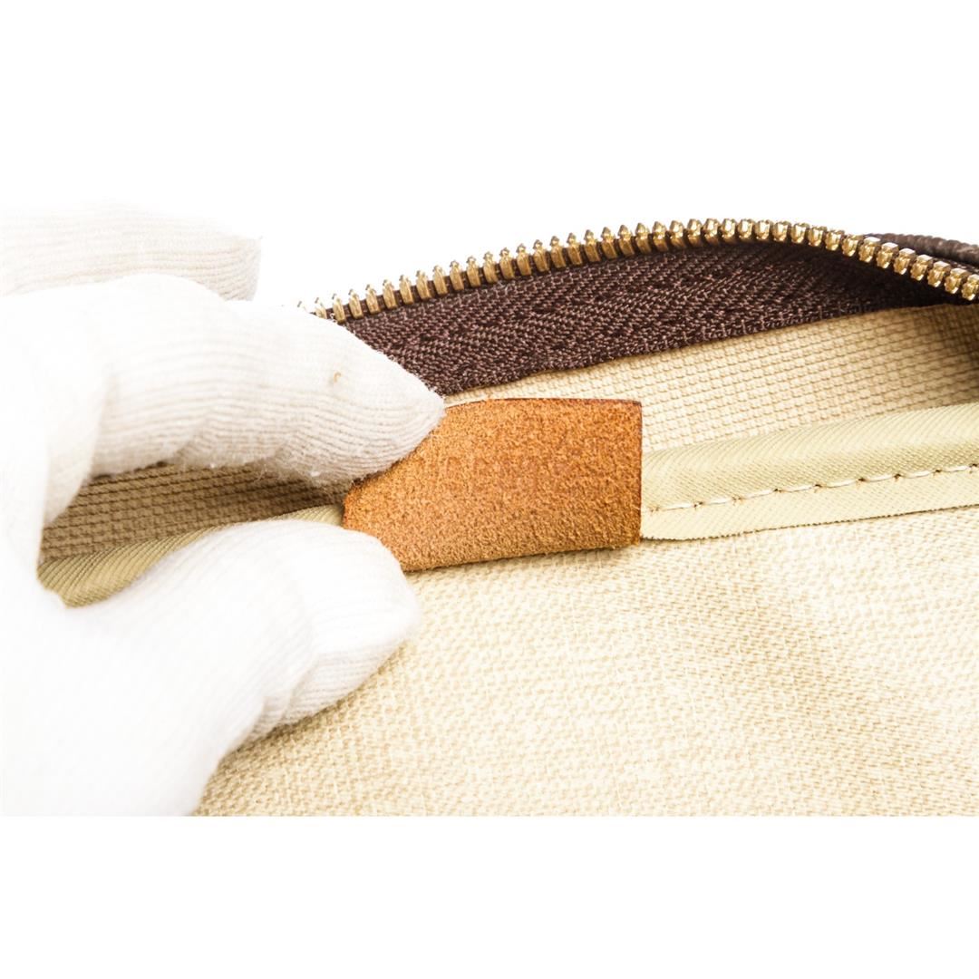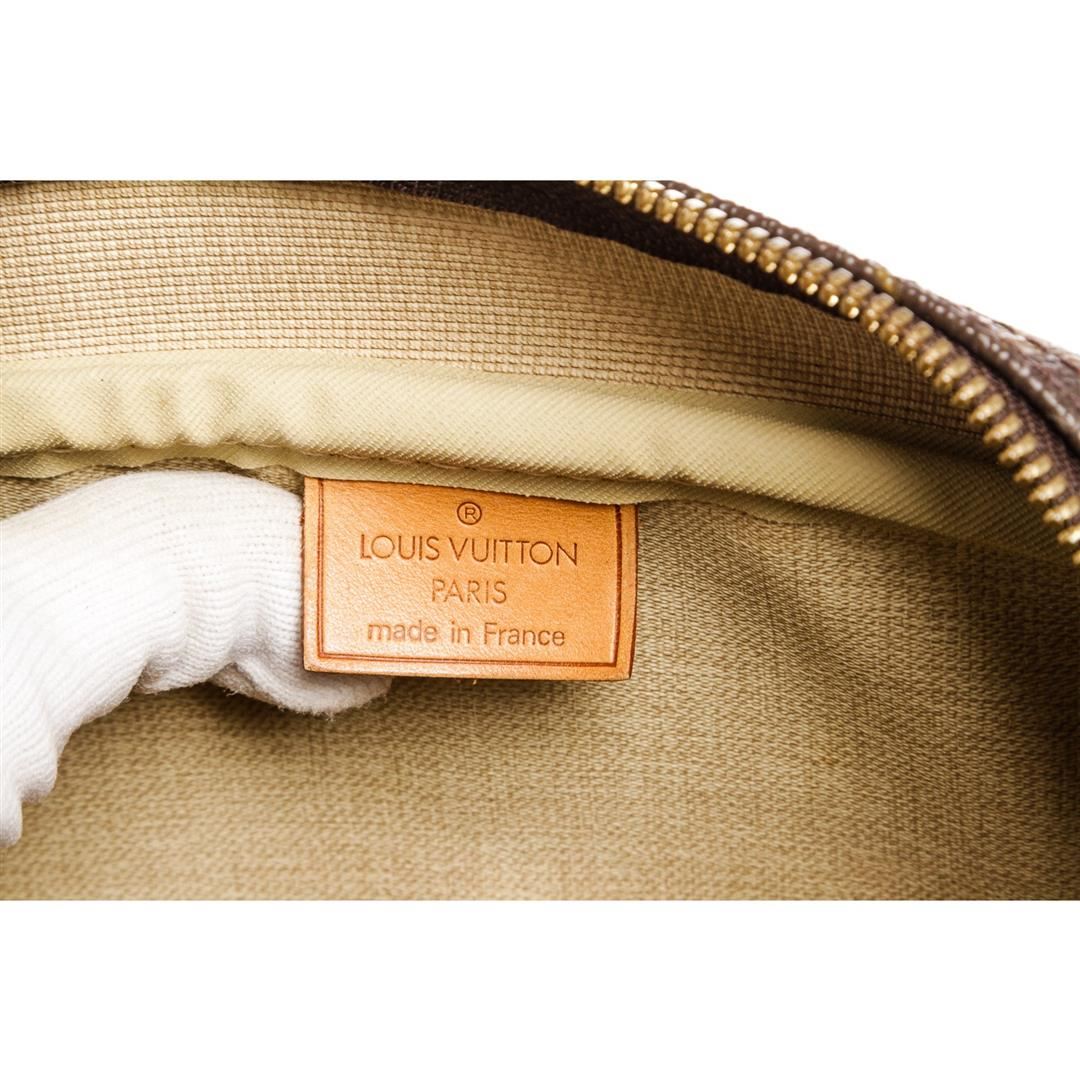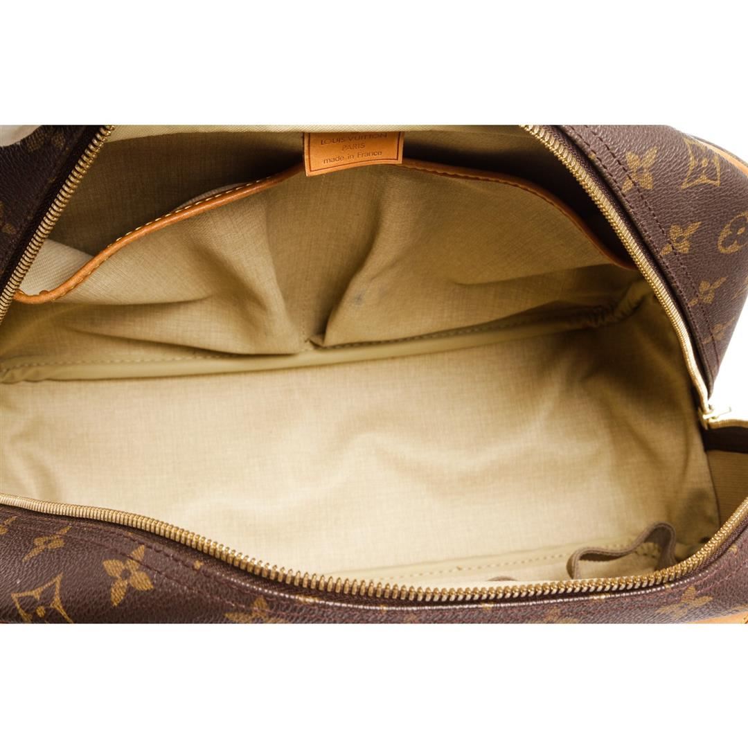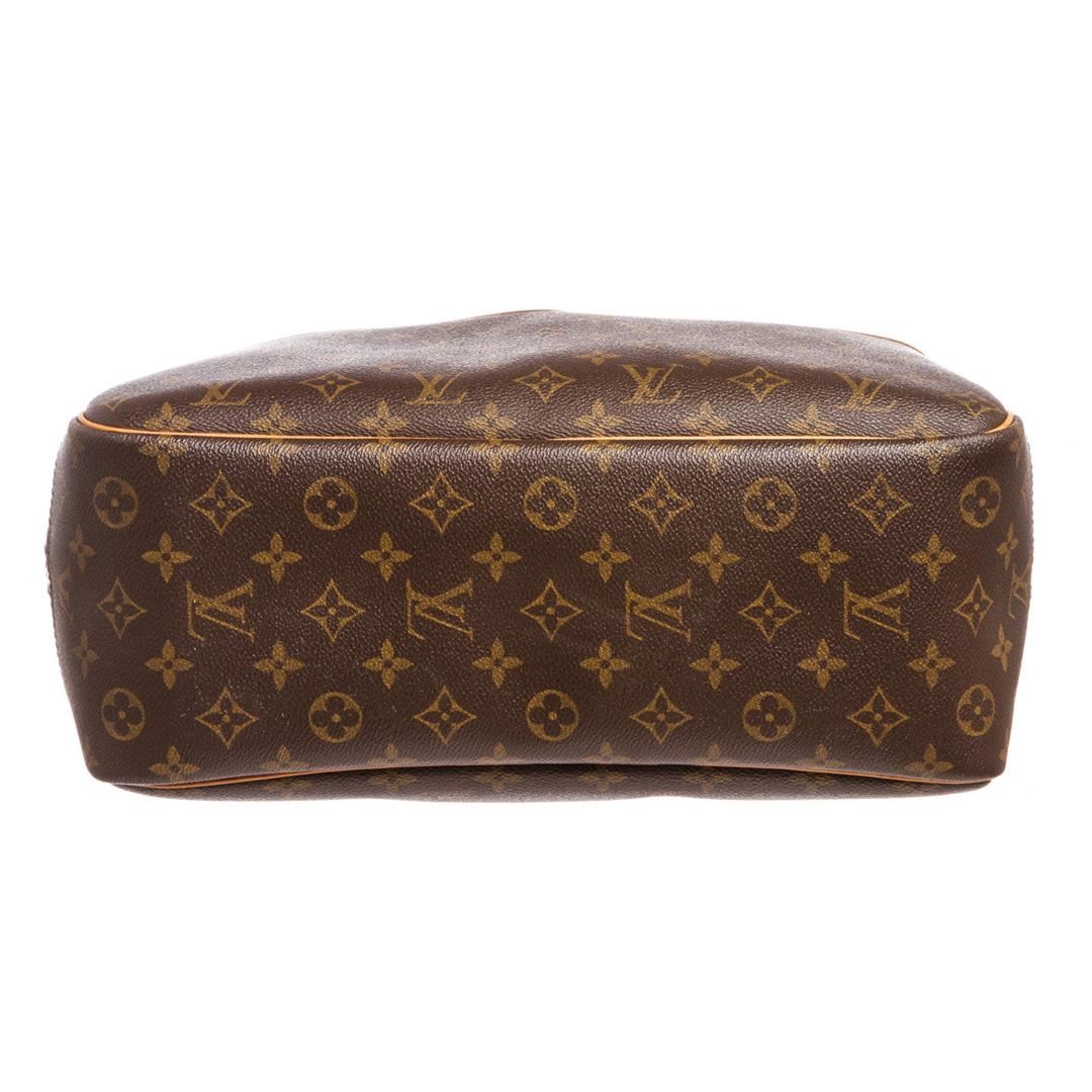 Brown and tan monogram coated canvas Louis Vuitton Deauville Bag with brass hardware, tan vachetta leather lining, dual rolled handles, single open compartment at exterior front, creme canvas lining, four open pockets at interior wall and two-way zip clos
