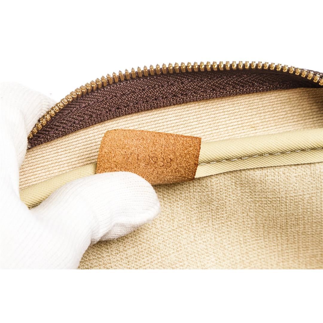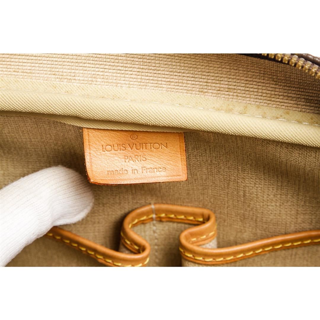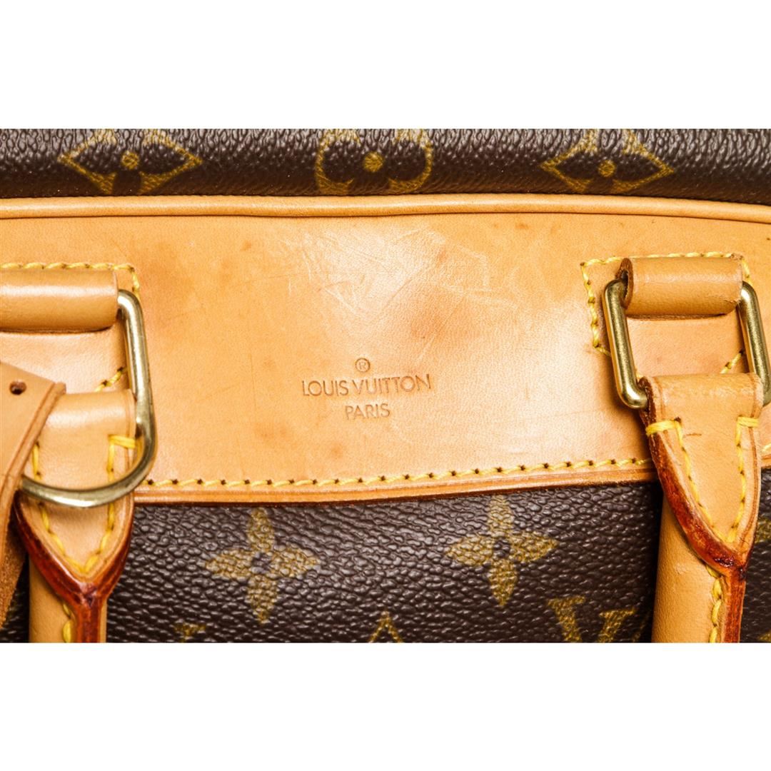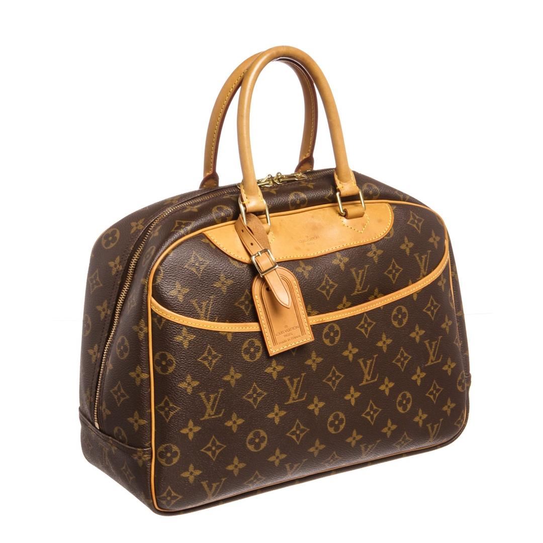 Brown and tan monogram coated canvas Louis Vuitton Deauville Bag with brass hardware, tan vachetta leather lining, dual rolled handles, single open compartment at exterior front, creme canvas lining, four open pockets at interior wall and two-way zip clos