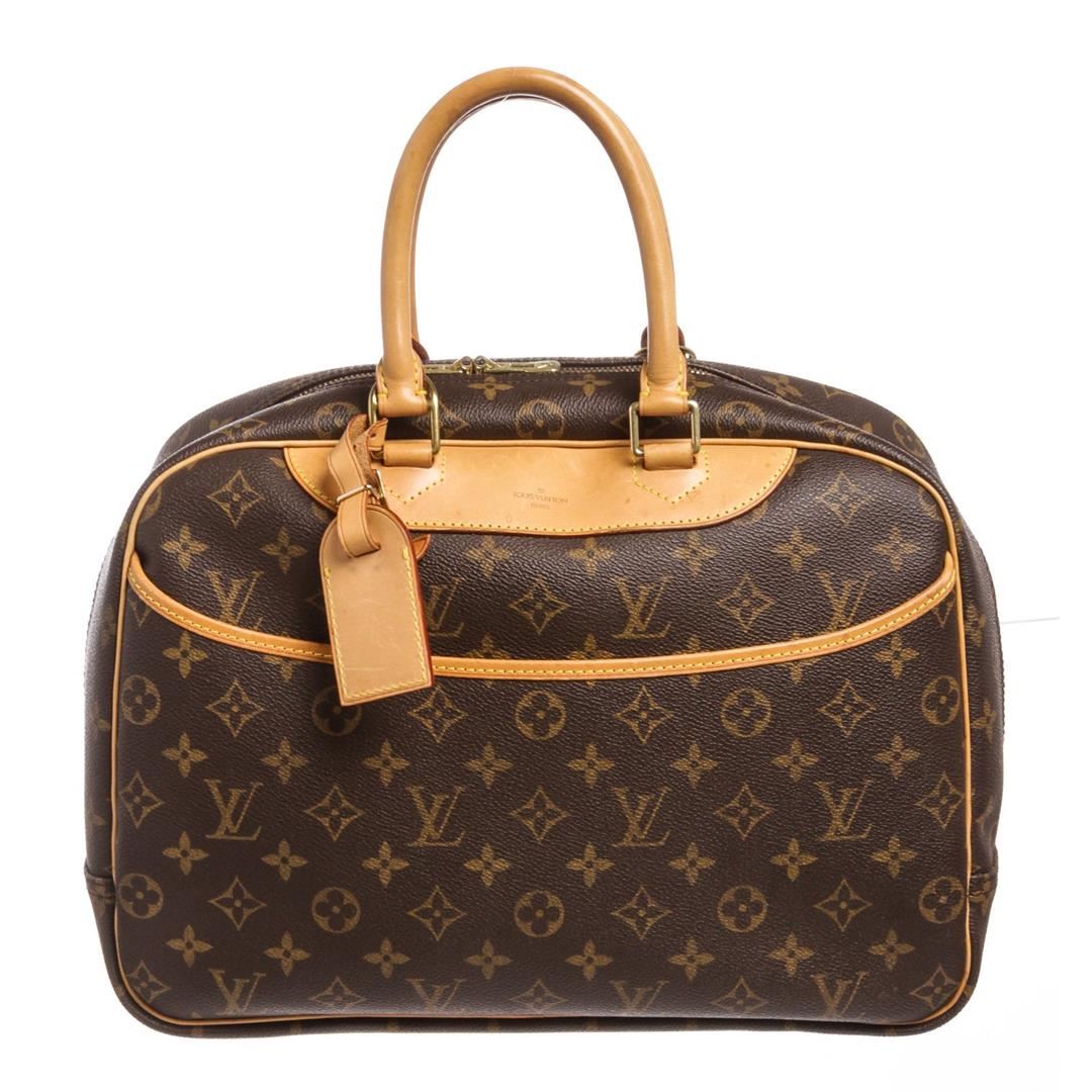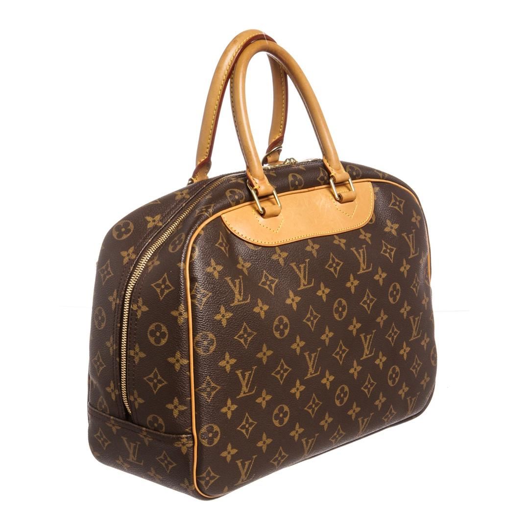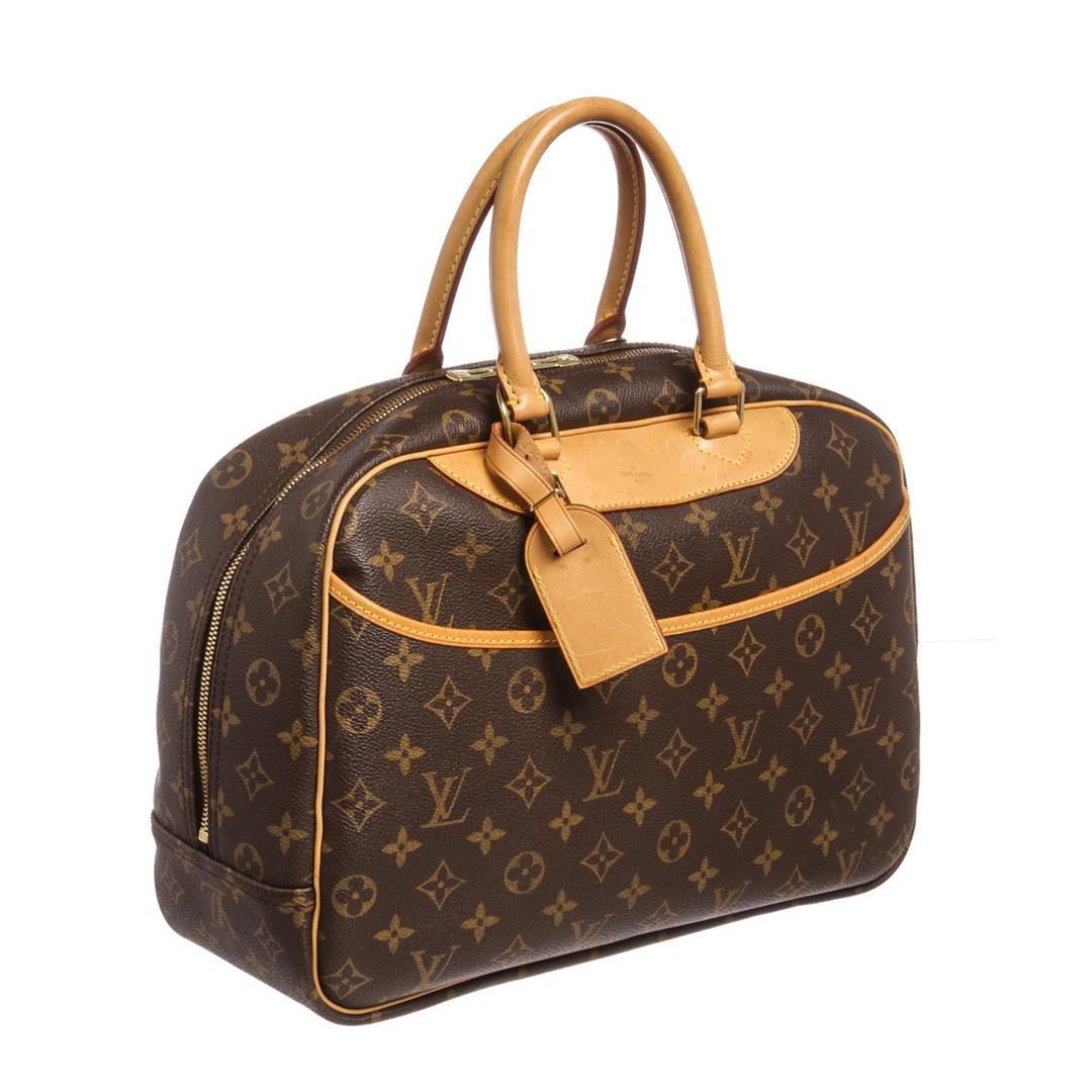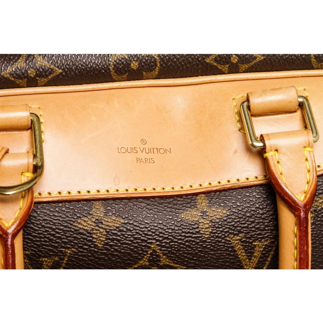 Brown and tan monogram coated canvas Louis Vuitton Deauville Bag with brass hardware, tan vachetta leather lining, dual rolled handles, single open compartment at exterior front, creme canvas lining, four open pockets at interior wall and two-way zip clos