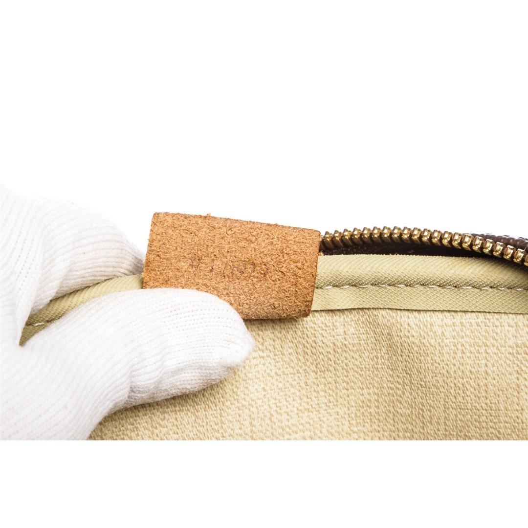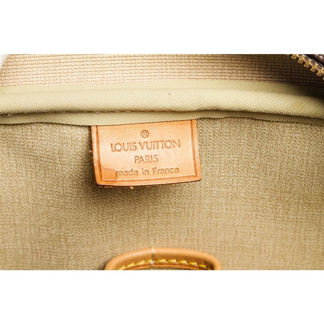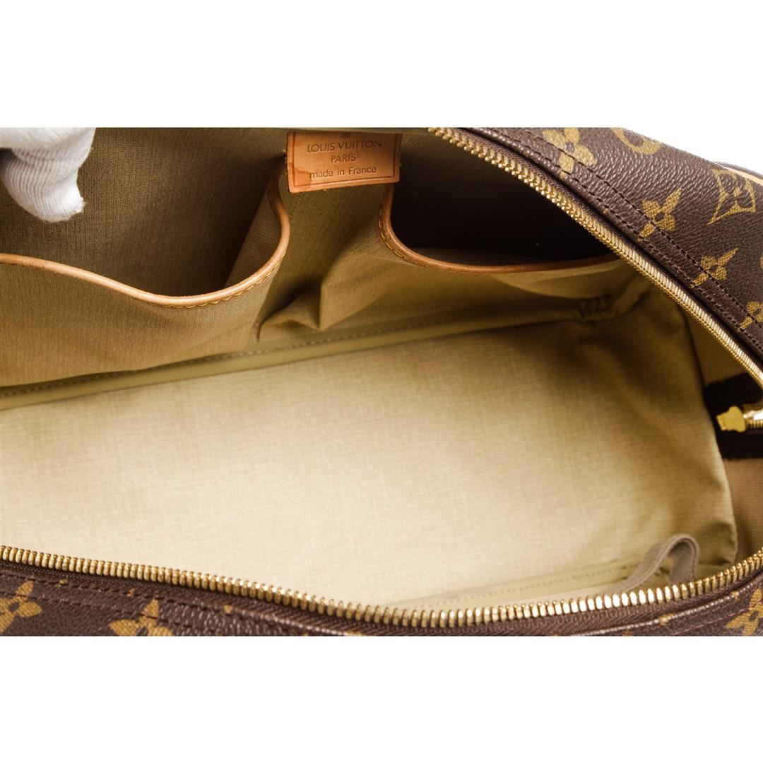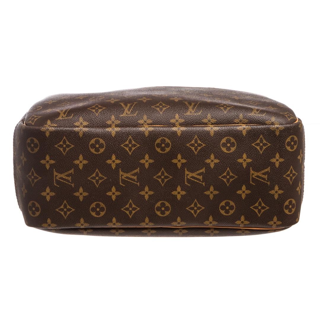 Brown and tan monogram coated canvas Louis Vuitton Deauville Bag with brass hardware, tan vachetta leather lining, dual rolled handles, single open compartment at exterior front, creme canvas lining, four open pockets at interior wall and two-way zip clos