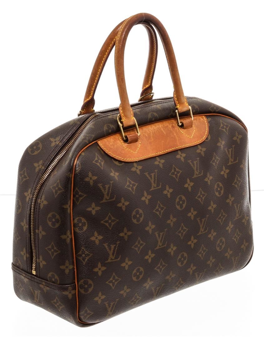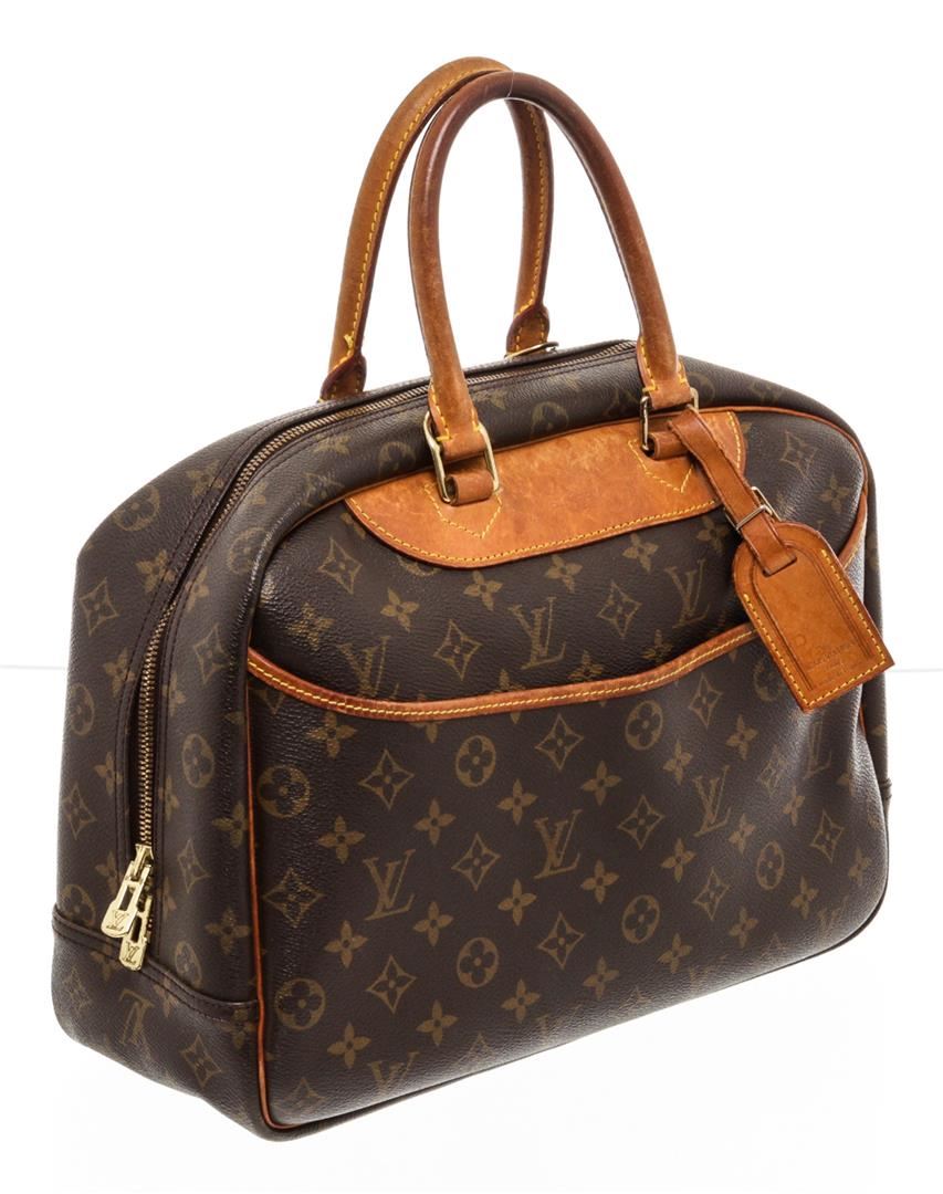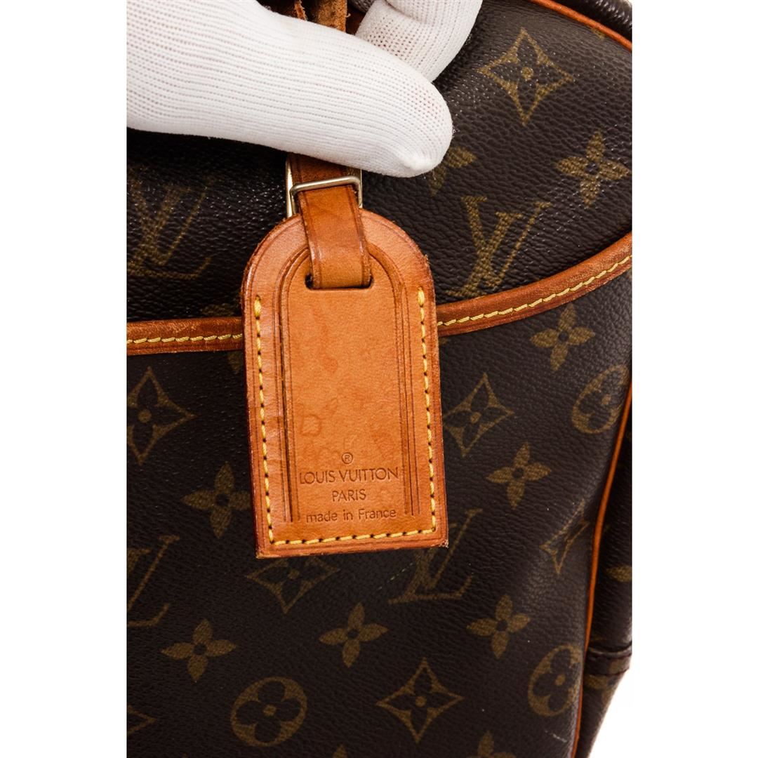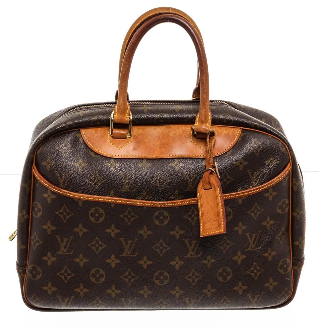 Brown and tan monogram coated canvas Louis Vuitton Deauville Bag with brass hardware, tan vachetta leather lining, dual rolled handles, single open compartment at exterior front, creme canvas lining, four open pockets at interior wall and two-way zip closures at top.