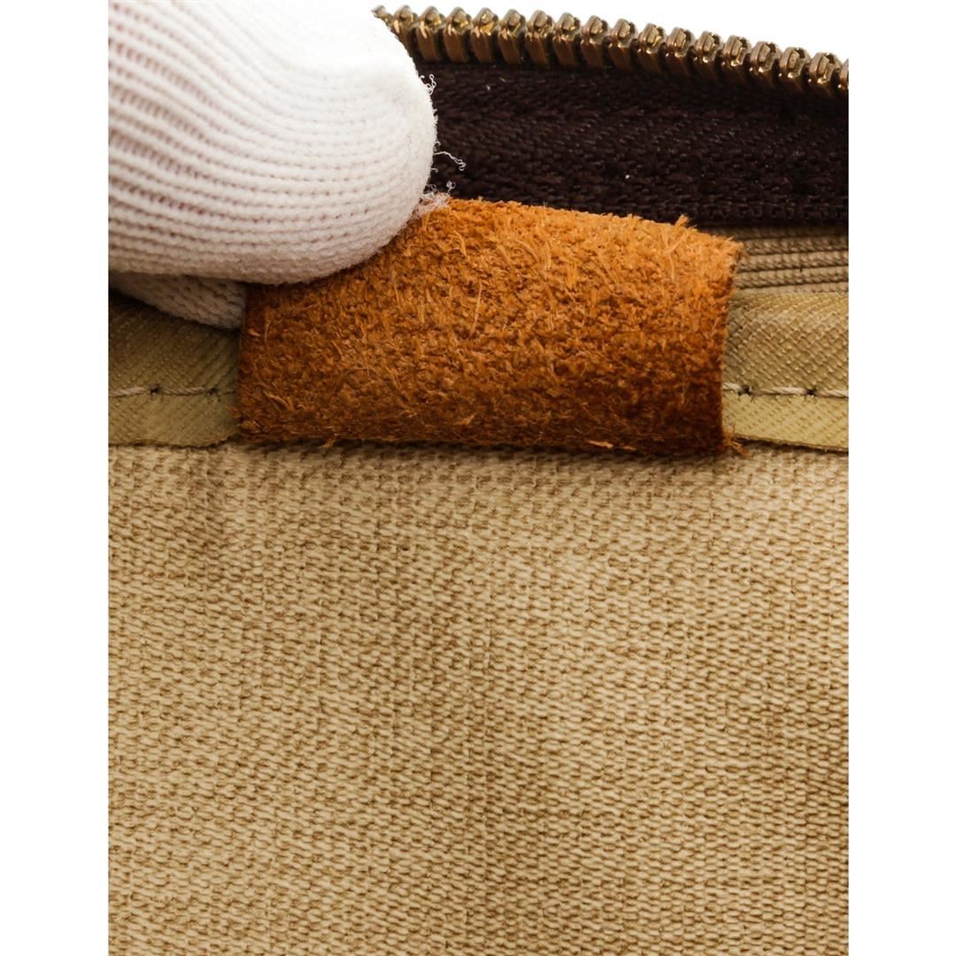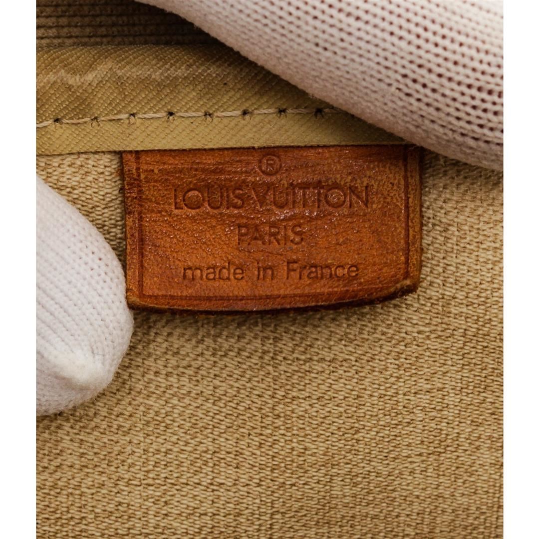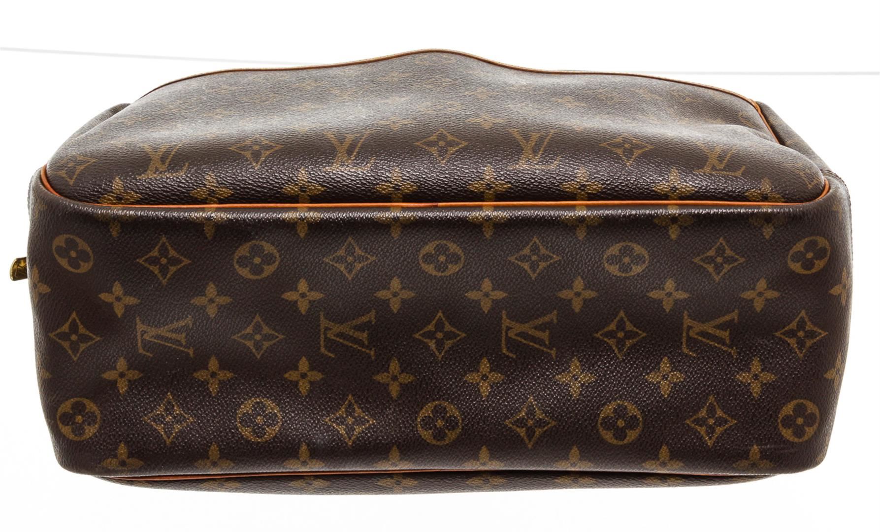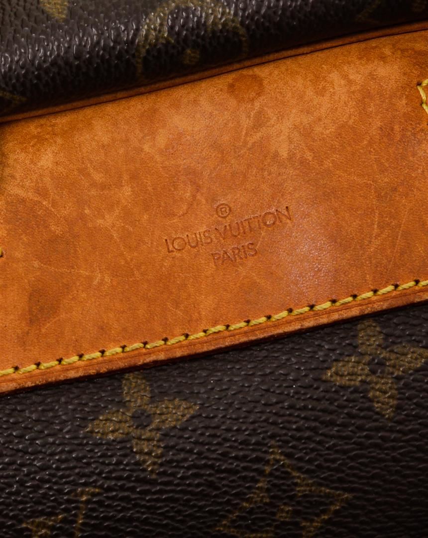 Brown and tan monogram coated canvas Louis Vuitton Deauville Bag with brass hardware, tan vachetta leather lining, dual rolled handles, single open compartment at exterior front, creme canvas lining, four open pockets at interior wall and two-way zip closures at top.