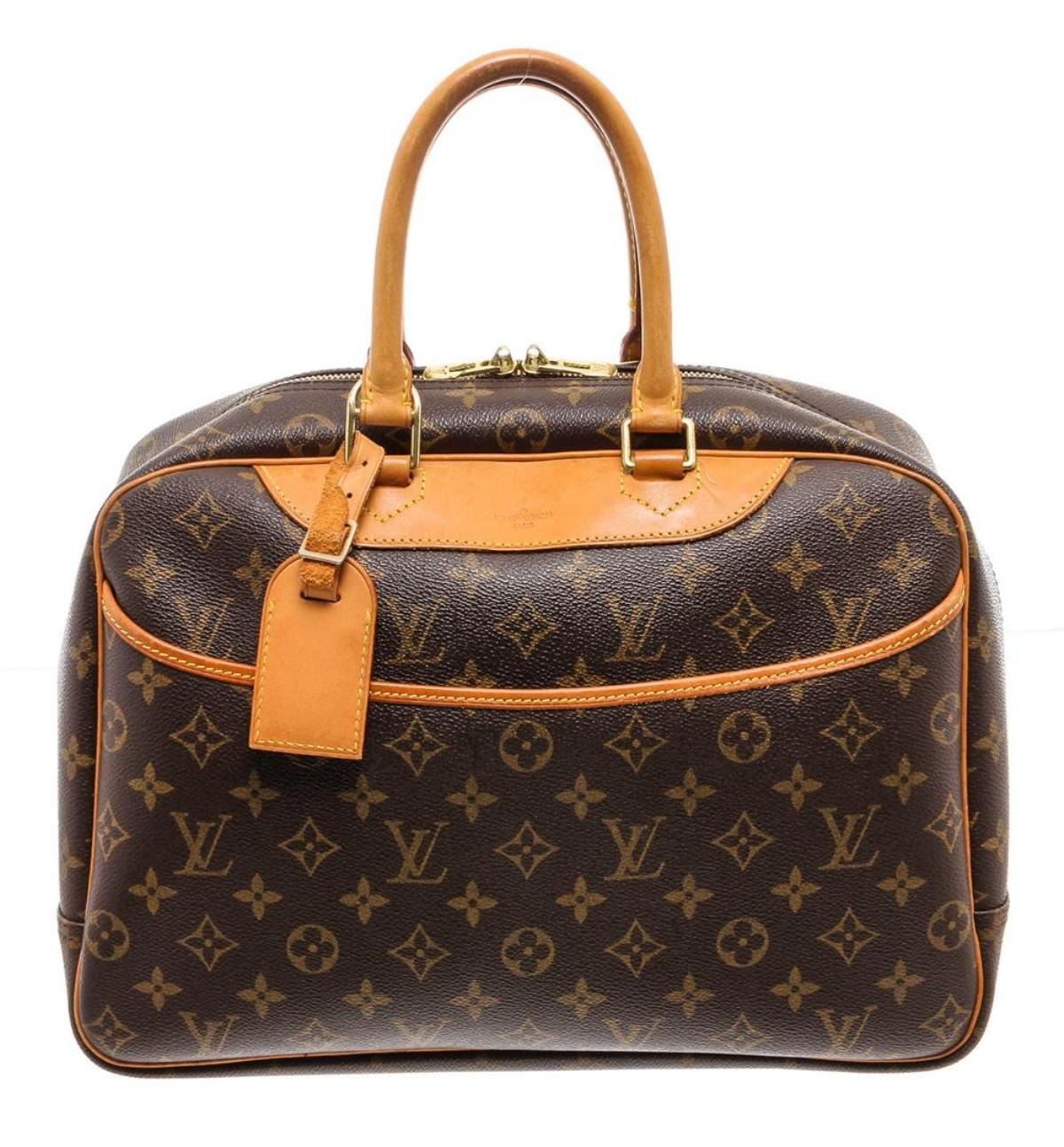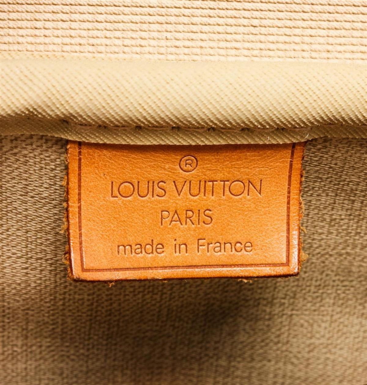 One Louis Vuitton Monogram Canvas Leather Deauville Doctor Bag. Brown and tan monogram coated canvas Louis Vuitton Deauville Bag with brass hardware, tan vachetta leather lining, dual rolled handles, single open compartment at exterior front, creme canvas lining, four open pockets at interior wall and two-way zip closures at top.