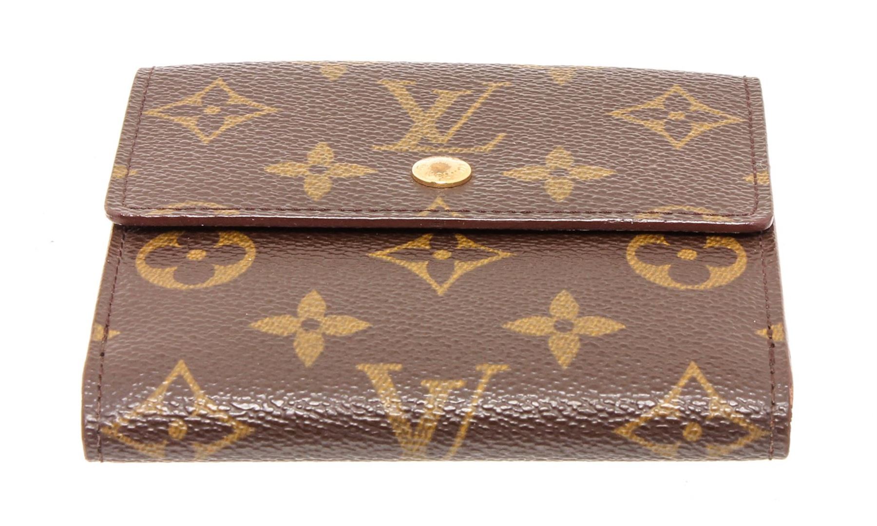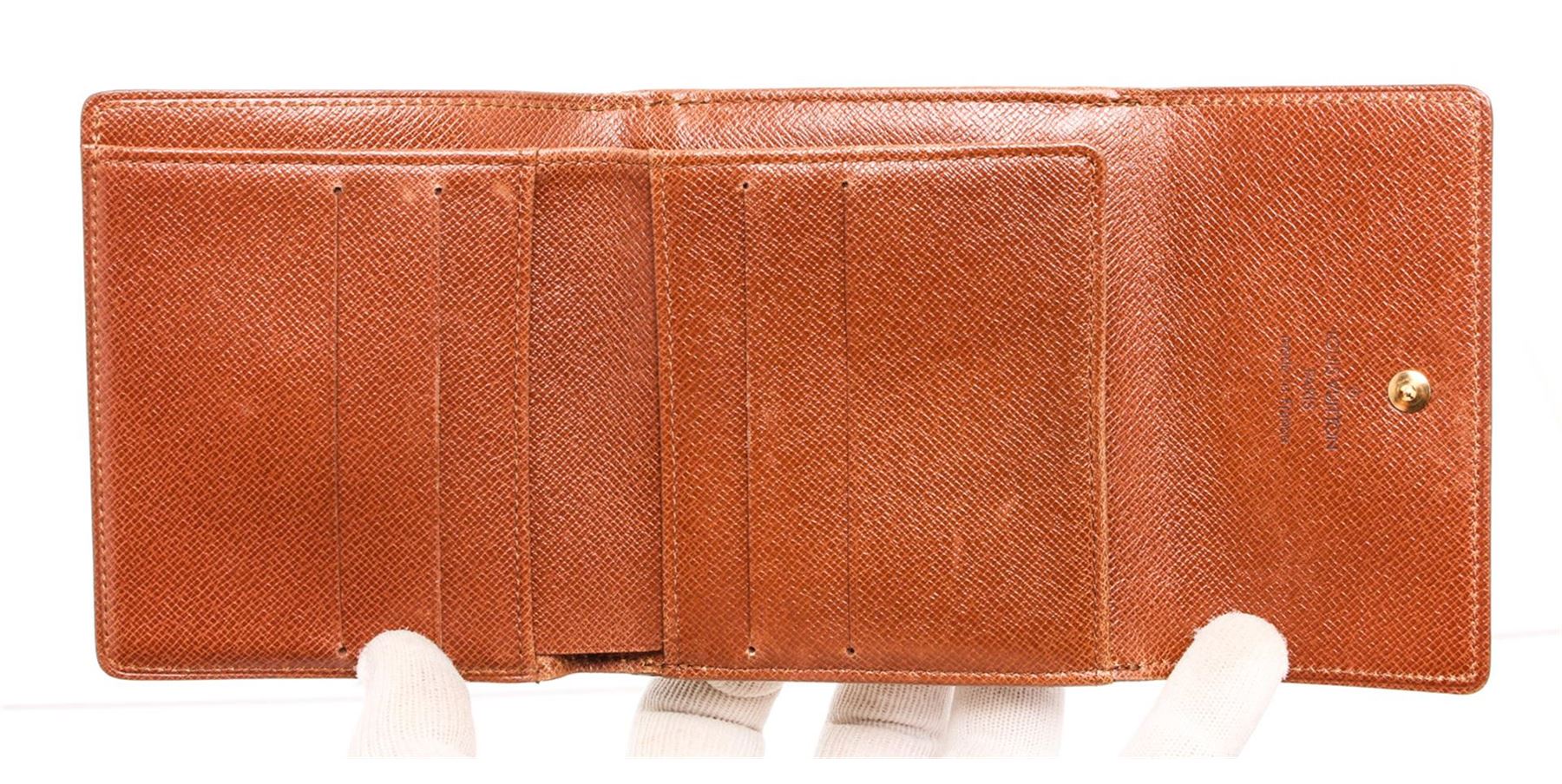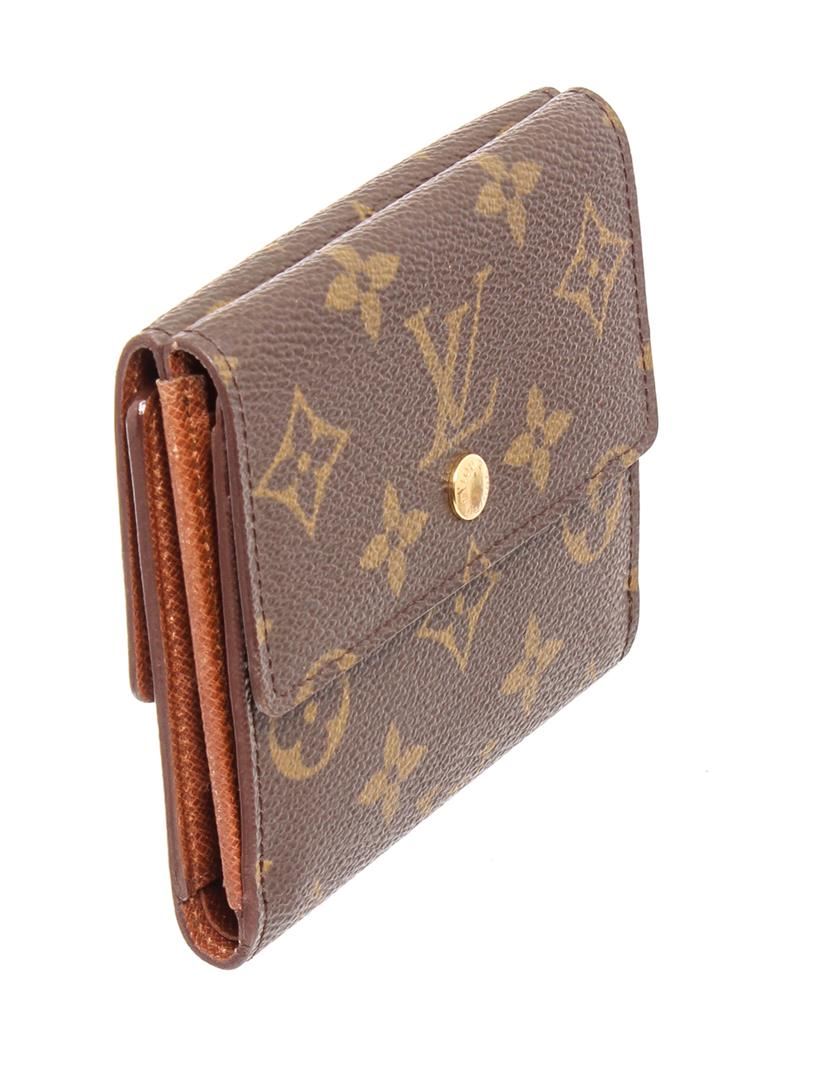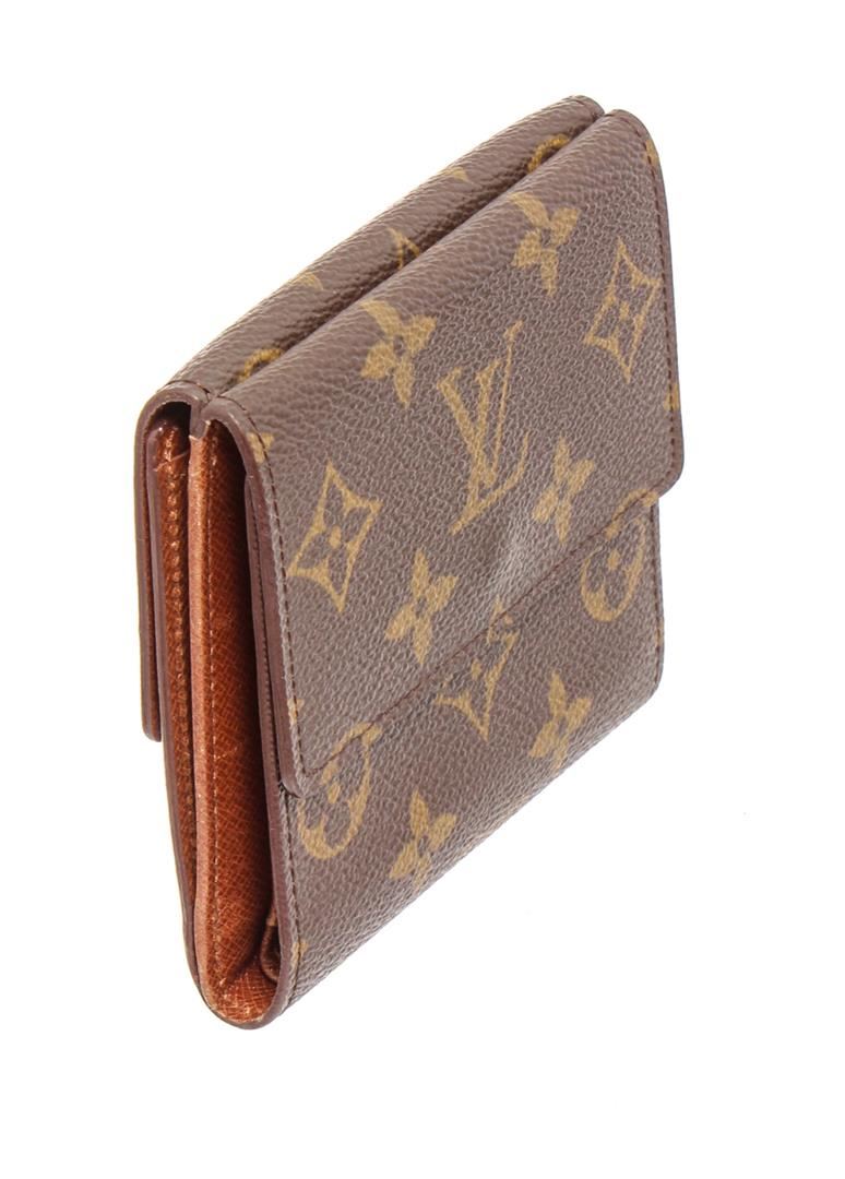 Brown and tan monogram coated canvas Louis Vuitton Elise compact wallet with gold-tone hardware, brown Taiga leather lining, dual compartments at exterior featuring snap closure, dual bill compartments at interior walls, single card slot and snap closure at exterior back.
