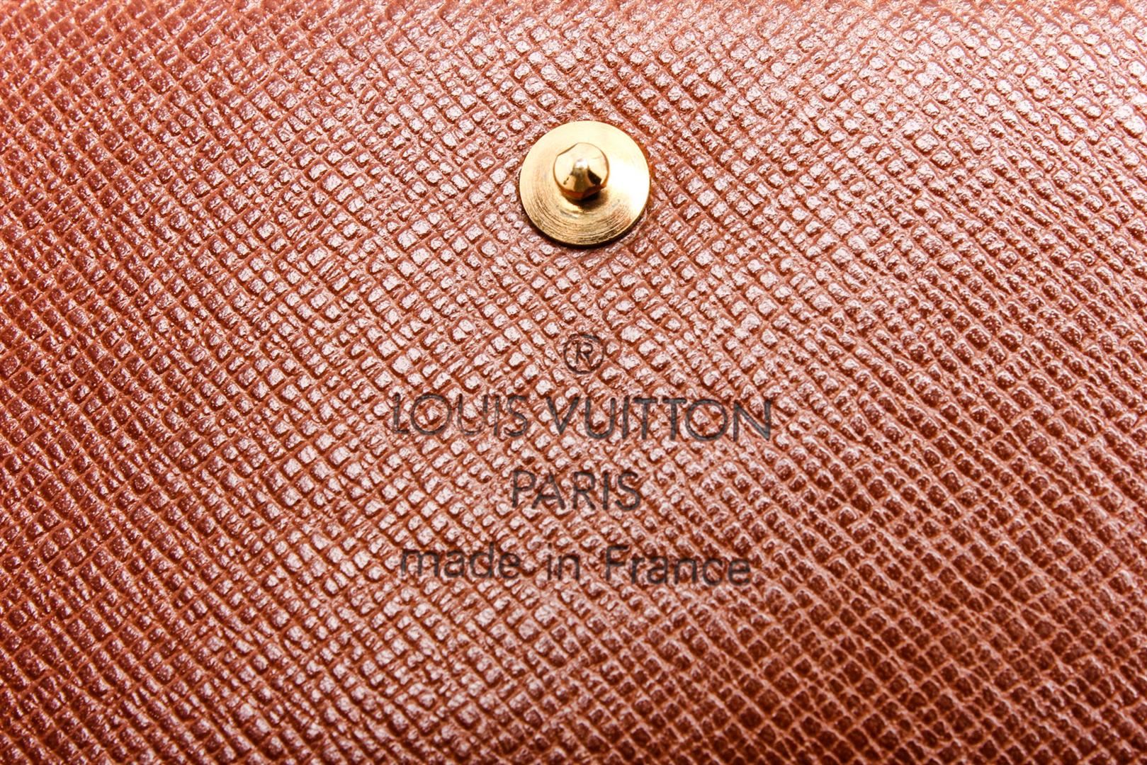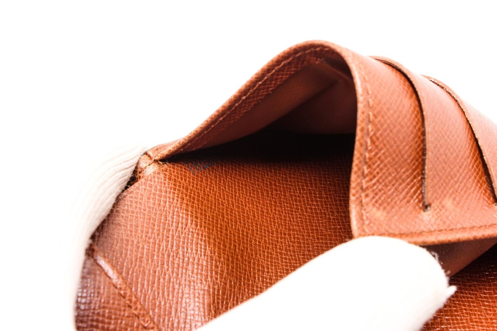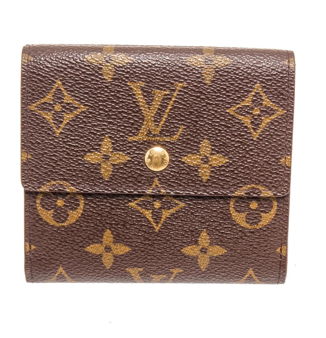 Brown and tan monogram coated canvas Louis Vuitton Elise compact wallet with gold-tone hardware, brown Taiga leather lining, dual compartments at exterior featuring snap closure, dual bill compartments at interior walls, single card slot and snap closure at exterior back.