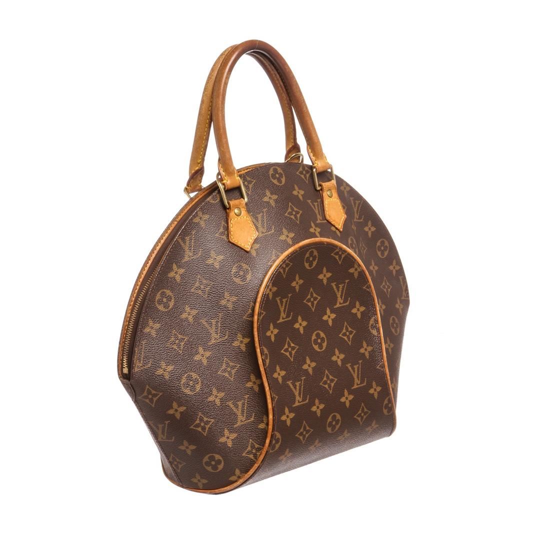 Brown and tan monogram coated canvas Louis Vuitton Monogram Ellipse MM with brass hardware, tan vachetta leather accents, dual rolled top handles, brown canvas lining, single pocket at interior wall and two-way zip closure at top. Item is pre-owned. Item Dimensions: 10"x3"x12"xBag Drop:4.5"/25.4cmx7.6cmx30.4cmxBag Drop:11.4cm.