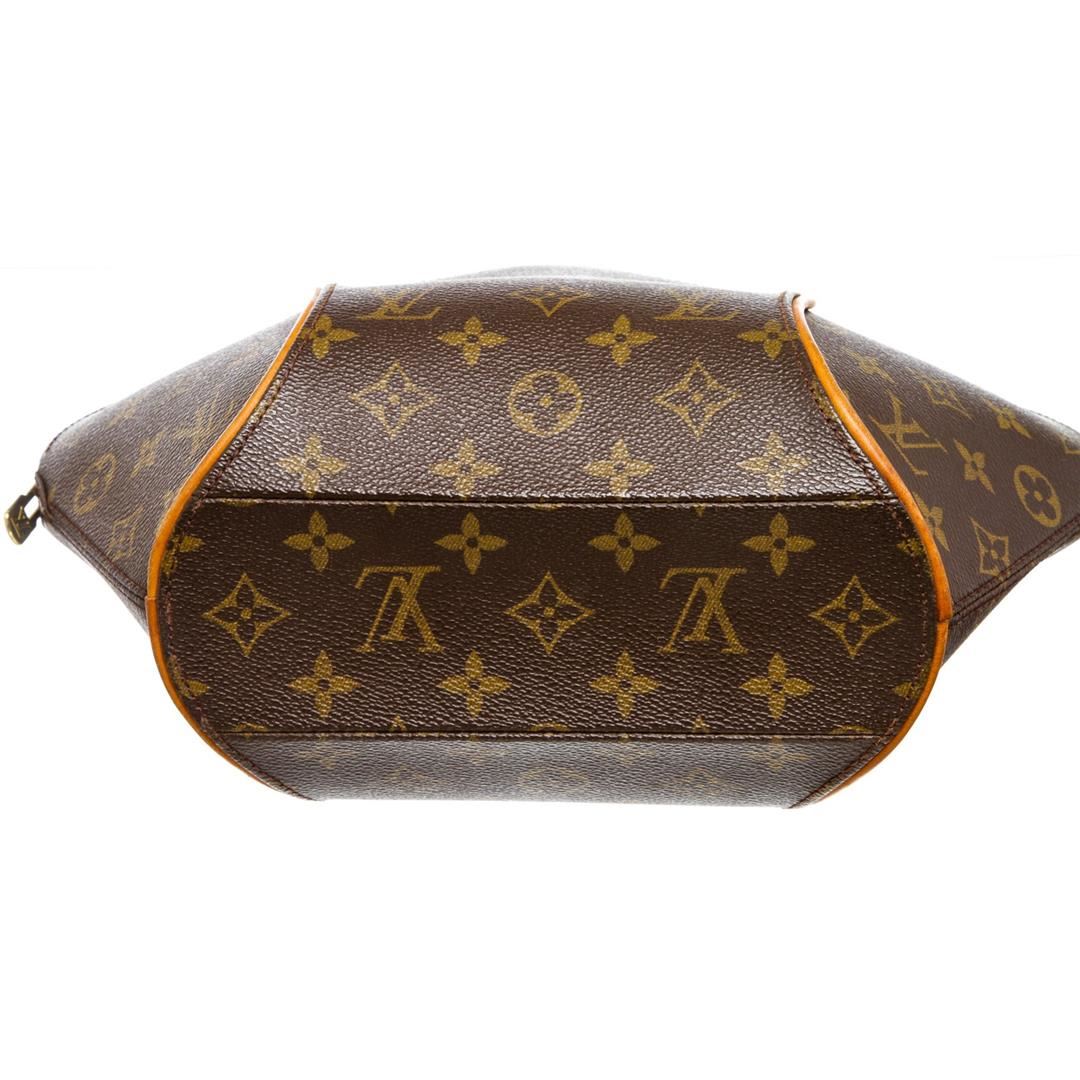 Brown and tan monogram coated canvas Louis Vuitton Ellipse PM with brass hardware, tan vachetta leather trim, dual rolled handles, brown canvas lining, single slit pocket at interior wall and zip closure at top.