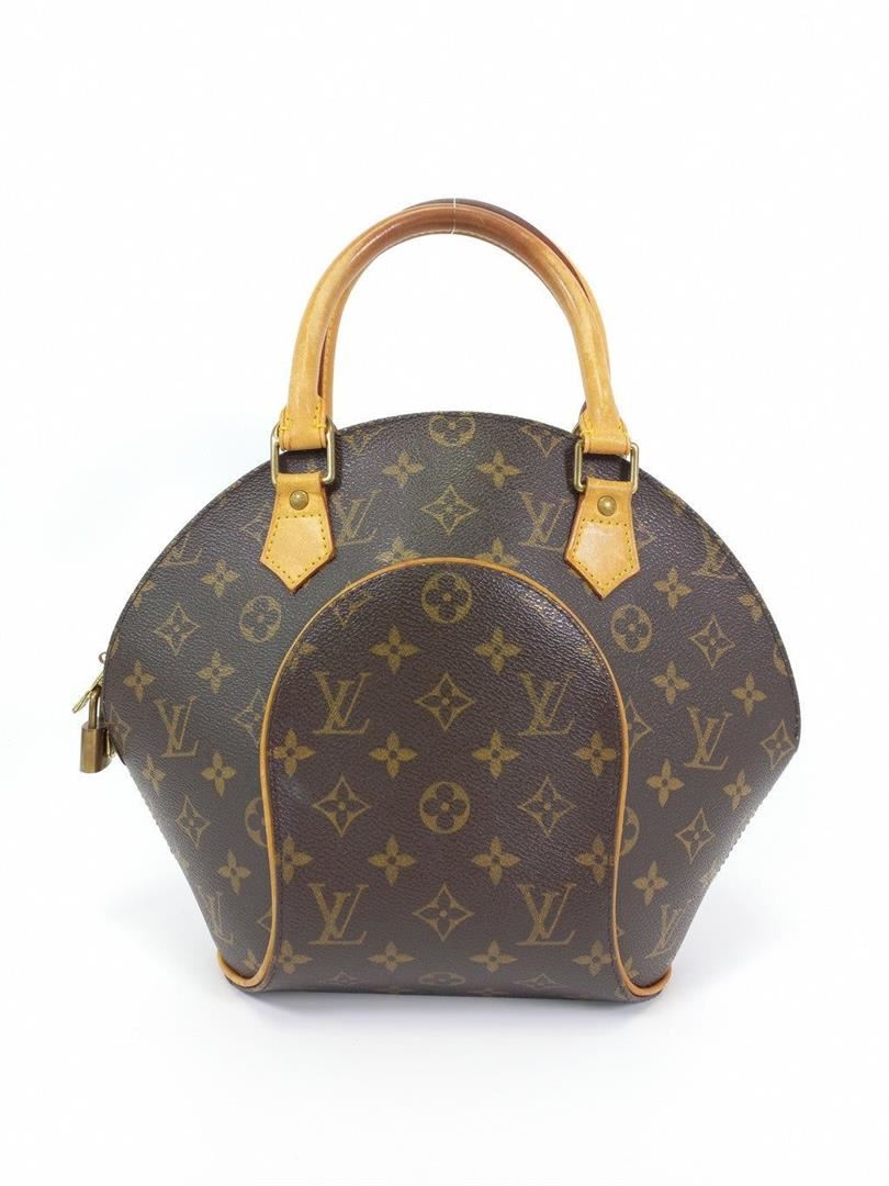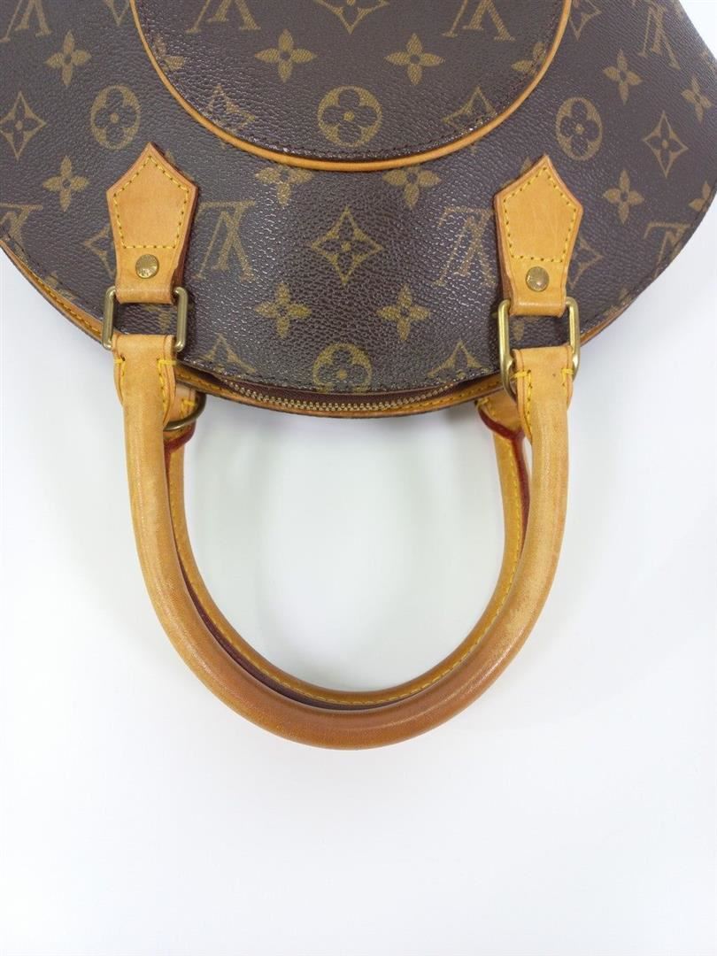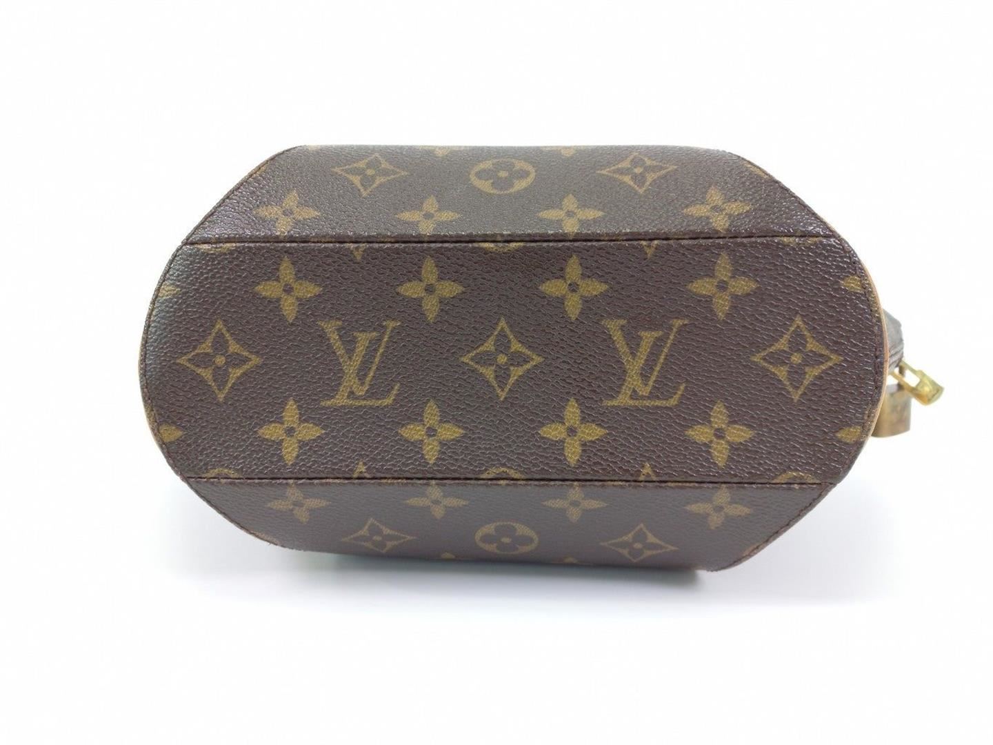Brown and tan monogram coated canvas Louis Vuitton Ellipse PM with brass hardware, tan vachetta leather trim, dual rolled handles, brown canvas lining, single slit pocket at interior wall and zip closure at top.