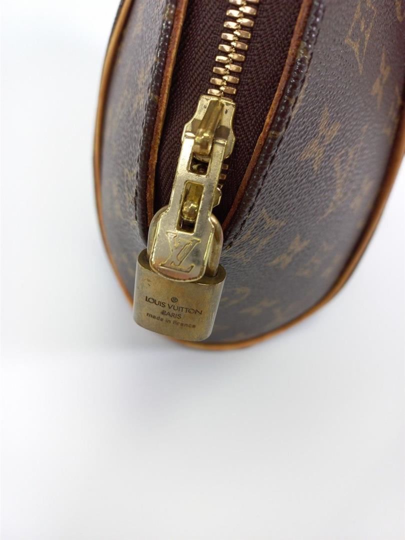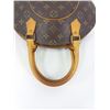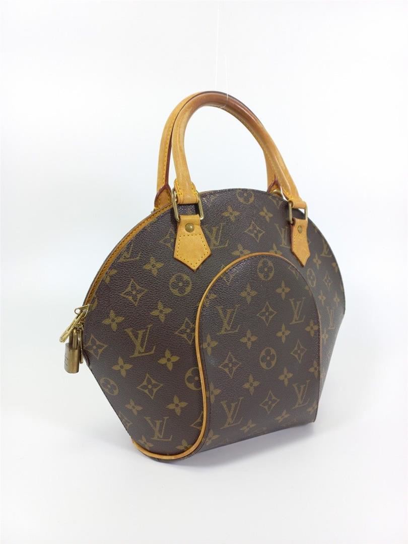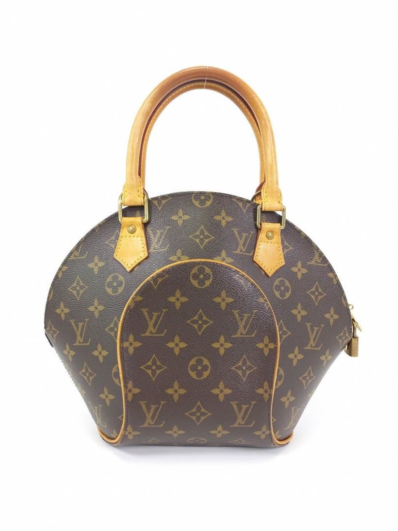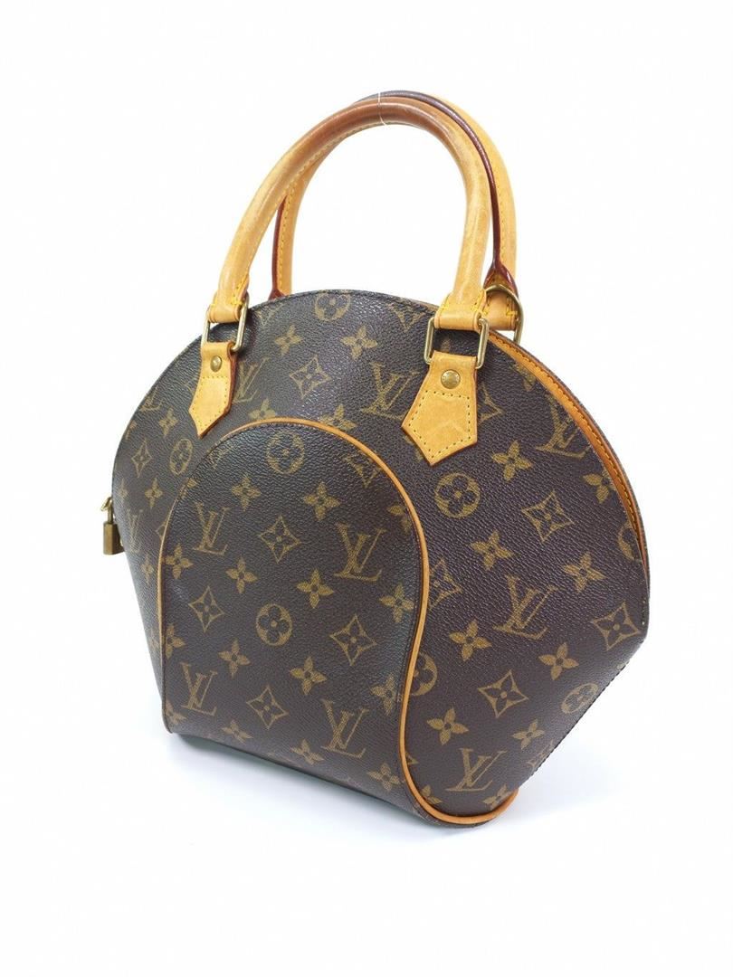 Brown and tan monogram coated canvas Louis Vuitton Ellipse PM with brass hardware, tan vachetta leather trim, dual rolled handles, brown canvas lining, single slit pocket at interior wall and zip closure at top.