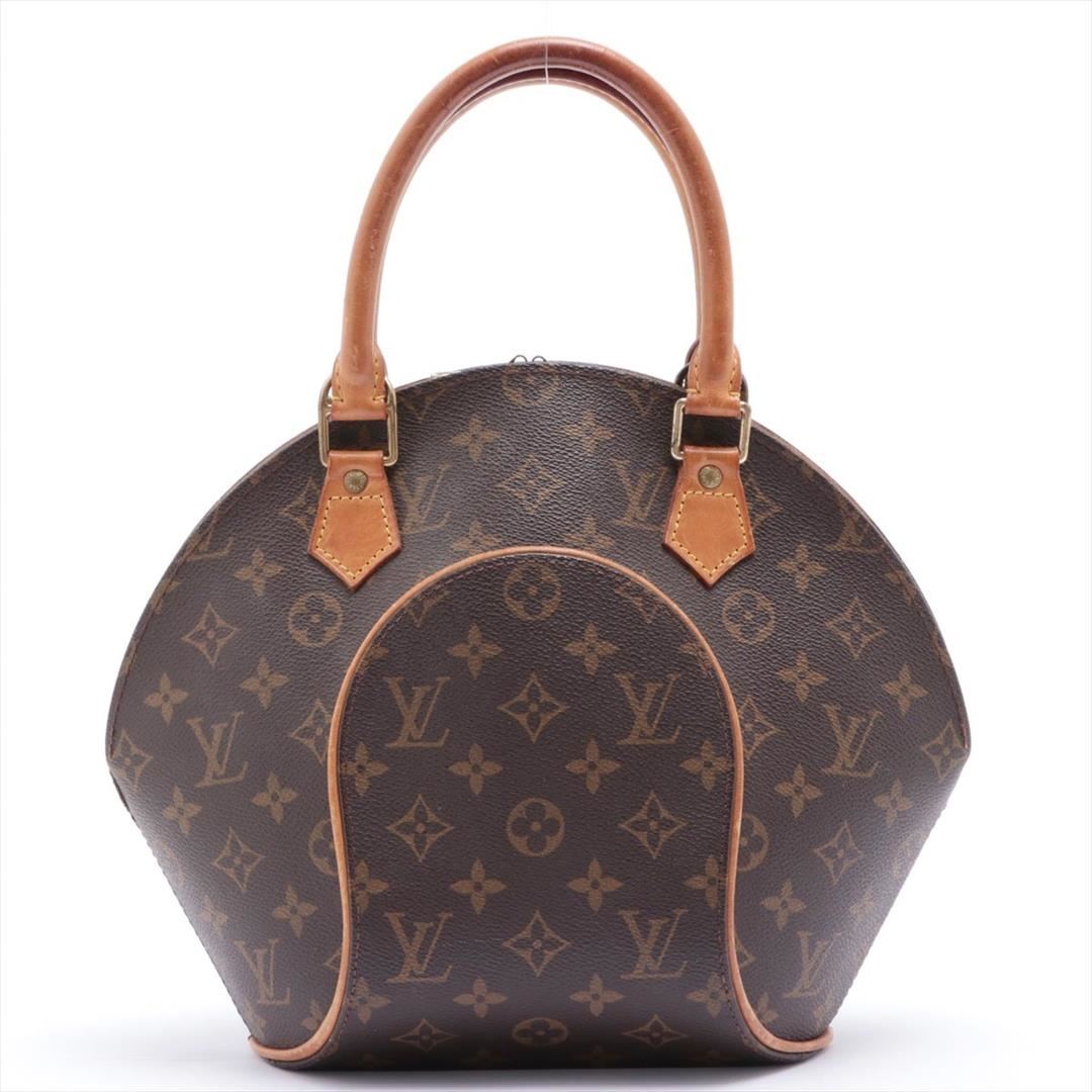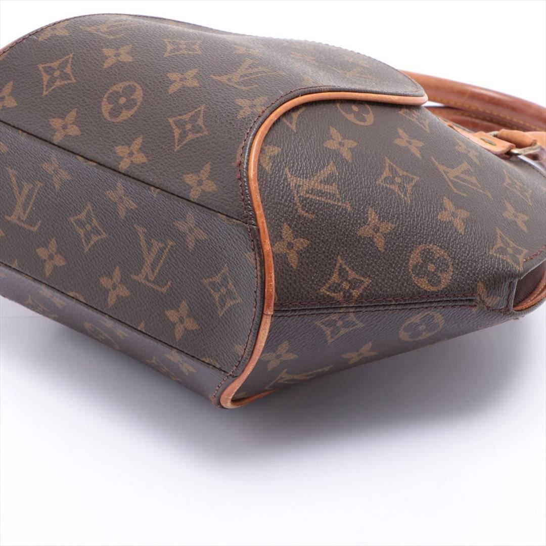 Brown and tan monogram coated canvas Louis Vuitton Ellipse PM with brass hardware, tan vachetta leather trim, dual rolled handles, brown canvas lining, single slit pocket at interior wall and zip closure at top. 13.5"x6x10.5"xBag Drop:4"/34.2cmx15.2