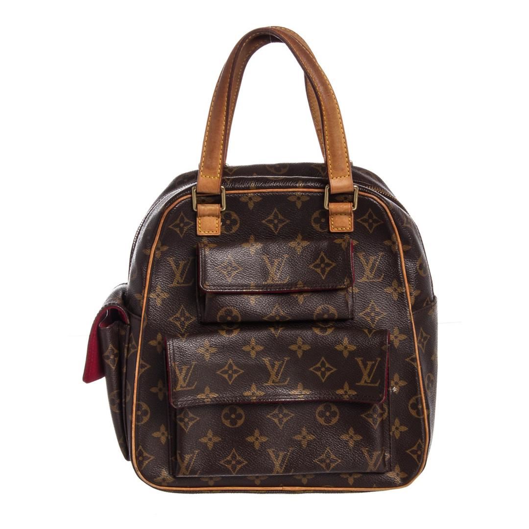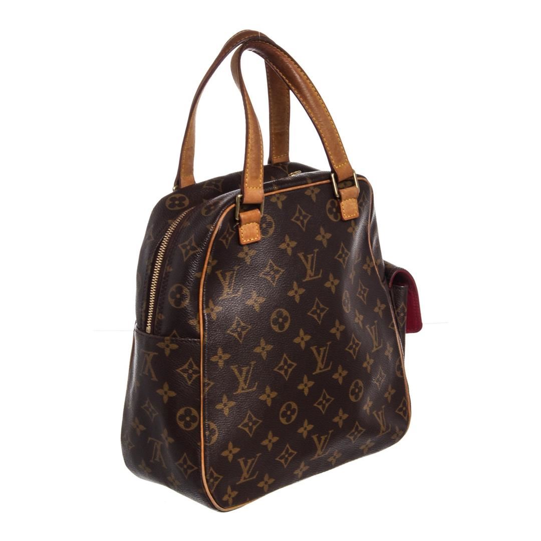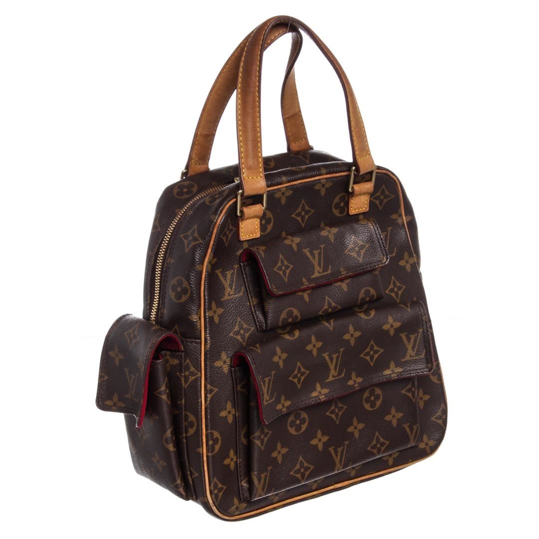Brown and tan monogram coated canvas Louis Vuitton Excentri Cite bag with brass hardware, tan vachetta leather trim, optional shoulder strap, dual flat handles, three pockets at exterior wit flaps and snap closures, red Alcantara lining, single slit pocket at interior wall and zip closure at top.