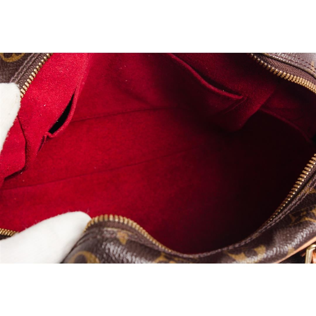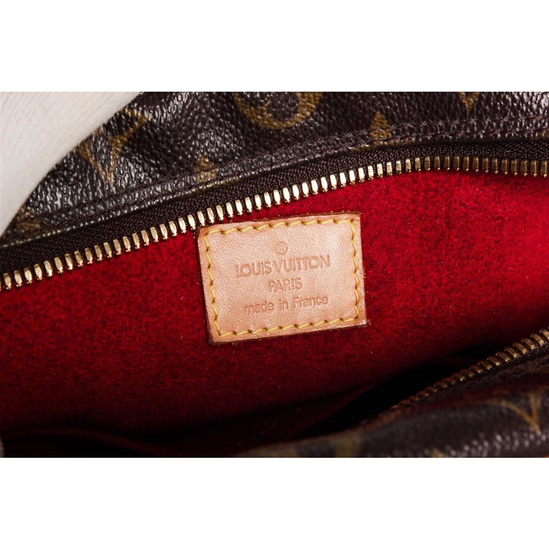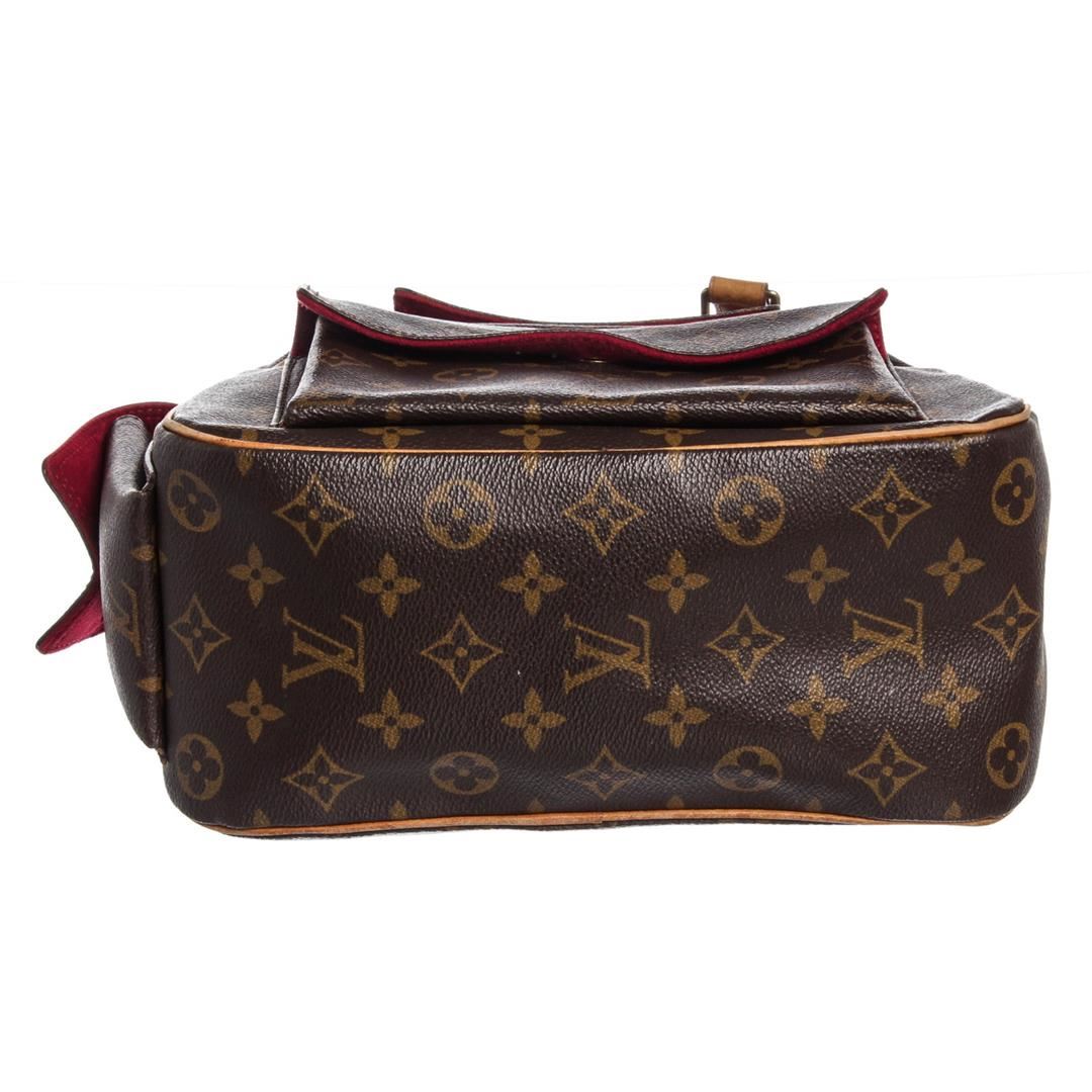 Brown and tan monogram coated canvas Louis Vuitton Excentri Cite bag with brass hardware, tan vachetta leather trim, optional shoulder strap, dual flat handles, three pockets at exterior wit flaps and snap closures, red Alcantara lining, single slit pocket at interior wall and zip closure at top.