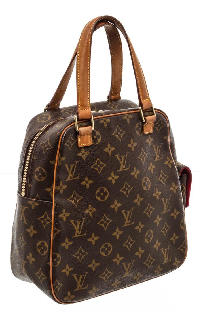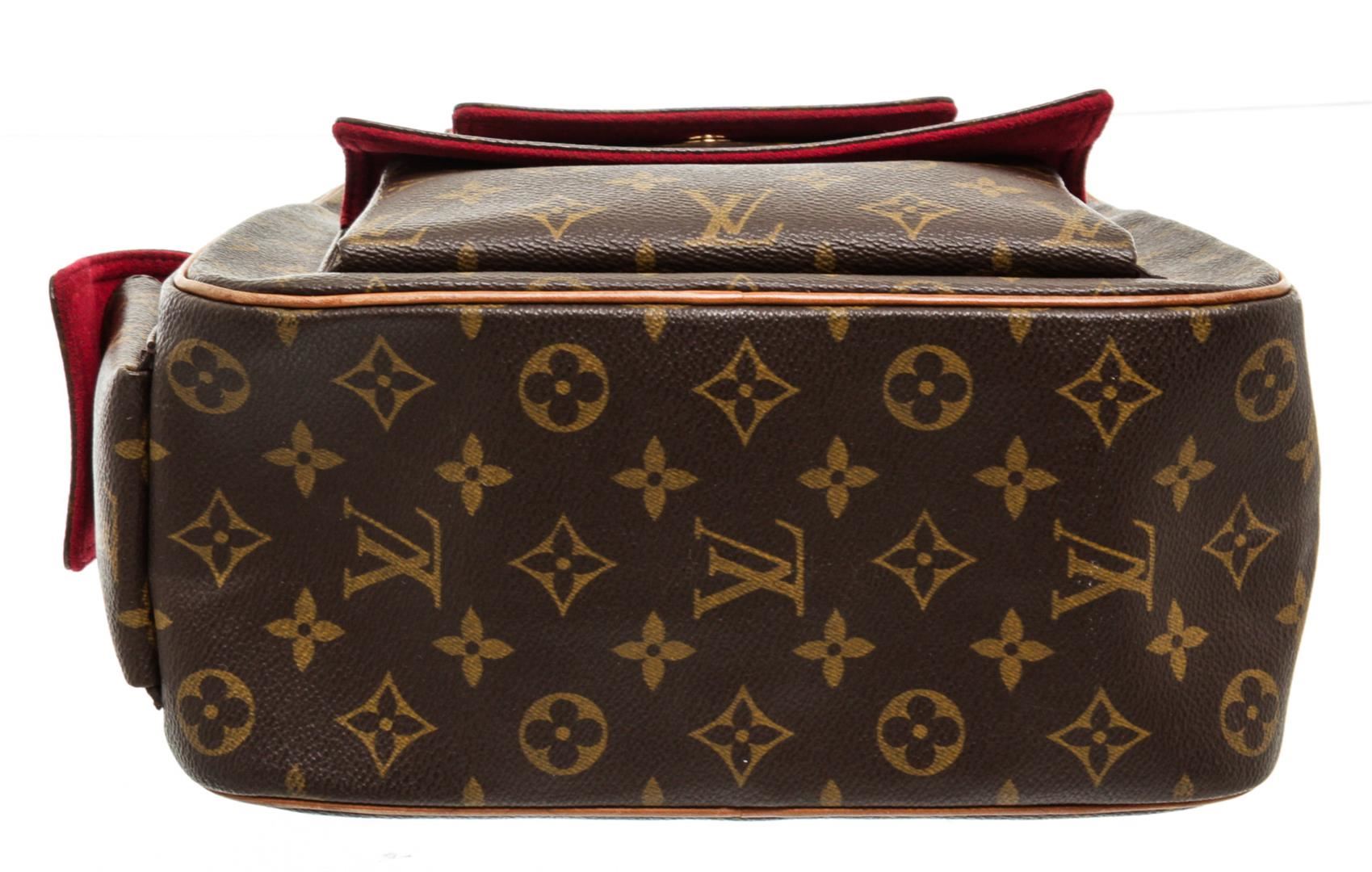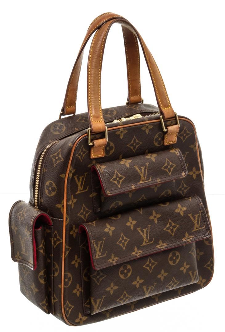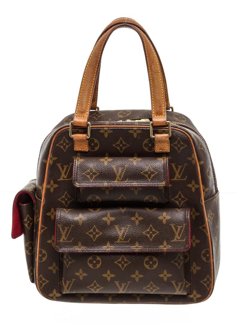 Brown and tan monogram coated canvas Louis Vuitton Excentri Cite bag with brass hardware, tan vachetta leather trim, optional shoulder strap, dual flat handles, three pockets at exterior wit flaps and snap closures, red Alcantara lining, single slit pocket at interior wall and zip closure at top.