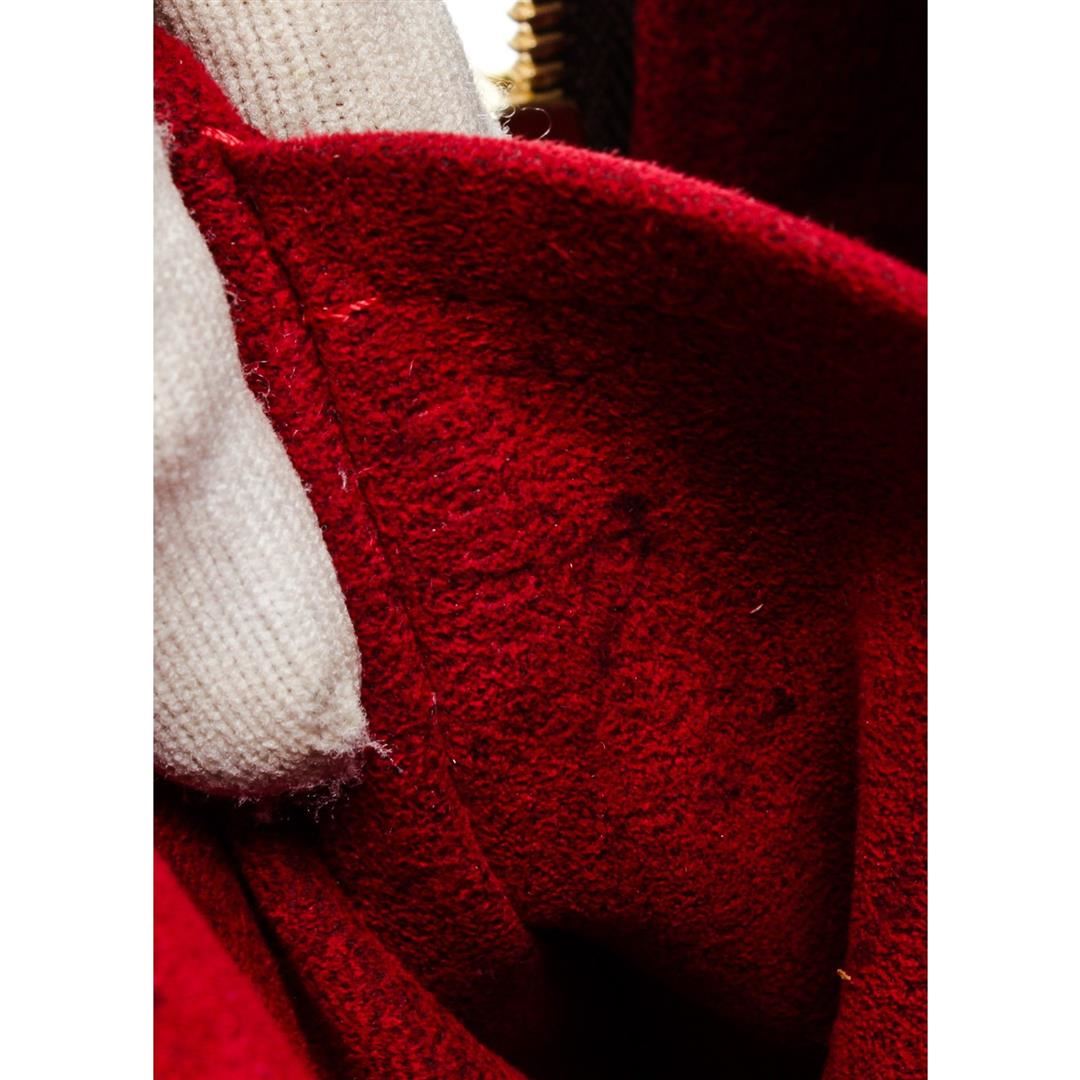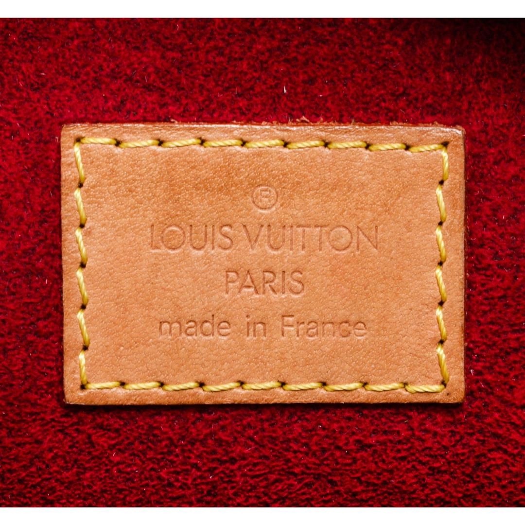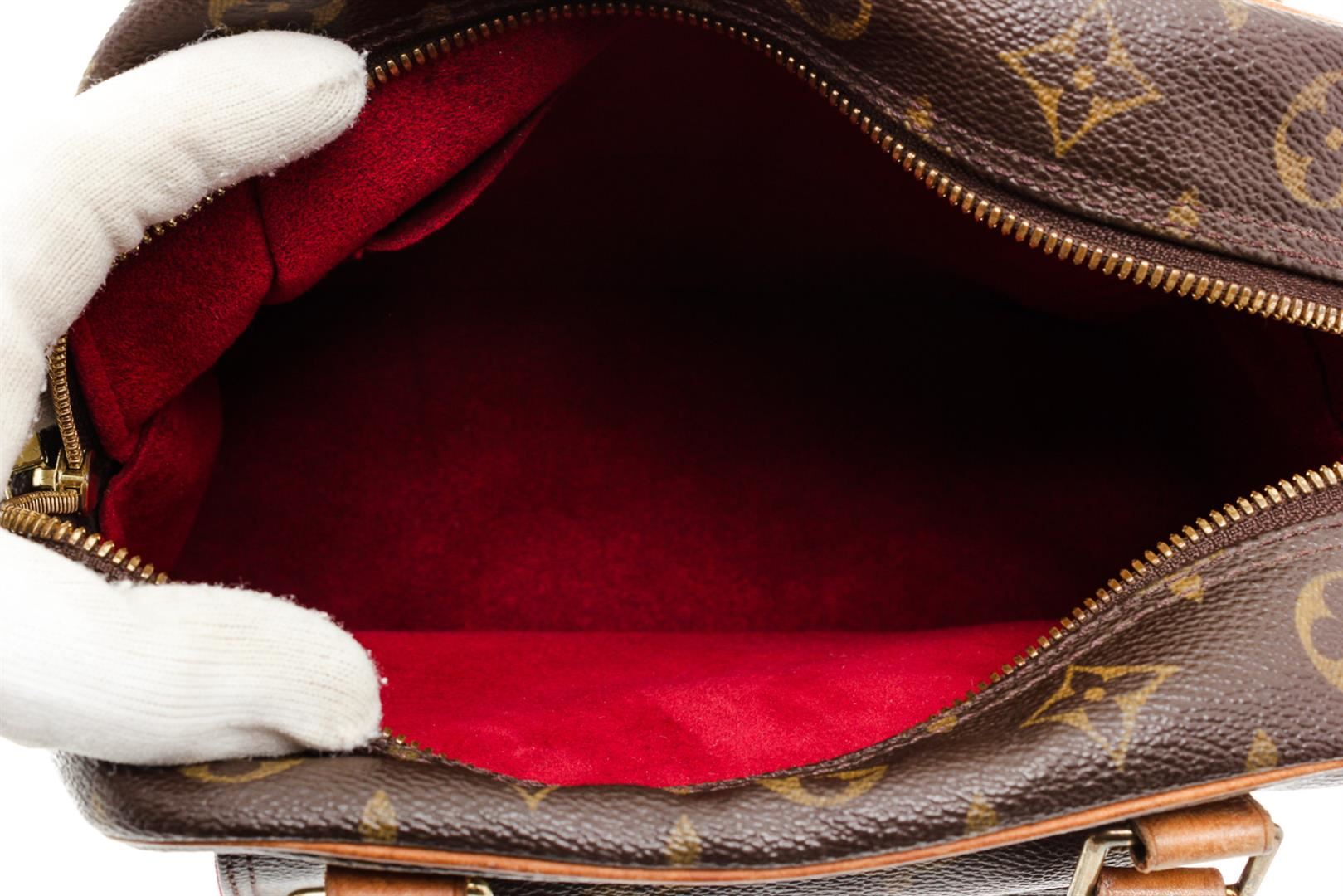 Brown and tan monogram coated canvas Louis Vuitton Excentri Cite bag with brass hardware, tan vachetta leather trim, optional shoulder strap, dual flat handles, three pockets at exterior wit flaps and snap closures, red Alcantara lining, single slit pocket at interior wall and zip closure at top.