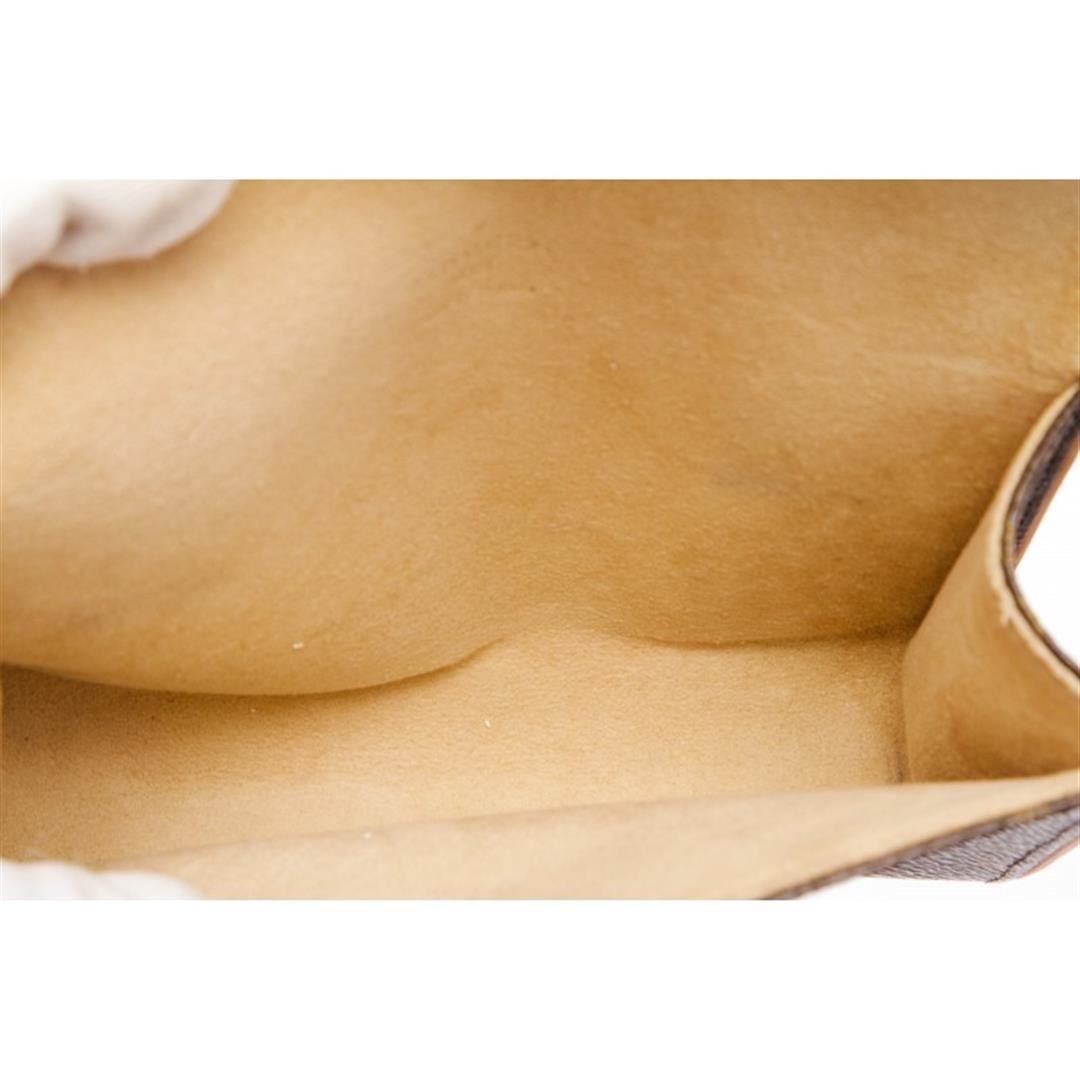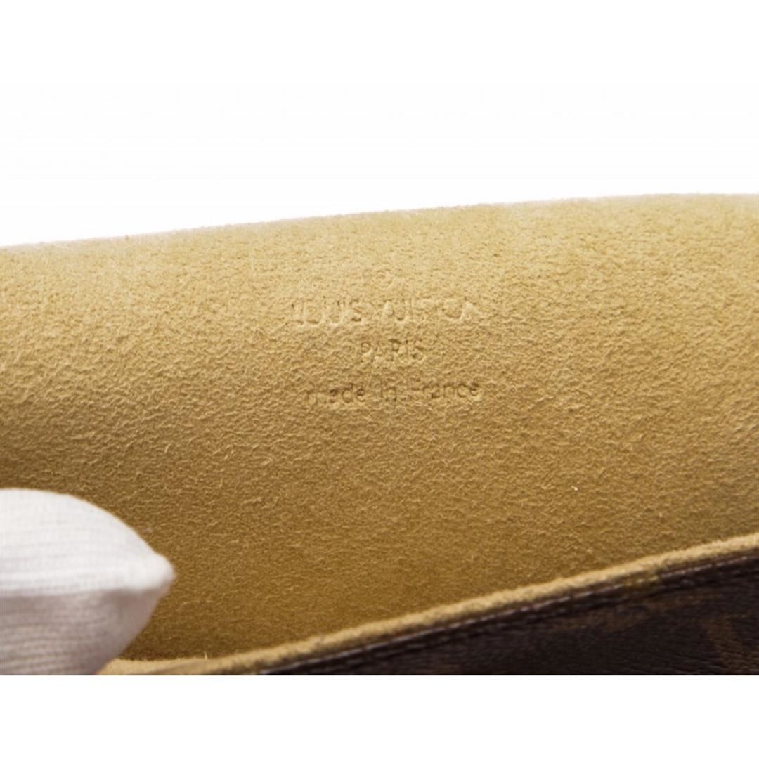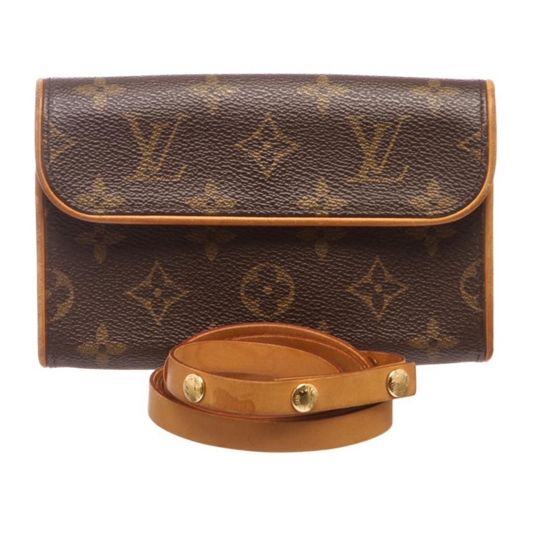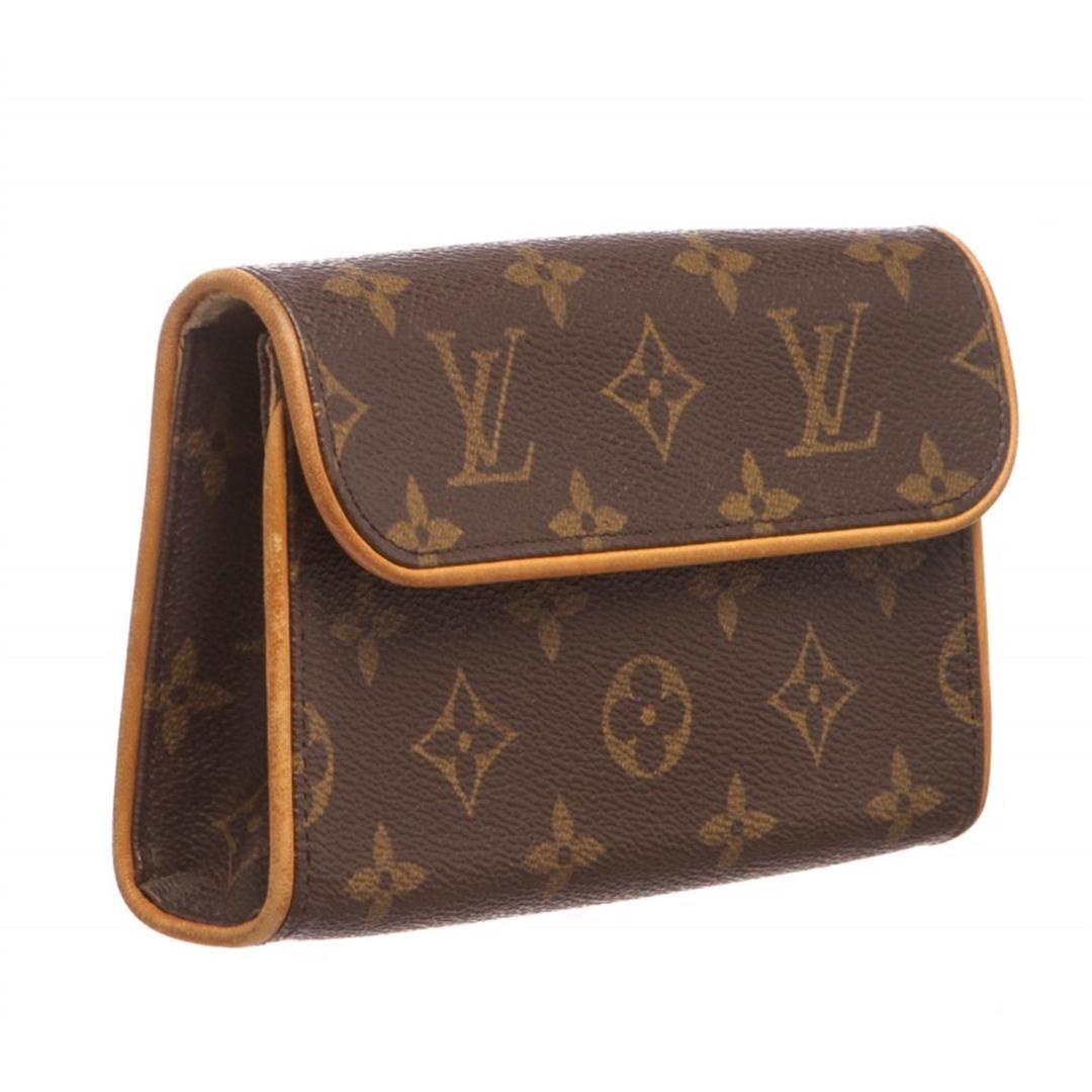 Brown and tan monogram coated canvas Louis Vuitton Pochette Florentine with brass hardware, tan vachetta leather trim, optional waist strap with snap closure, beige Alcantara lining and flap with magnetic snap closure at front.