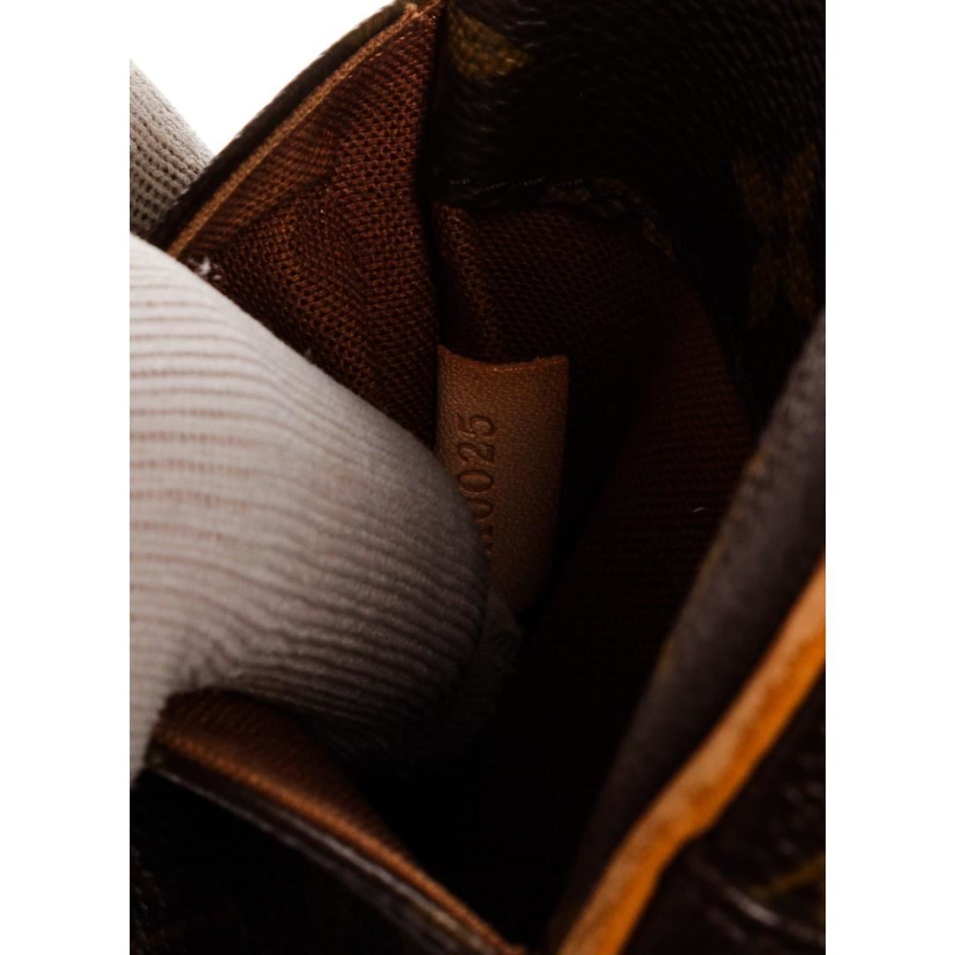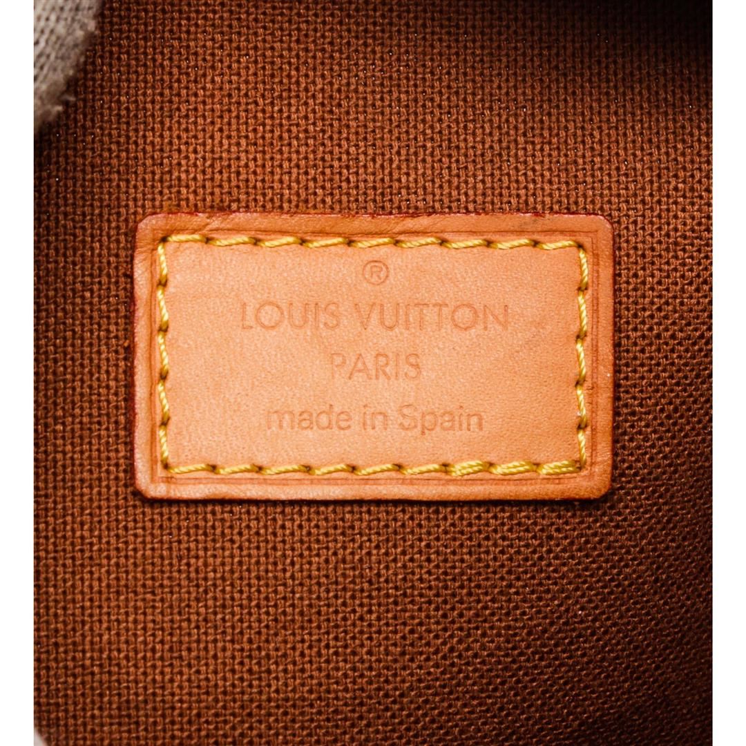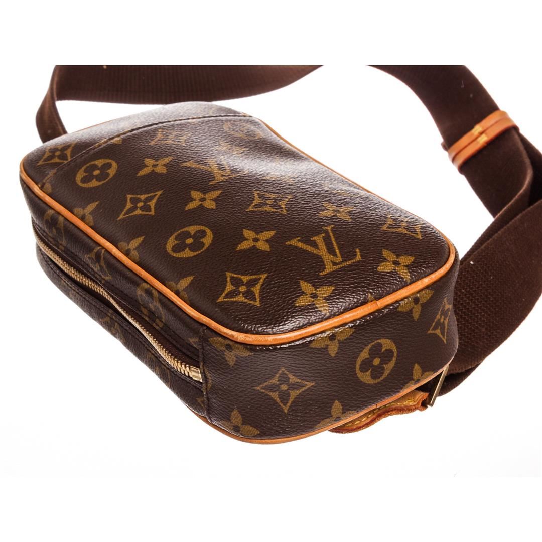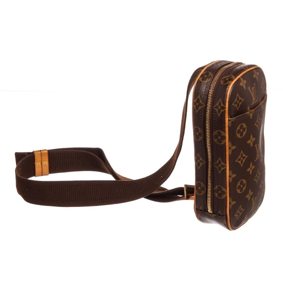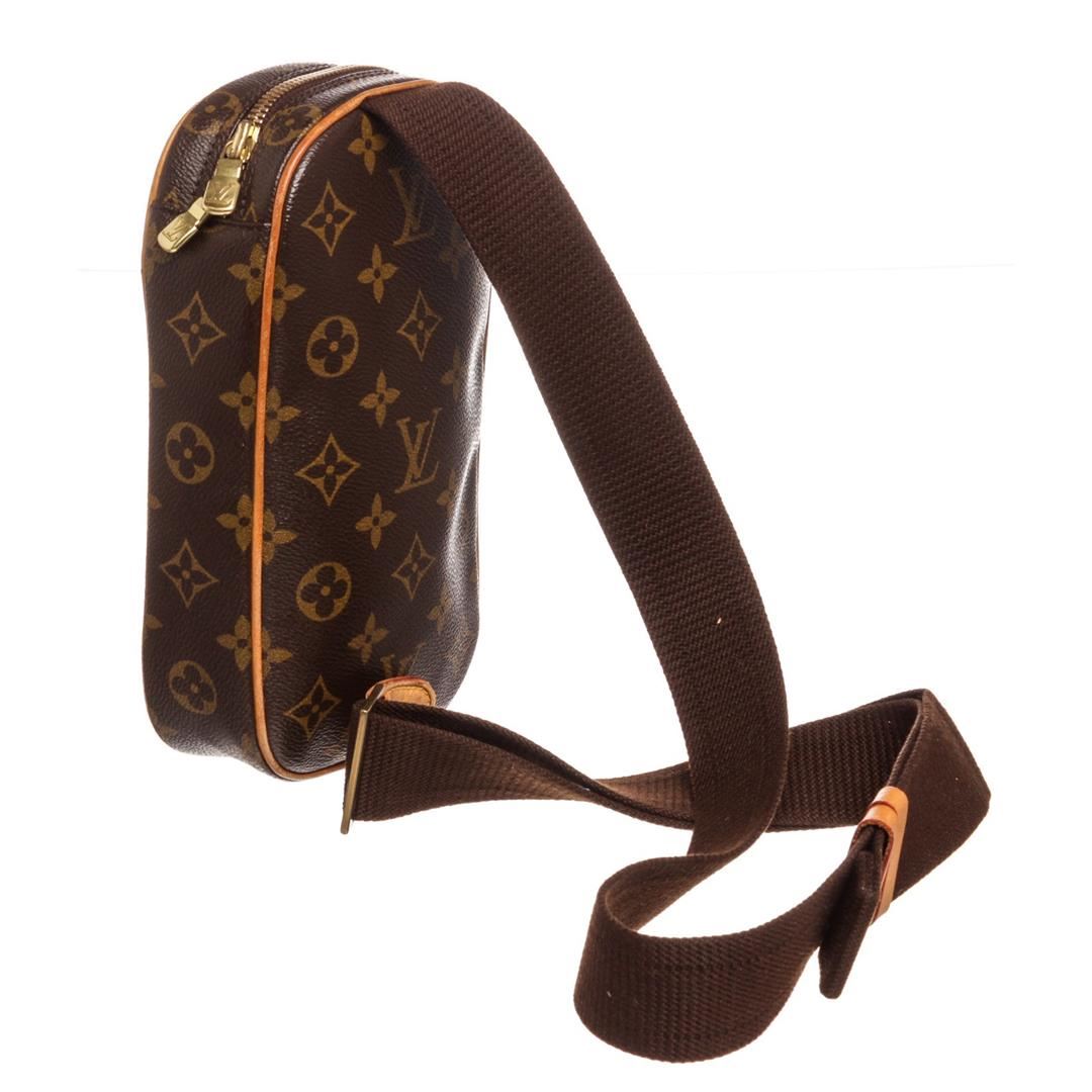 Brown and tan monogram coated canvas Louis Vuitton Pochette Gange with brass hardware, tan vachetta leather trim, adjustable woven shoulder strap, slit pocket at front, brown canvas lining, single interior compartment and zip closure at top.