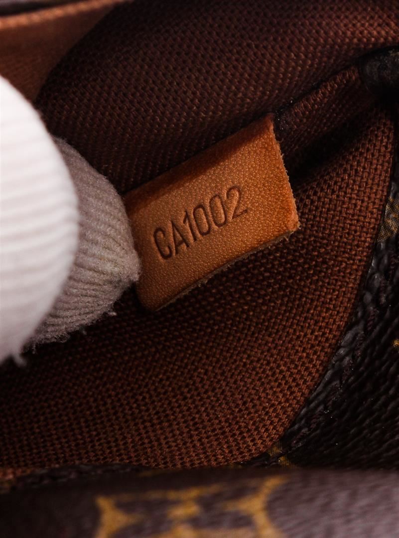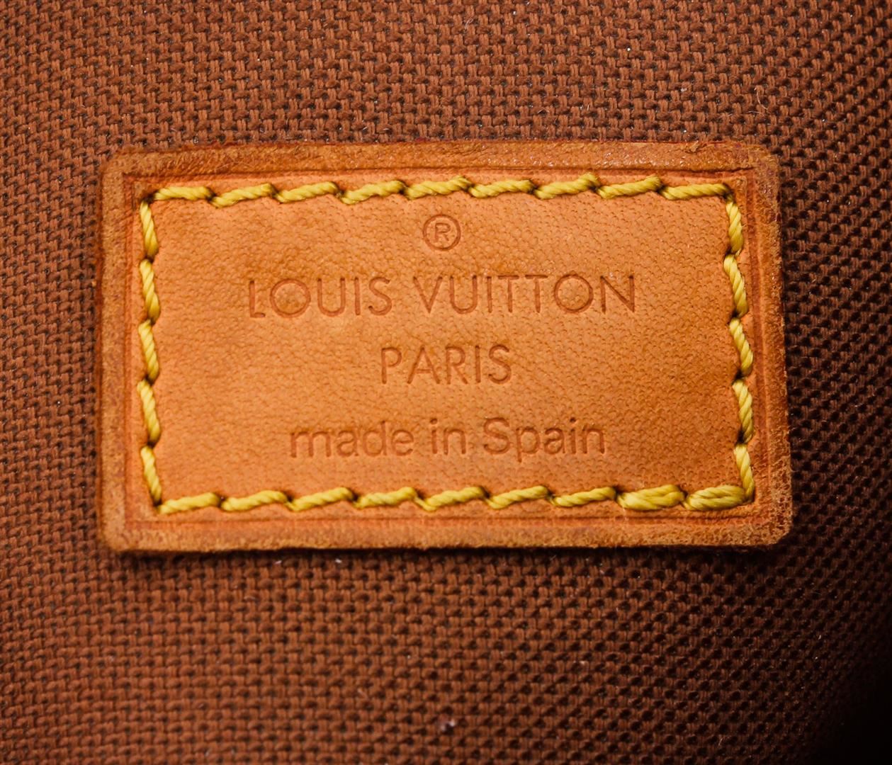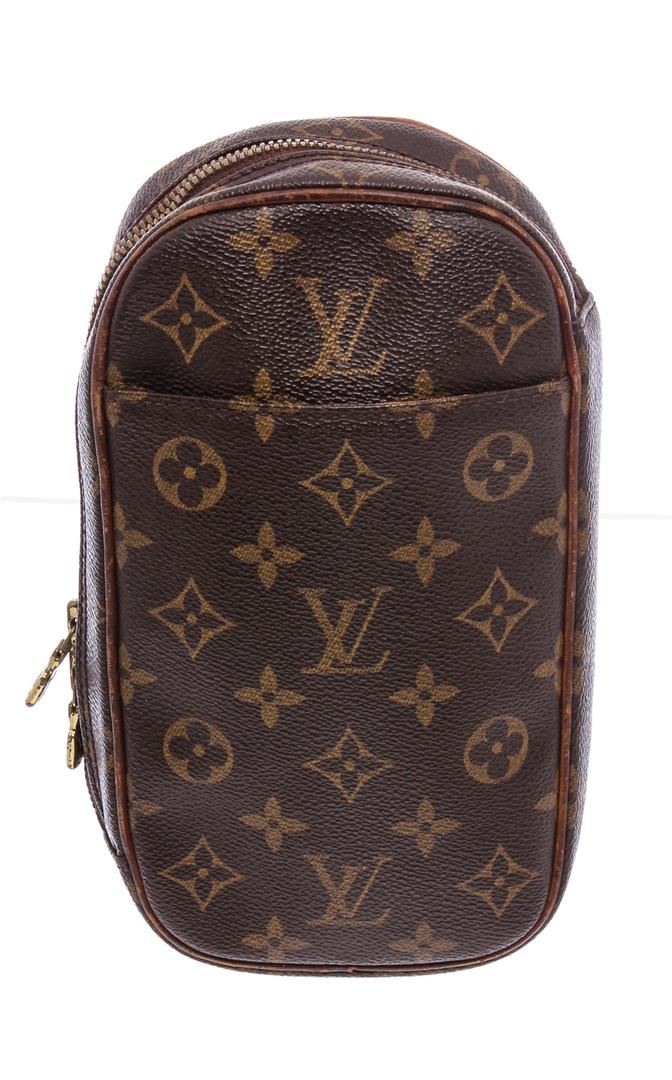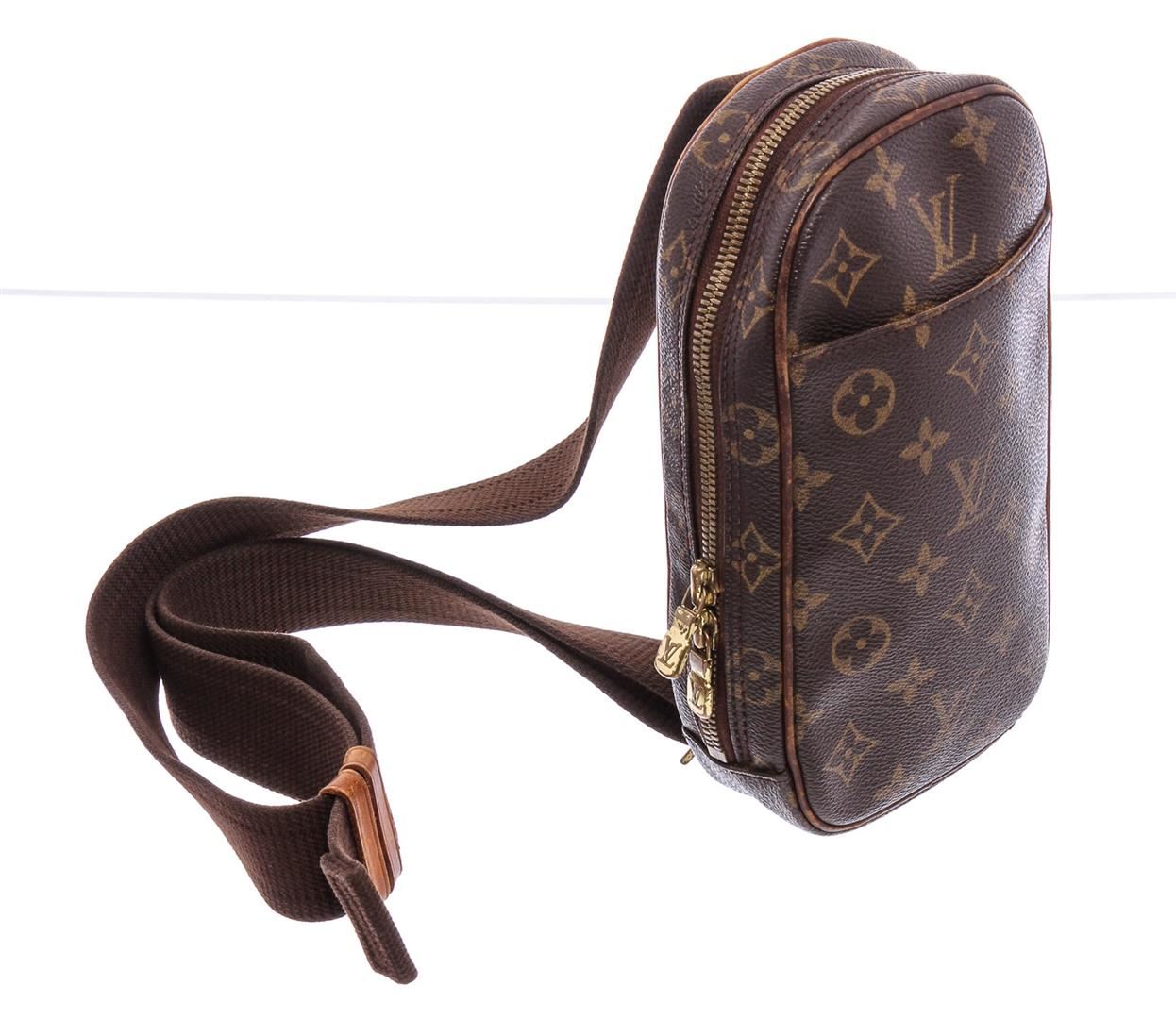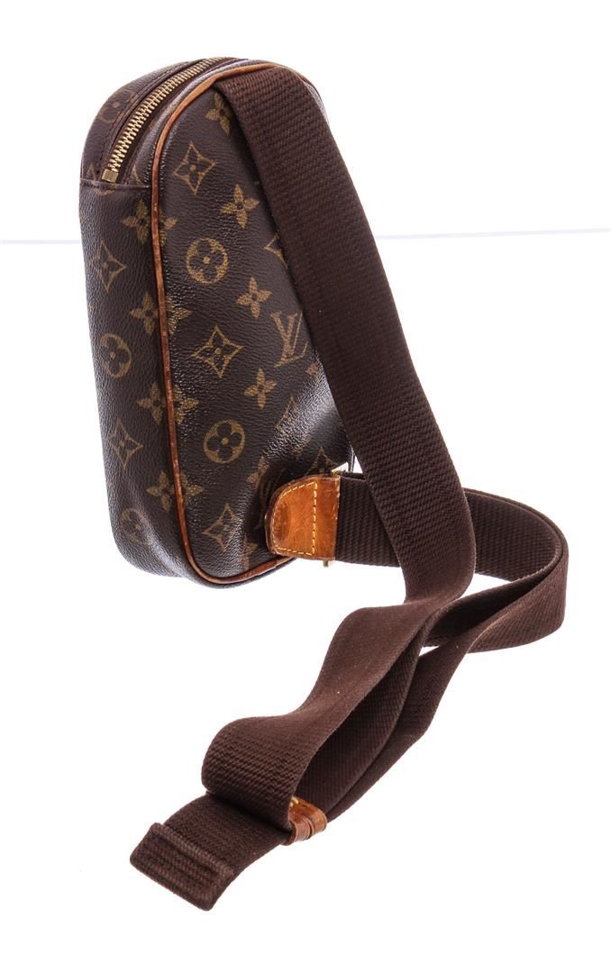 One Louis Vuitton Monogram Canvas Leather Gange Crossbody Bag. Brown and tan monogram coated canvas Louis Vuitton Pochette Gange with brass hardware, tan vachetta leather trim, adjustable woven shoulder strap, slit pocket at front, brown canvas lining, single interior compartment and zip closure at top.