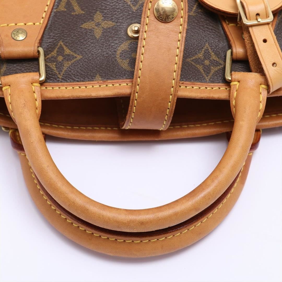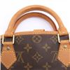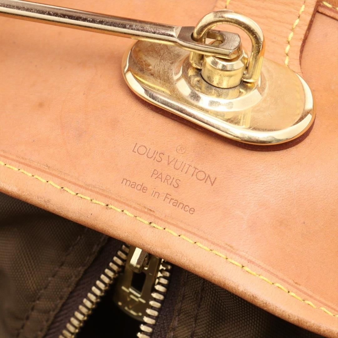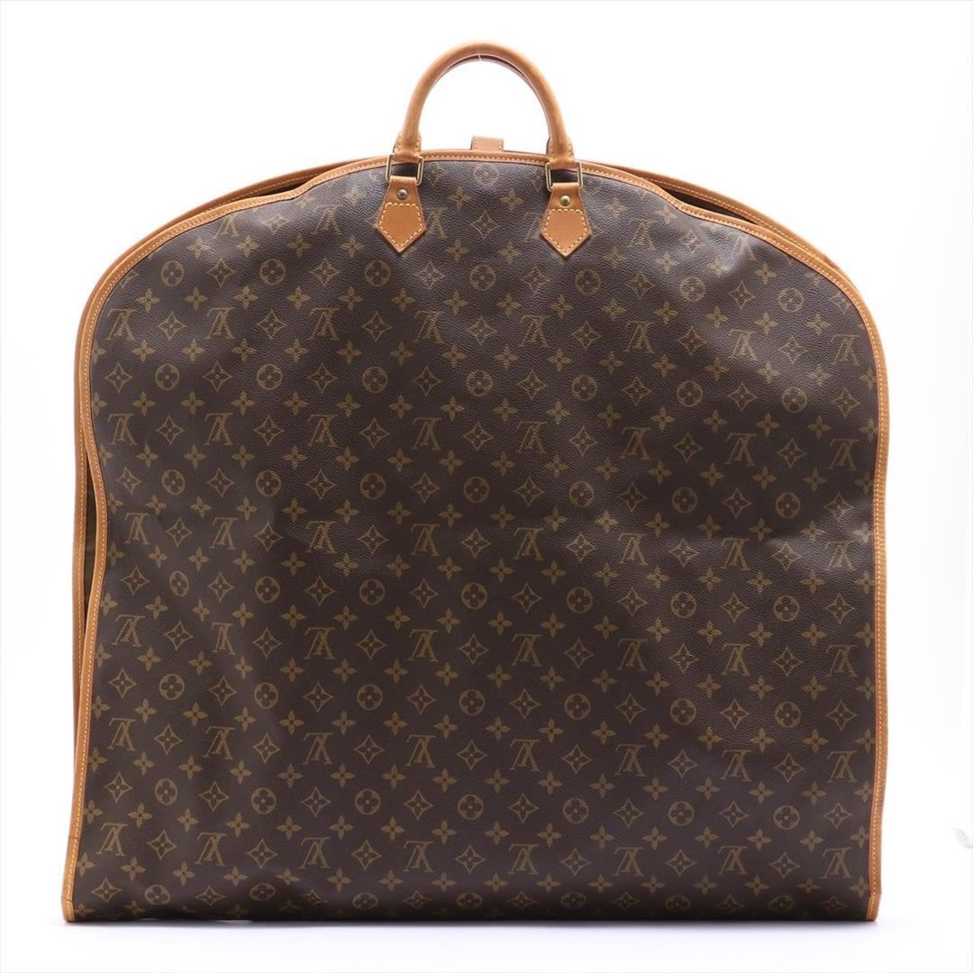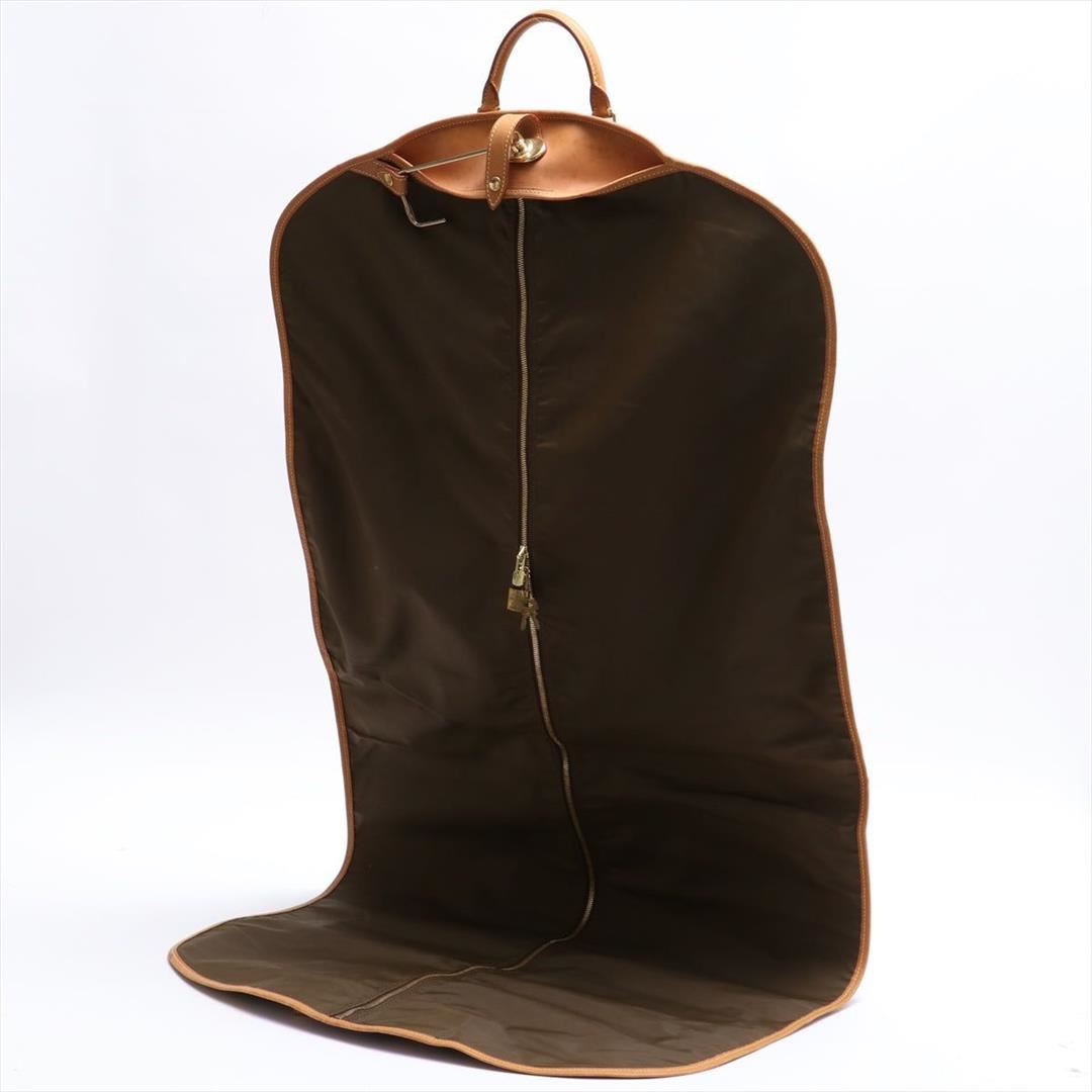 Brown and tan monogram coated canvas Louis Vuitton Garment Cover with brass hardware, tan vachetta leather trim, chocolate brown canvas lining, and zip closure.