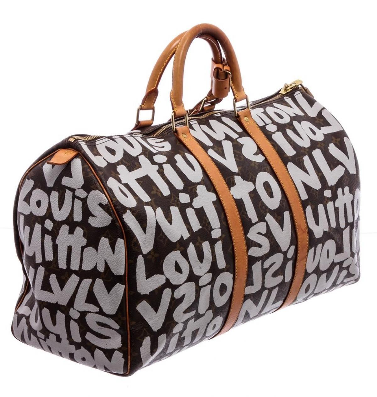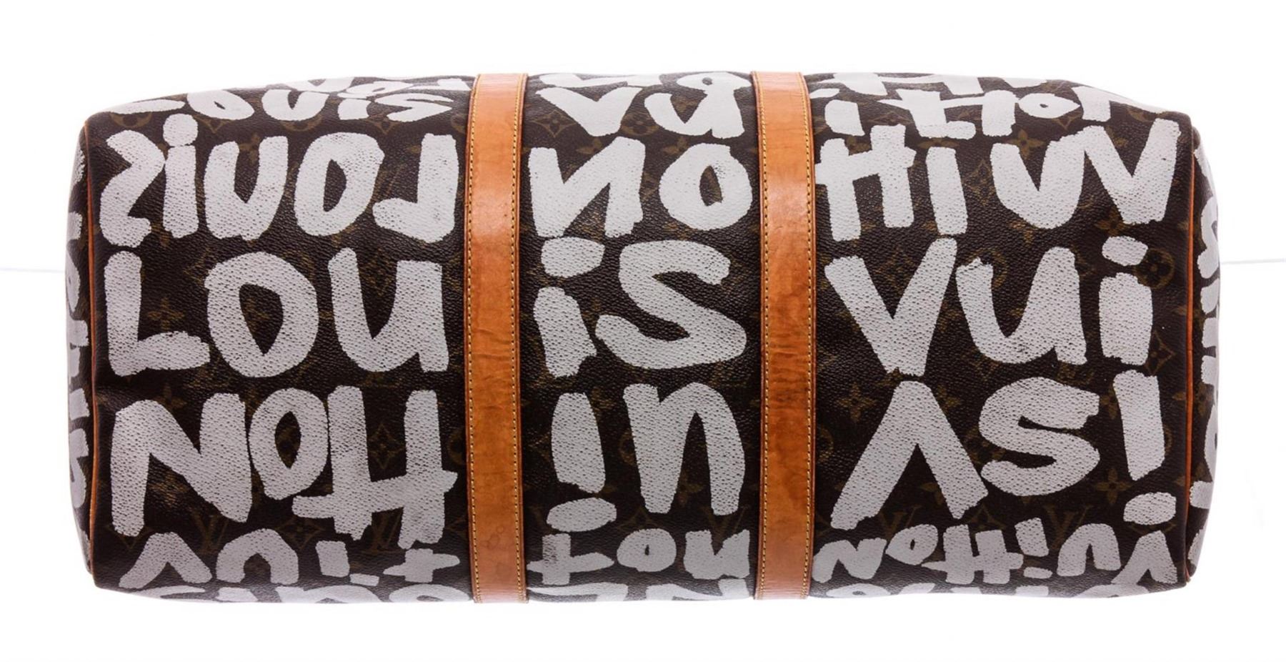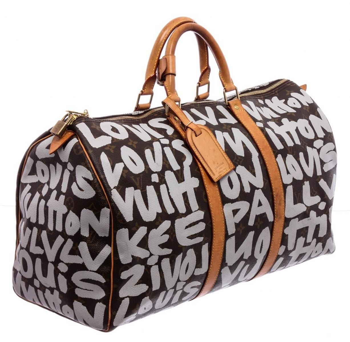 Brown and tan monogram coated canvas Louis Vuitton Keepall 50 with brass hardware, tan vachetta trim, dual rolled top handles, ivory 'Graffiti' motif at exterior, brown canvas interior and dual zip closures at top.