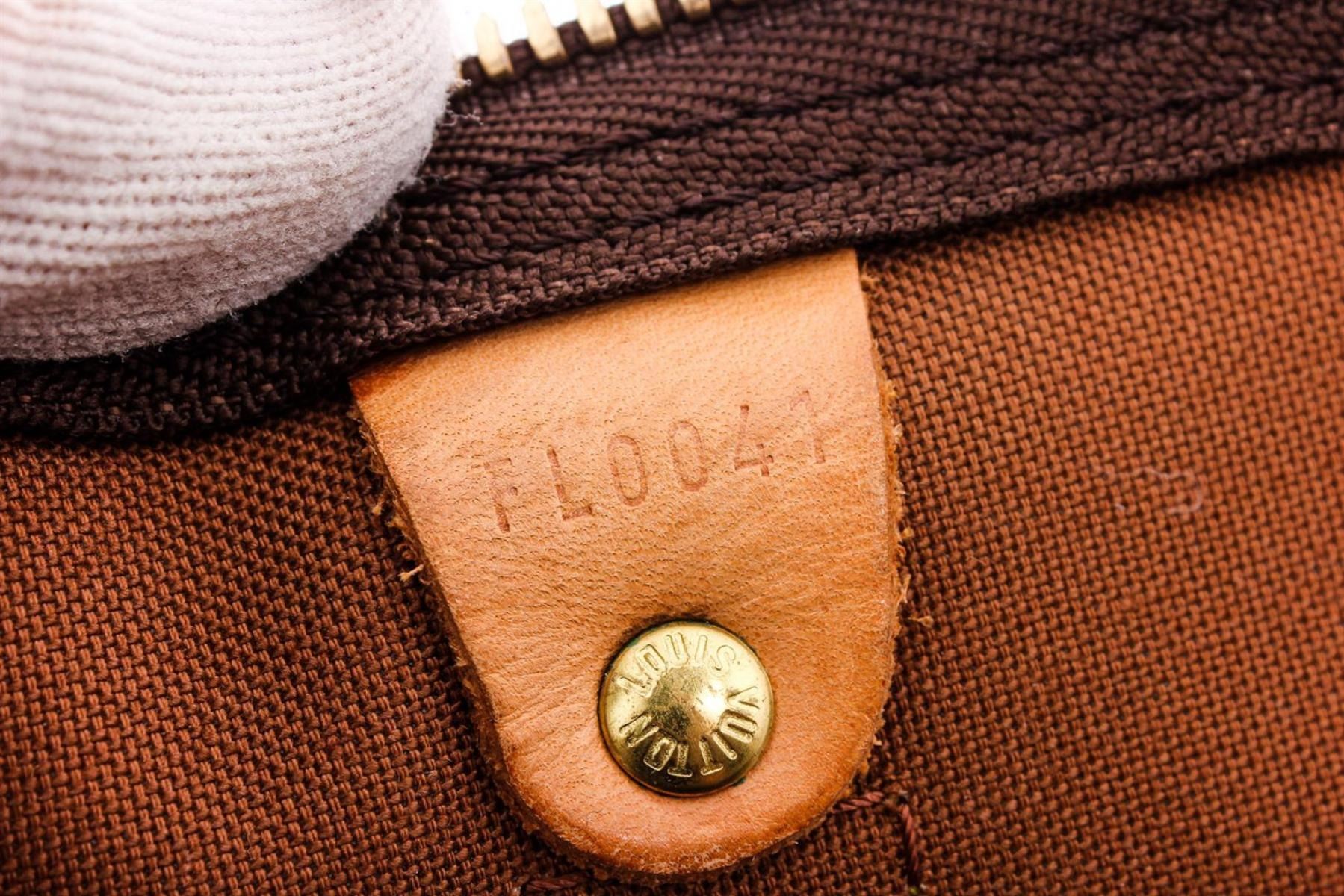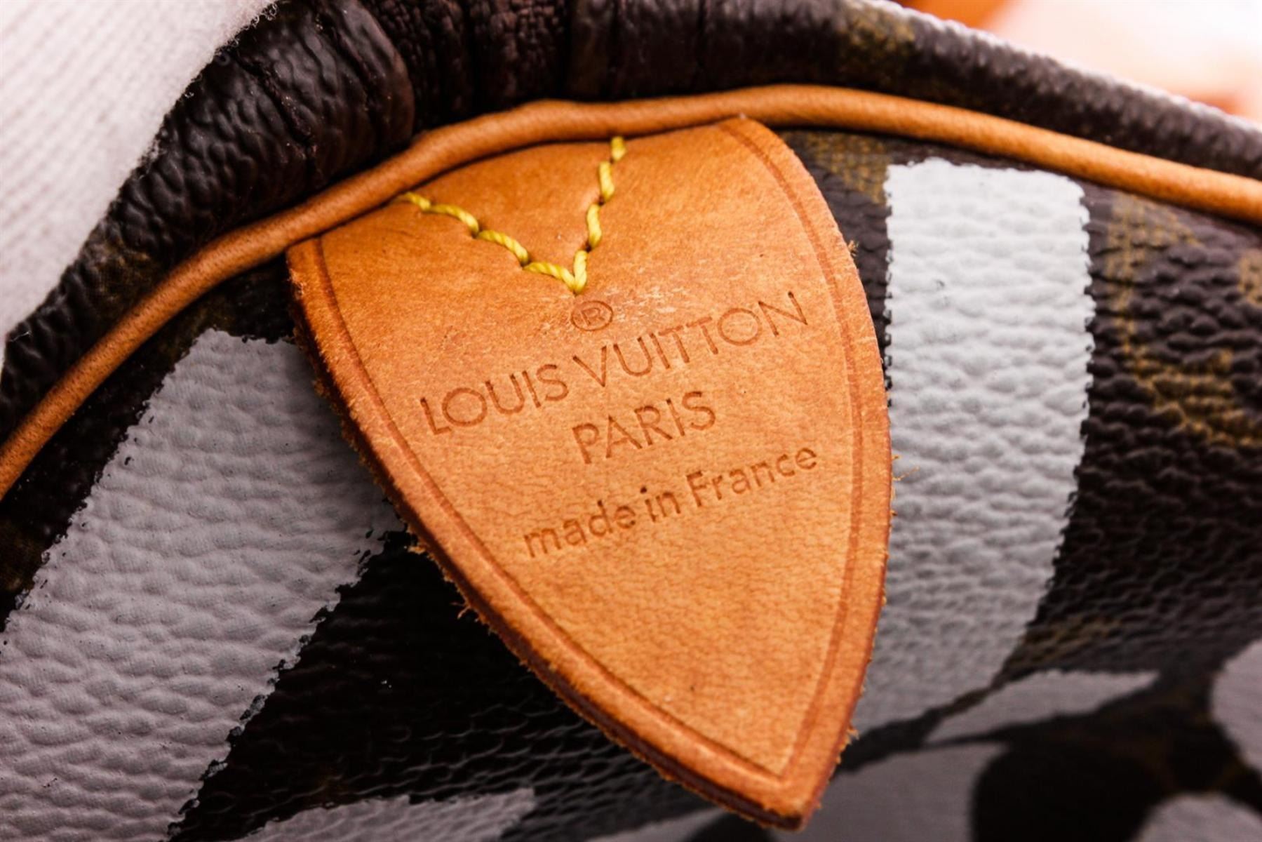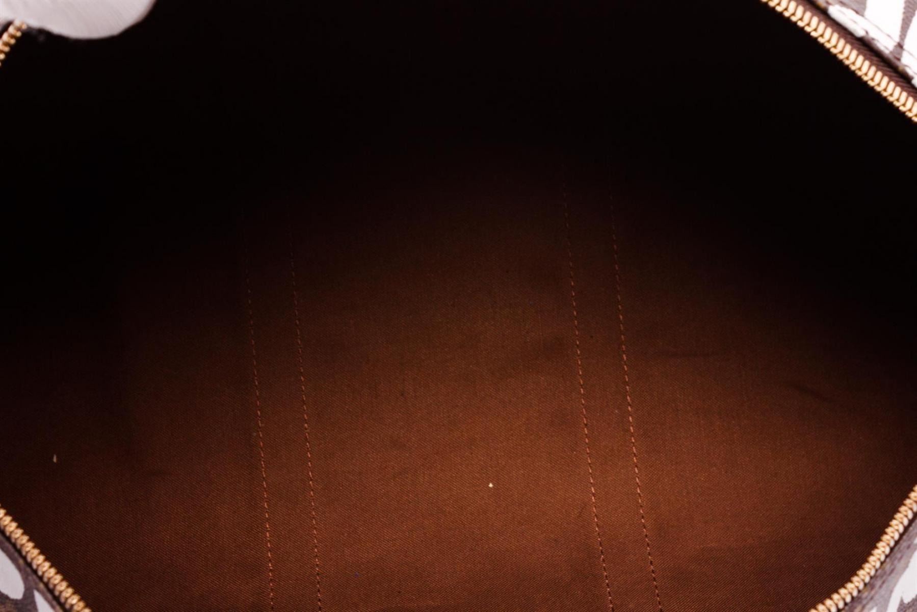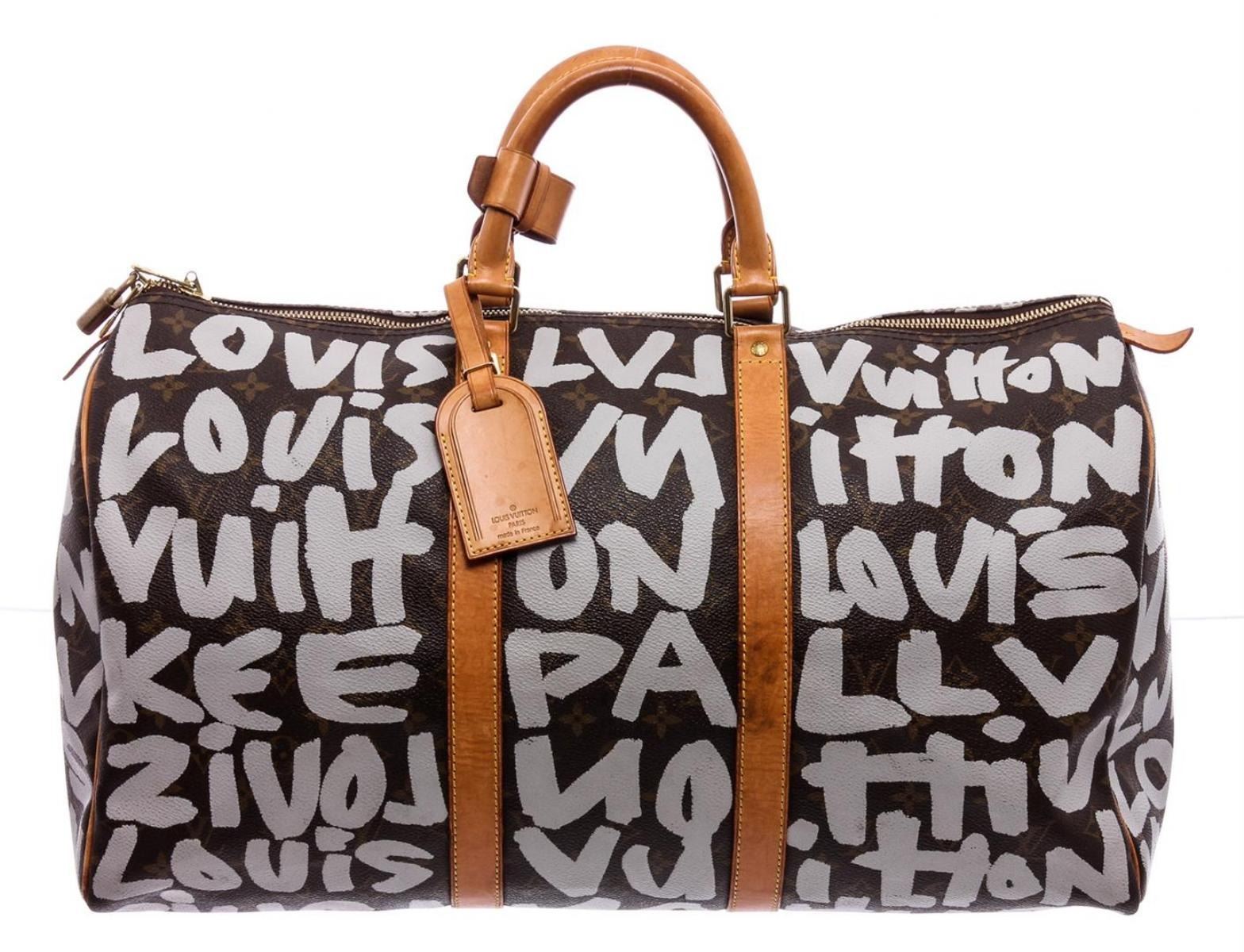 Brown and tan monogram coated canvas Louis Vuitton Keepall 50 with brass hardware, tan vachetta trim, dual rolled top handles, ivory 'Graffiti' motif at exterior, brown canvas interior and dual zip closures at top.