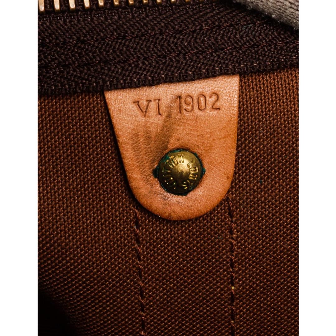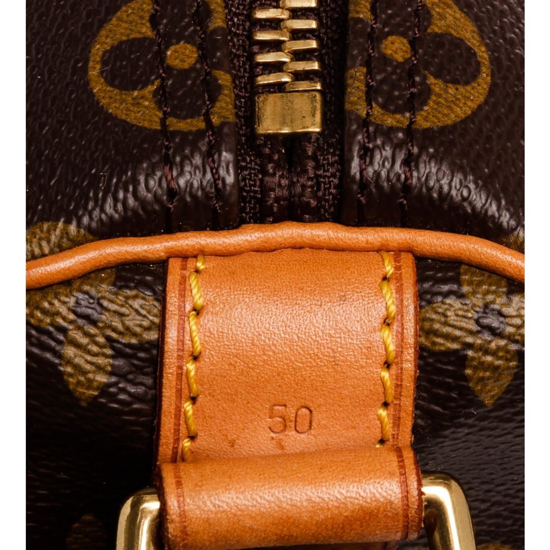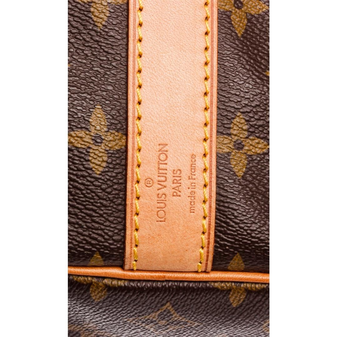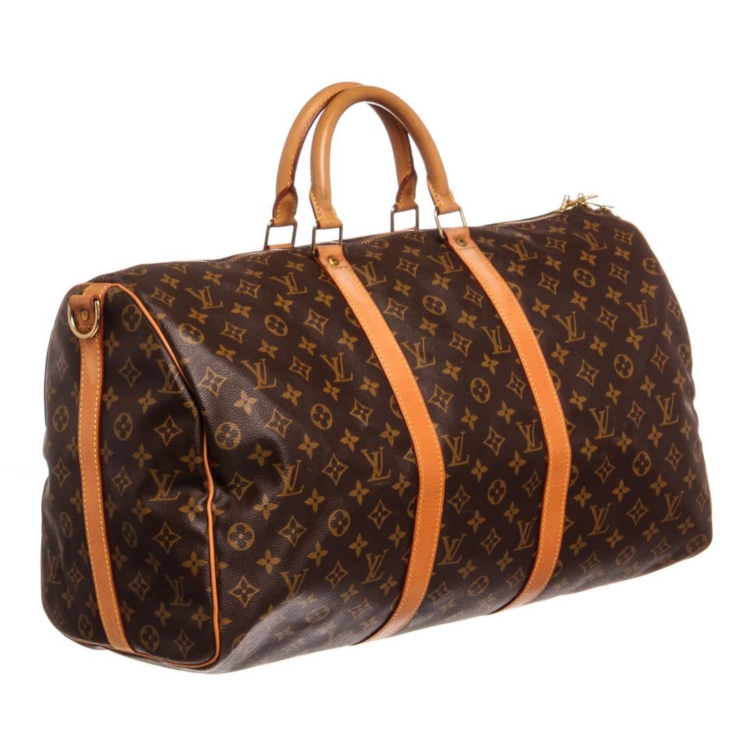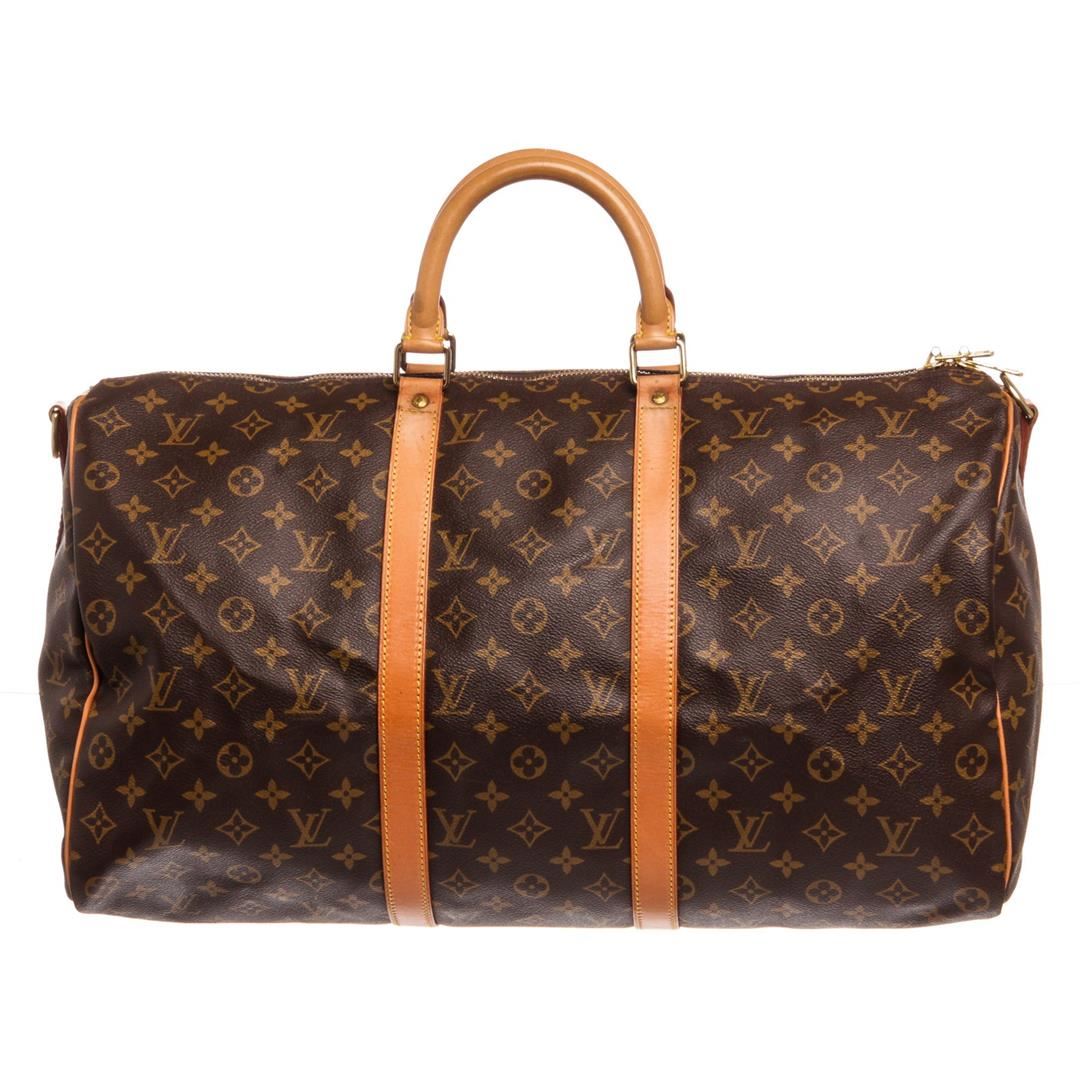 Brown and tan Monogram coated canvas Louis Vuitton Keepall Bandoulière 50 with brass hardware, tan vachetta leather trim, detachable shoulder strap, dual rolled top handles, luggage tag, brown canvas lining, single interior compartment and two-way zip cl
