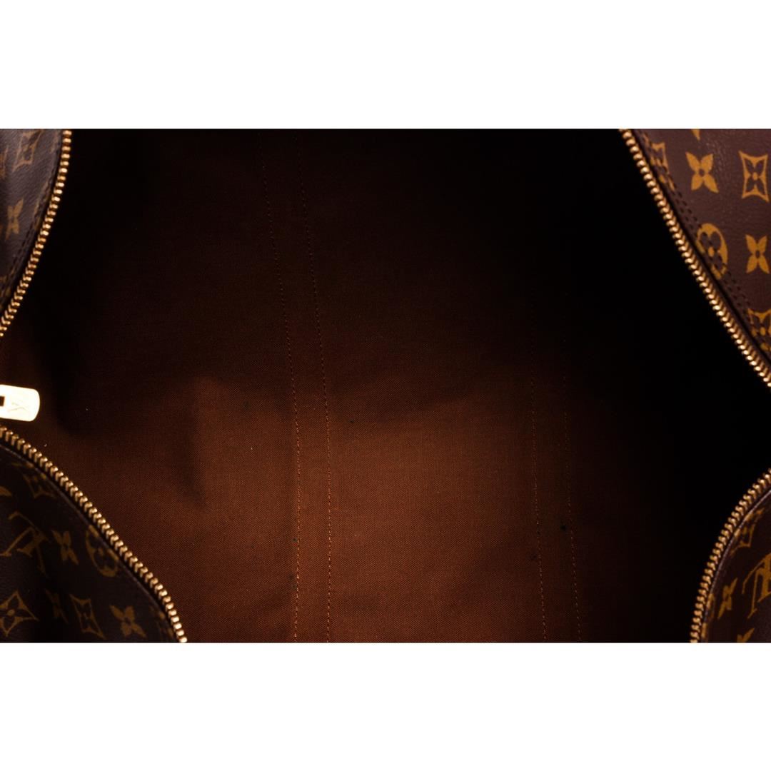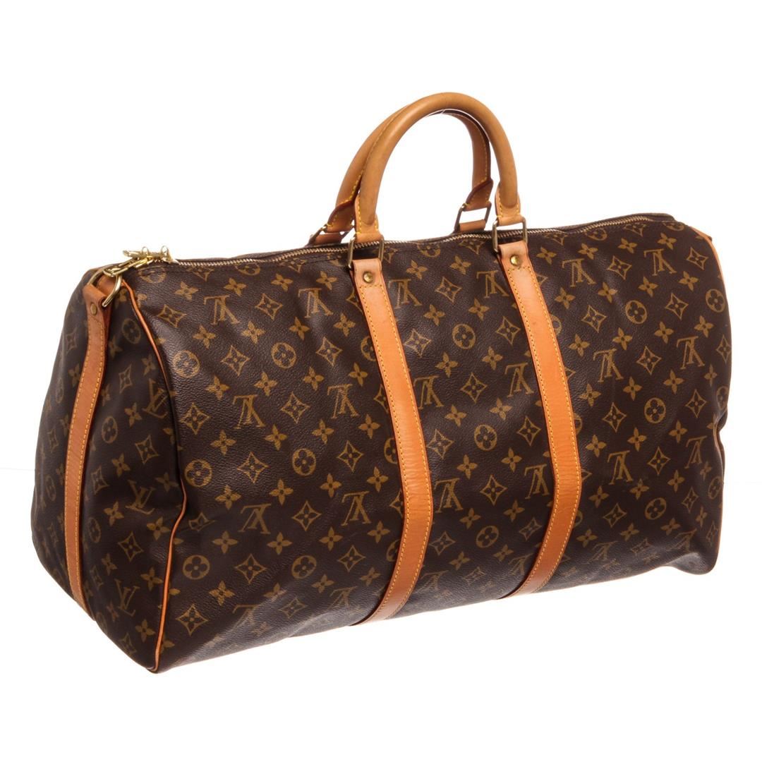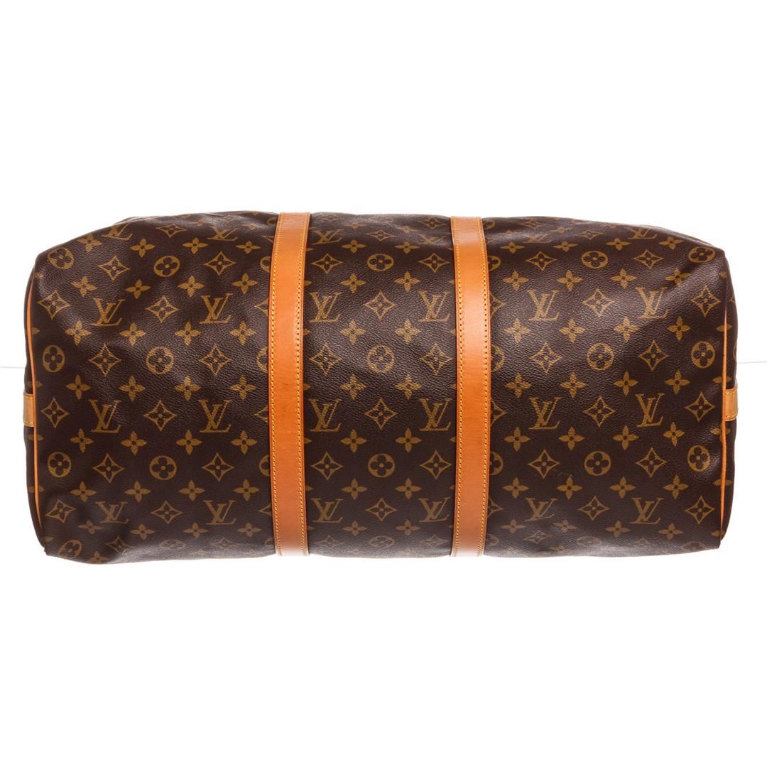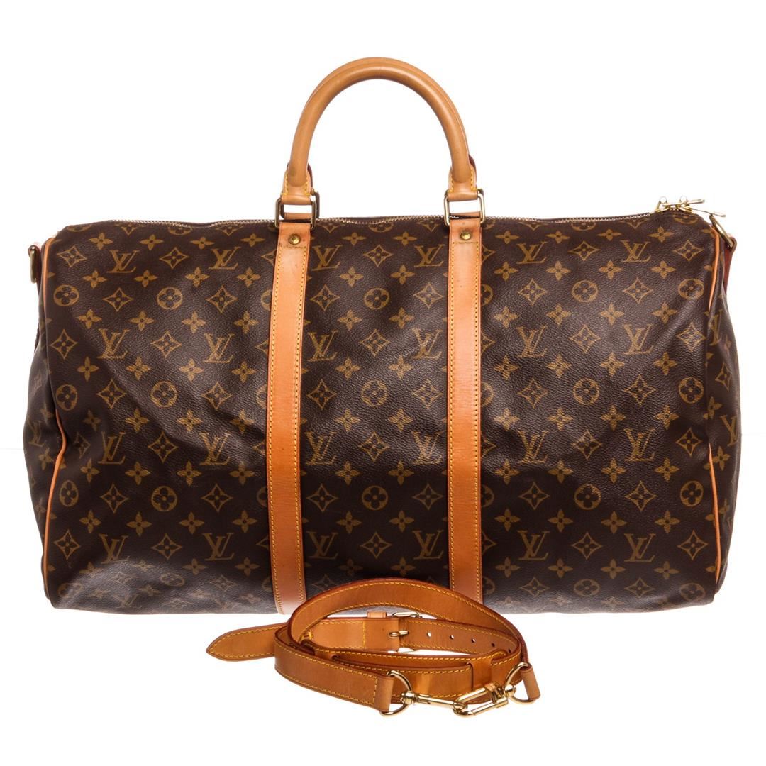 Brown and tan Monogram coated canvas Louis Vuitton Keepall Bandoulière 50 with brass hardware, tan vachetta leather trim, detachable shoulder strap, dual rolled top handles, luggage tag, brown canvas lining, single interior compartment and two-way zip cl