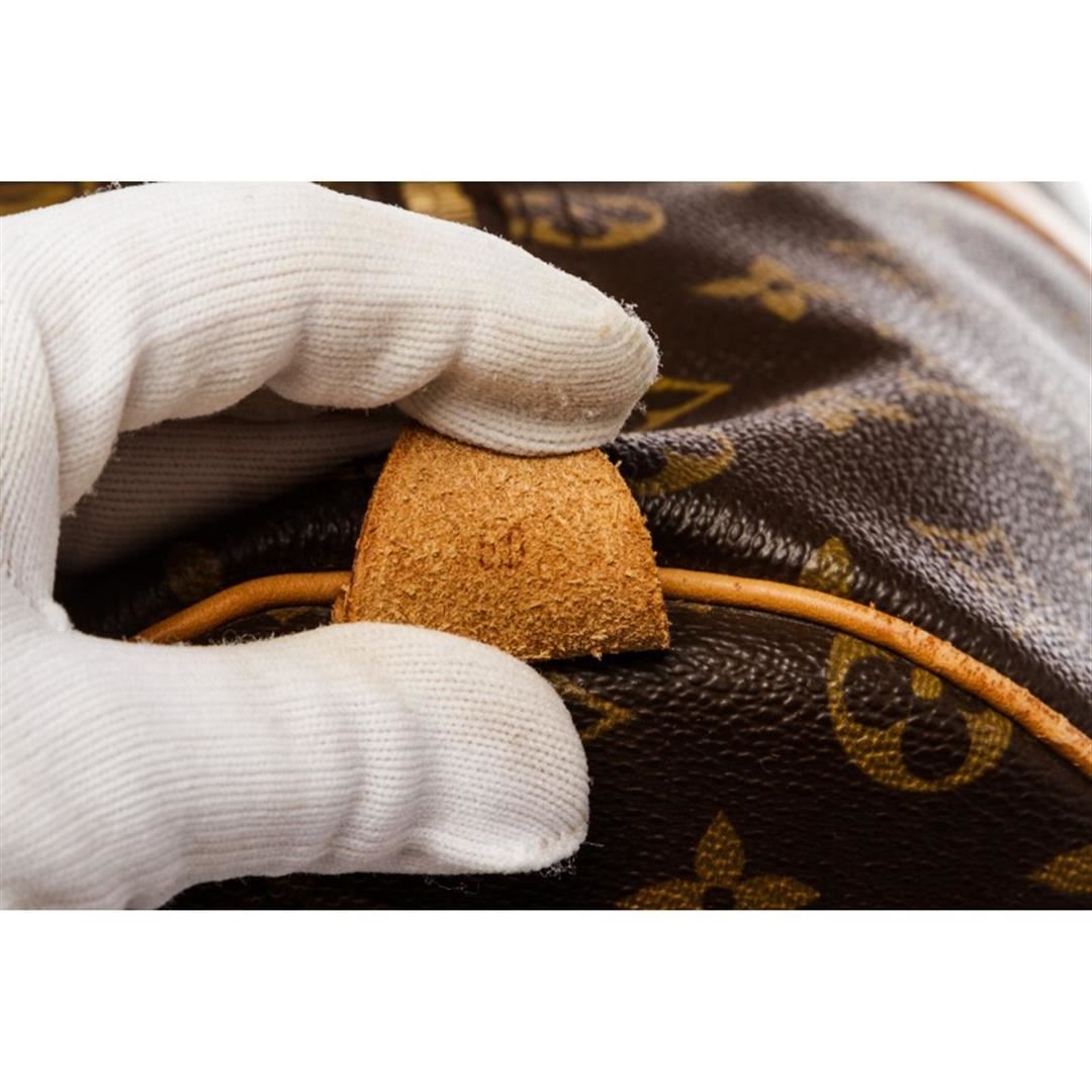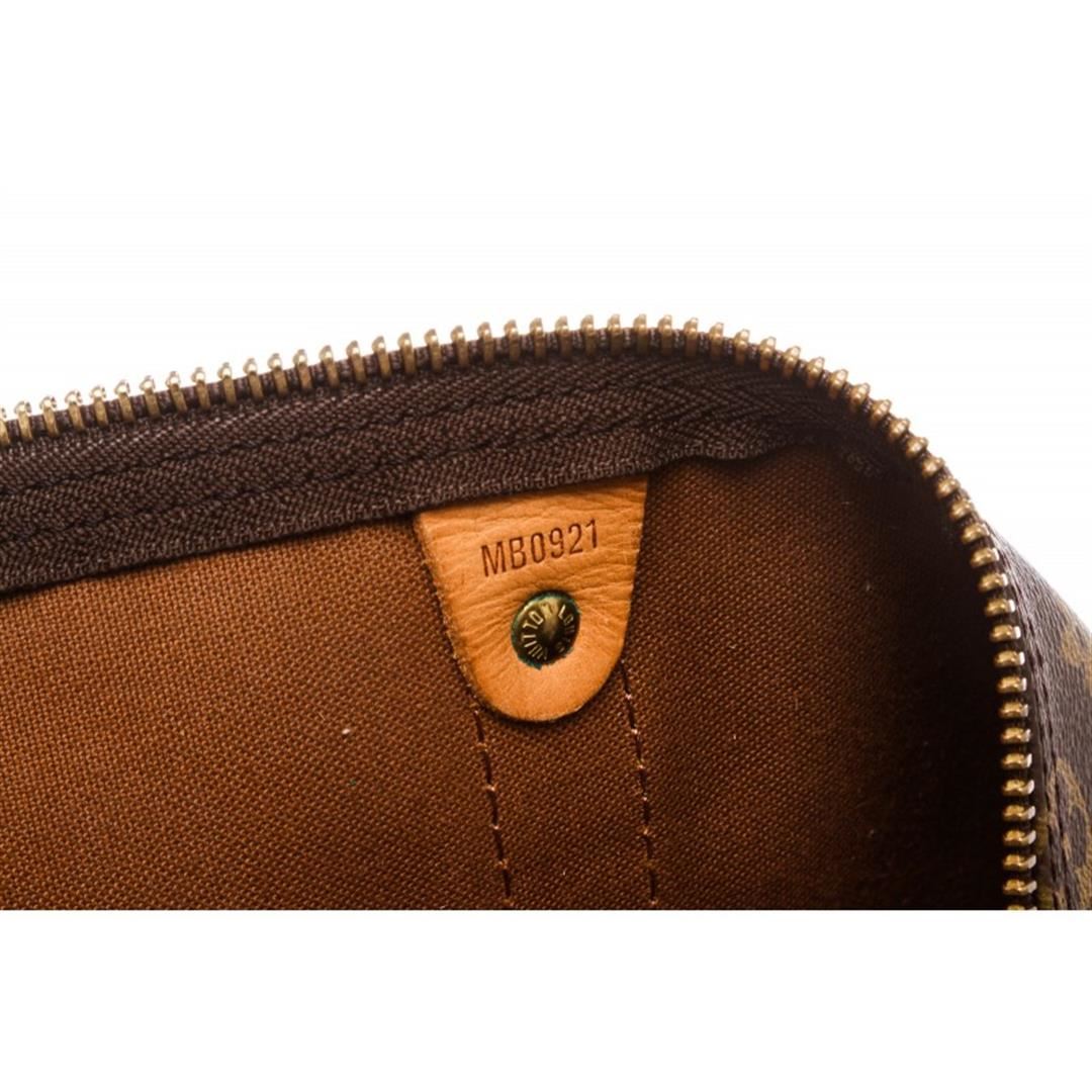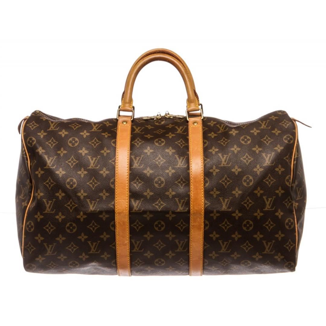 One Louis Vuitton Monogram Canvas Leather Keepall 50 cm Duffle Bag Luggage. Brown and tan monogram coated canvas Louis Vuitton Keepall 50 with vachetta leather trim, brass hardware, two rolled top handles, canvas interior lining and two-way zip closure at