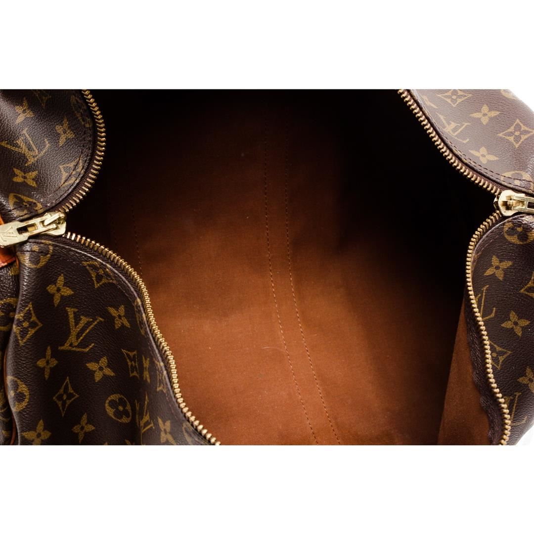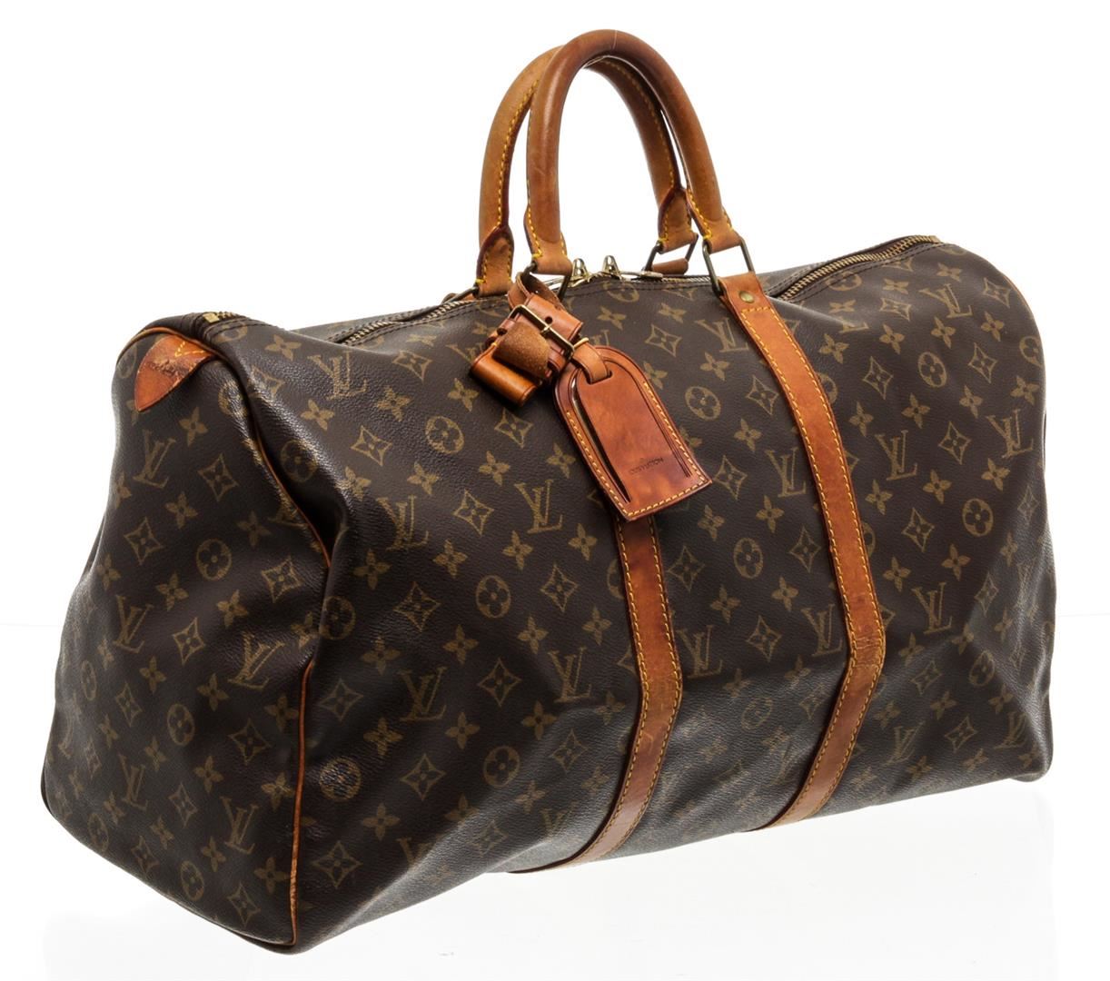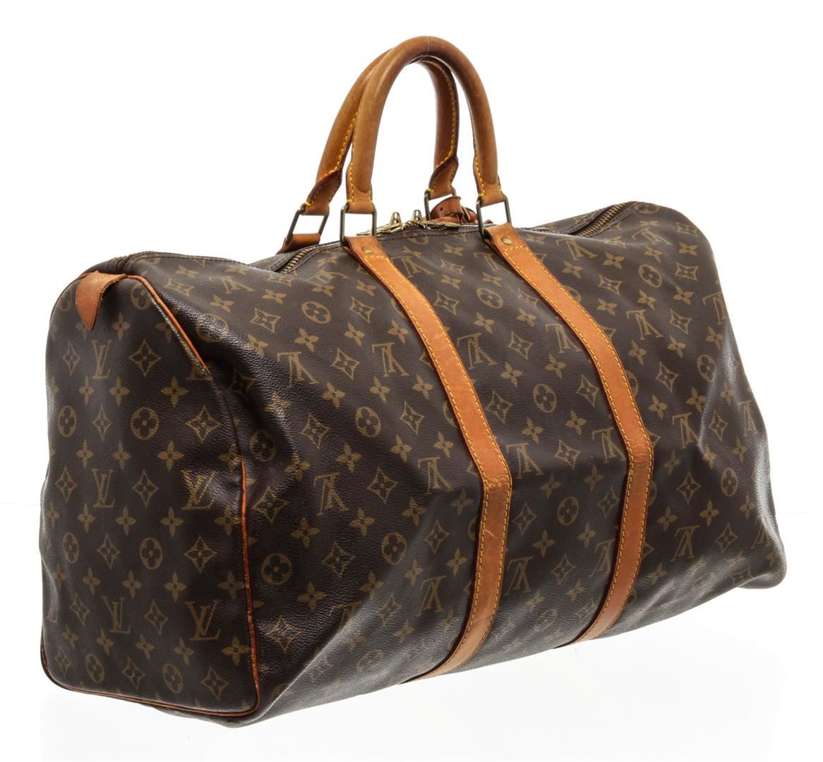 Brown and tan monogram coated canvas Louis Vuitton Keepall 50 with vachetta leather trim, brass hardware, two rolled top handles, canvas interior lining and two-way zip closure at top.