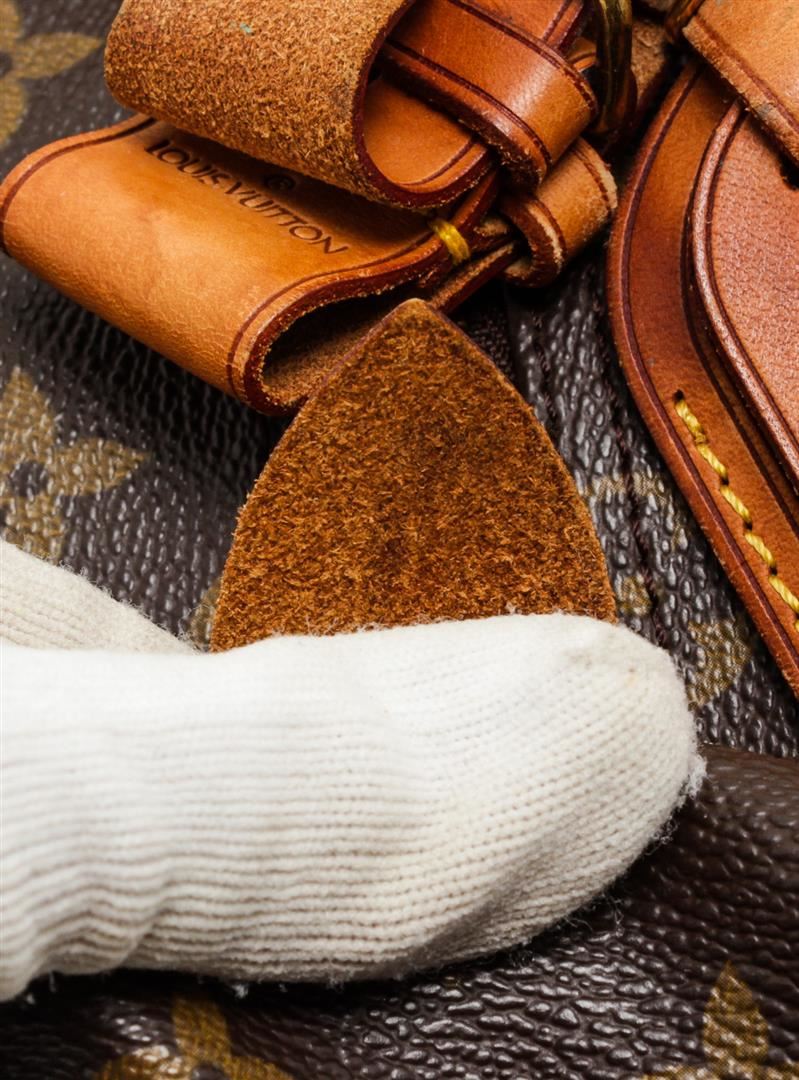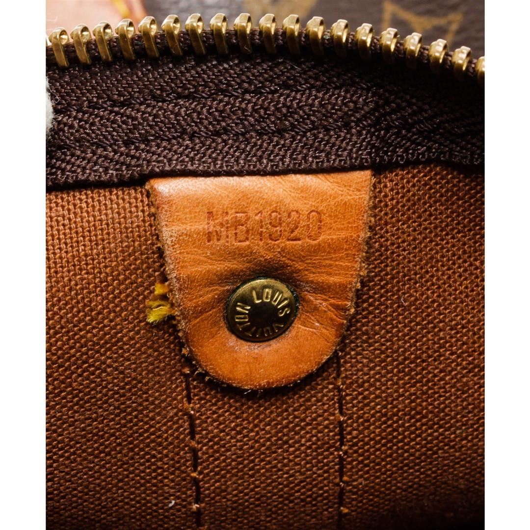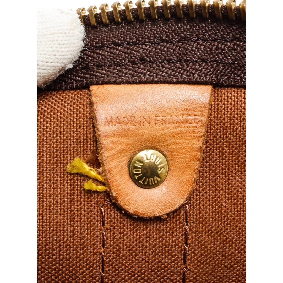 Brown and tan monogram coated canvas Louis Vuitton Keepall 50 with vachetta leather trim, brass hardware, two rolled top handles, canvas interior lining and two-way zip closure at top.