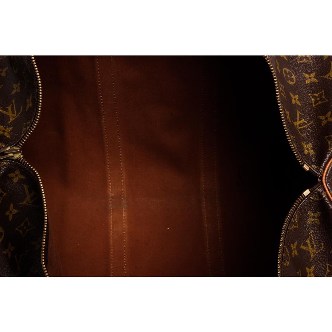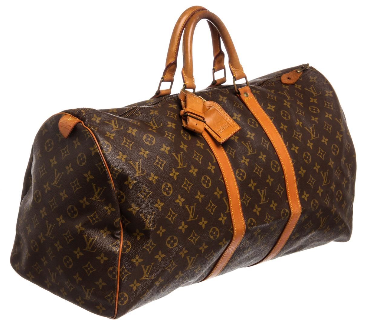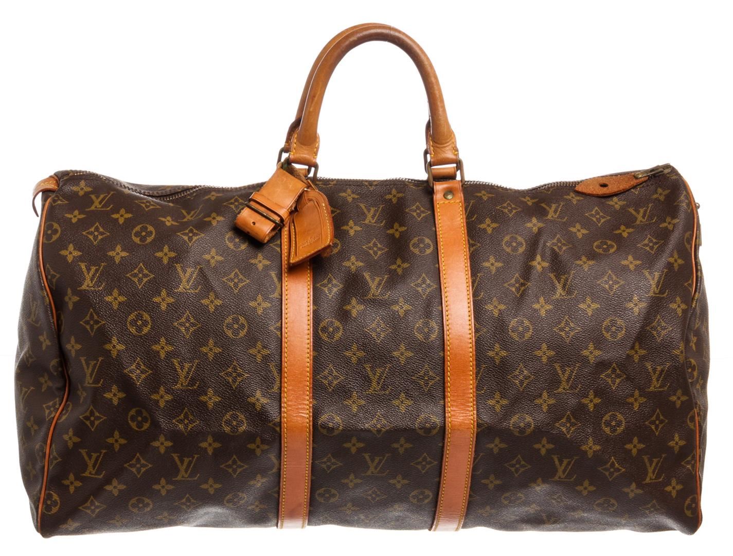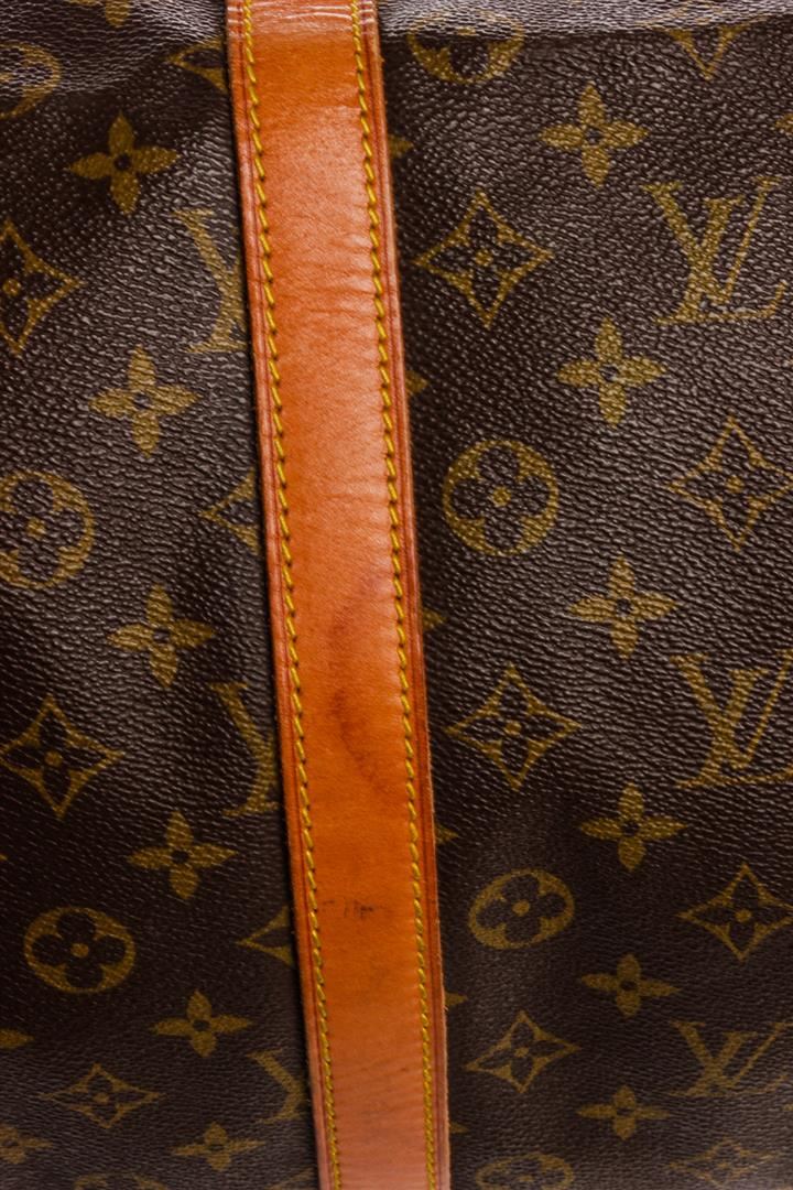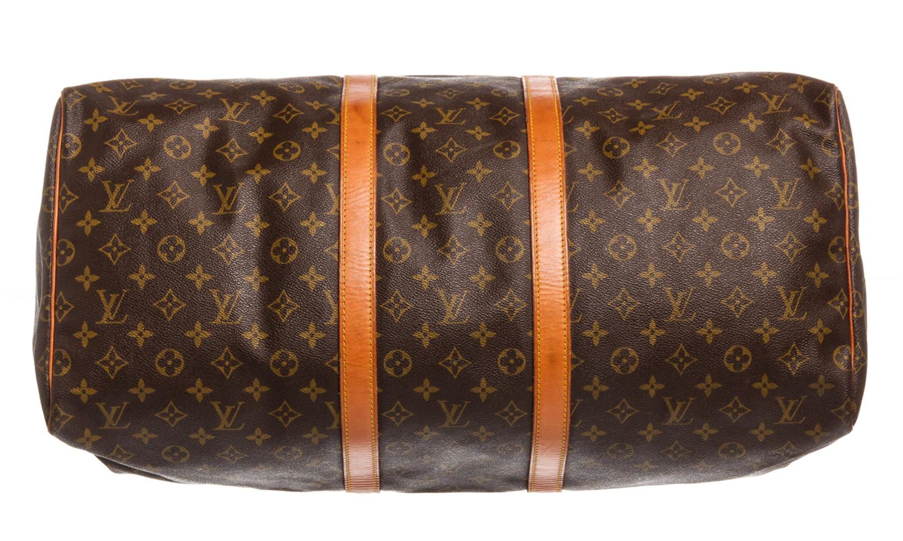Brown and tan monogram coated canvas Louis Vuitton Keepall 55 with brass hardware, tan vachetta leather trim featuring yellow contrast stitching, dual rolled top handles, luggage tag, brown canvas lining and zip closure at top.