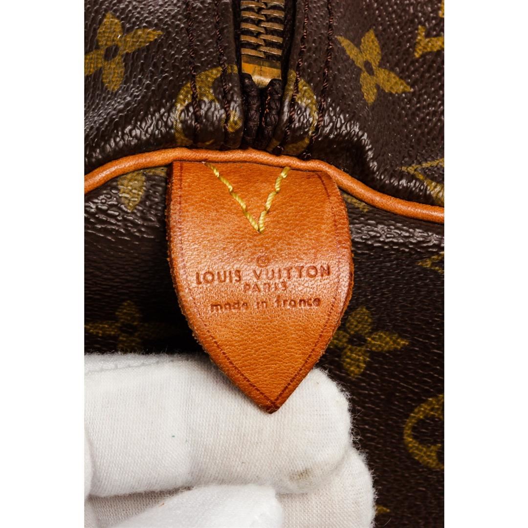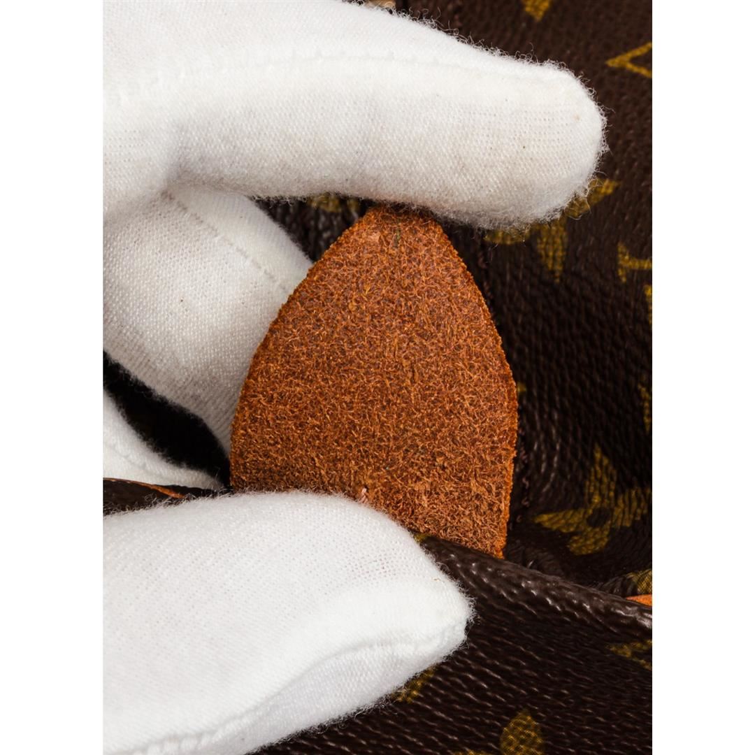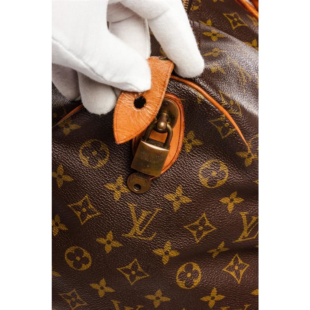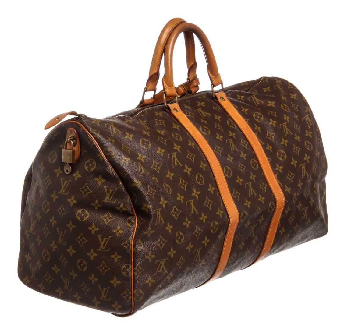 Brown and tan monogram coated canvas Louis Vuitton Keepall 55 with brass hardware, tan vachetta leather trim featuring yellow contrast stitching, dual rolled top handles, luggage tag, brown canvas lining and zip closure at top.