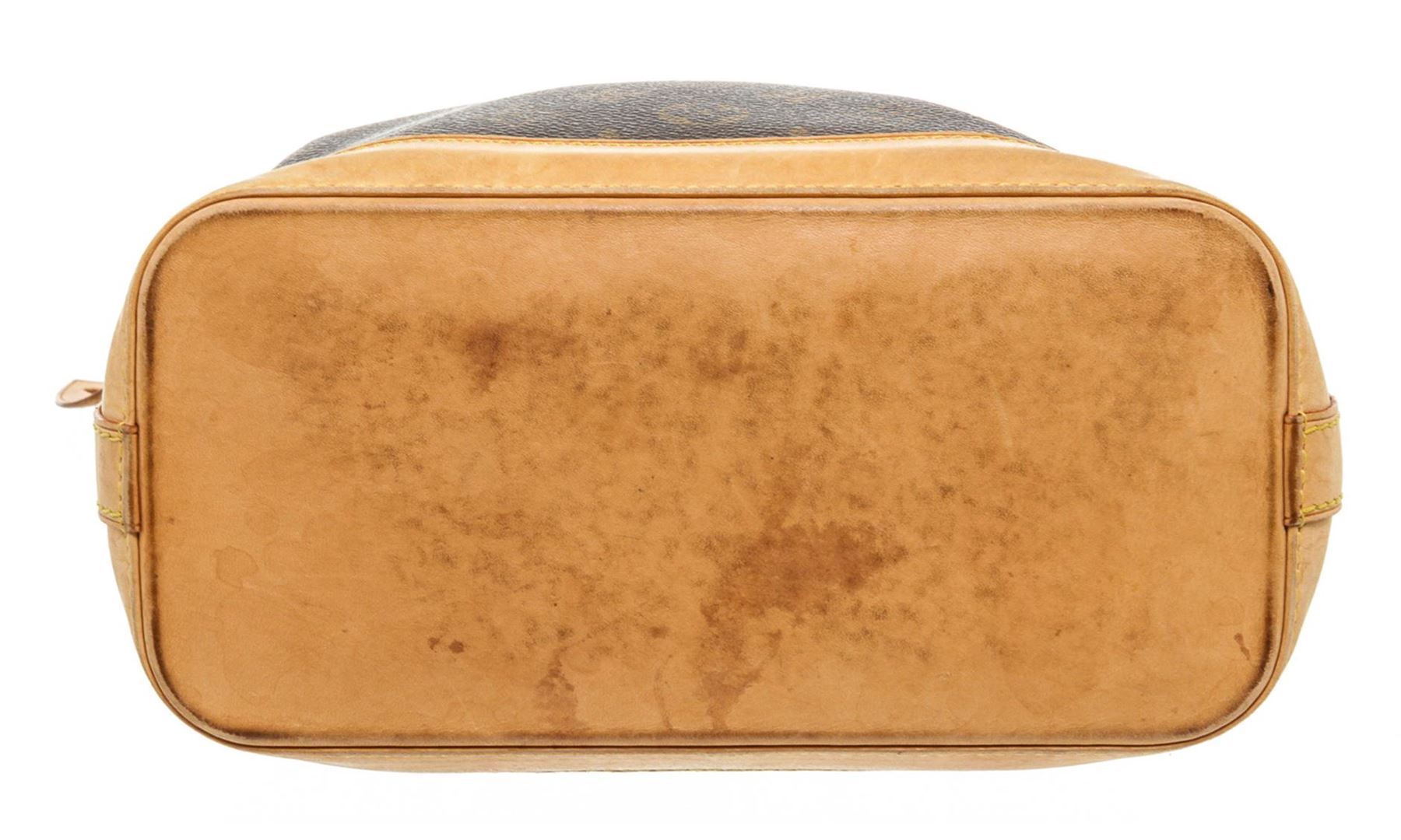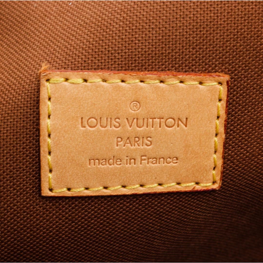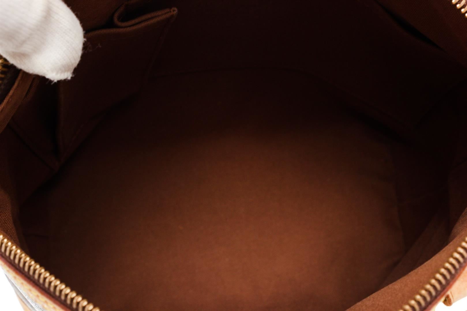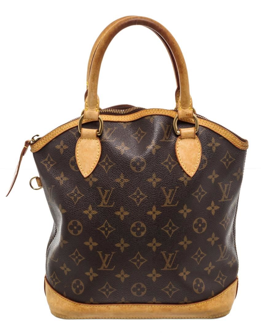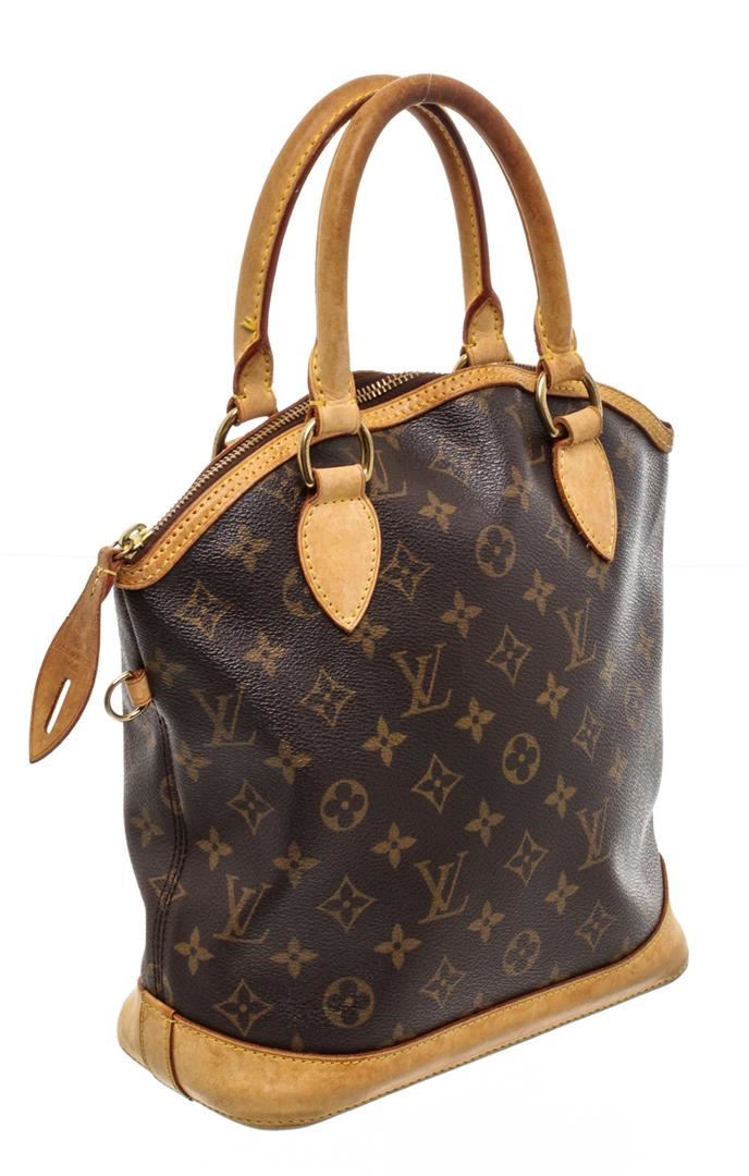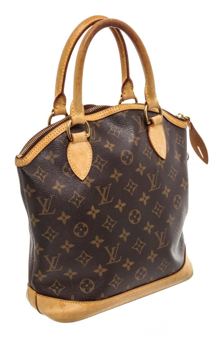 Brown and tan monogram coated canvas Louis Vuitton Monogram Lockit Vertical PM with brass hardware, tan Vachetta leather trim, yellow stitching, dual rolled top handles, brown canvas lining, dual pockets at interior walls and zip closure at top. Authentic.