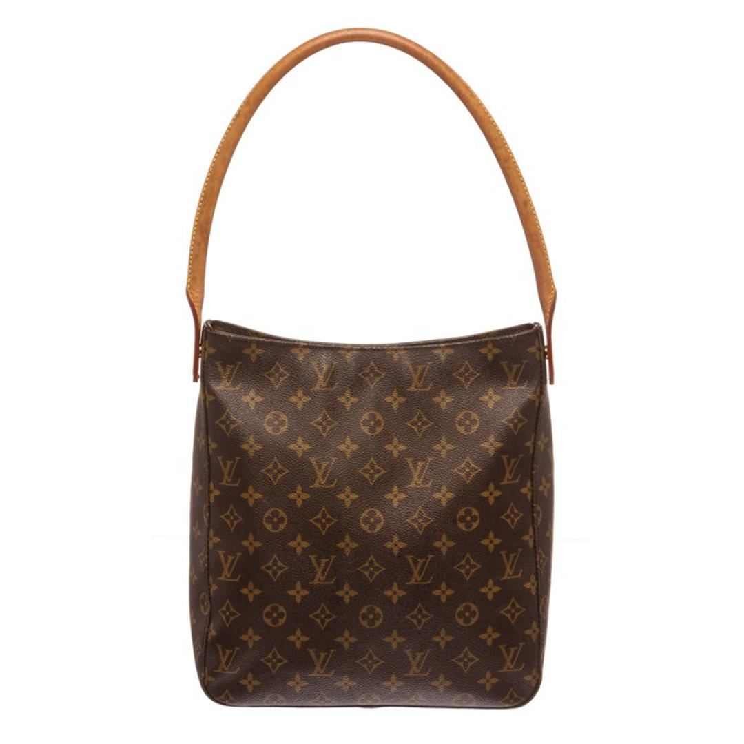 Brown and tan monogram coated canvas Louis Vuitton Looping GM with brass hardware, cinnamon vachetta leather trim, single rolled shoulder strap, beige Alcantara lining, dual pockets at interior walls; one with zip closure and zip closure at top. Item is pre-owned.