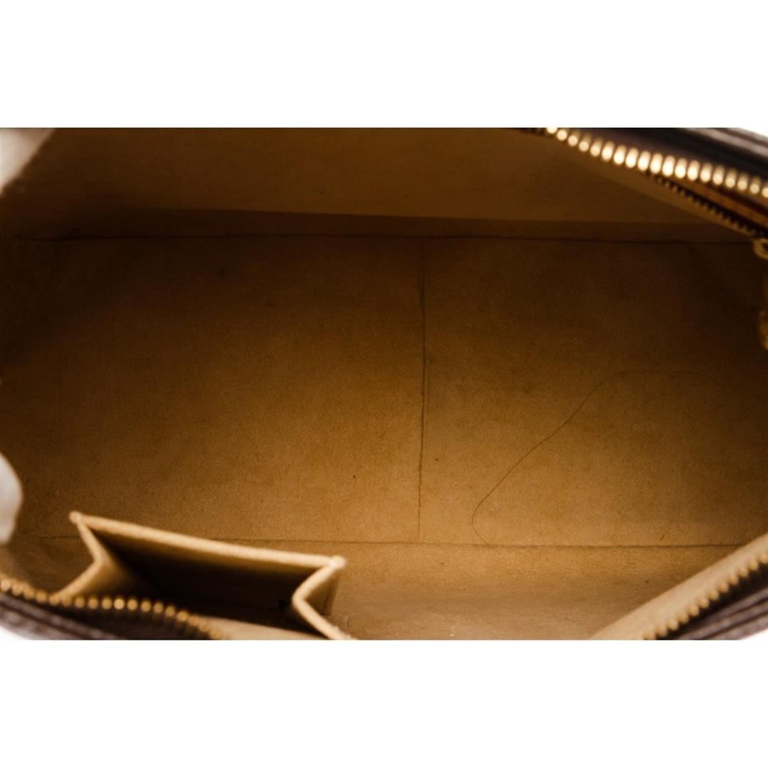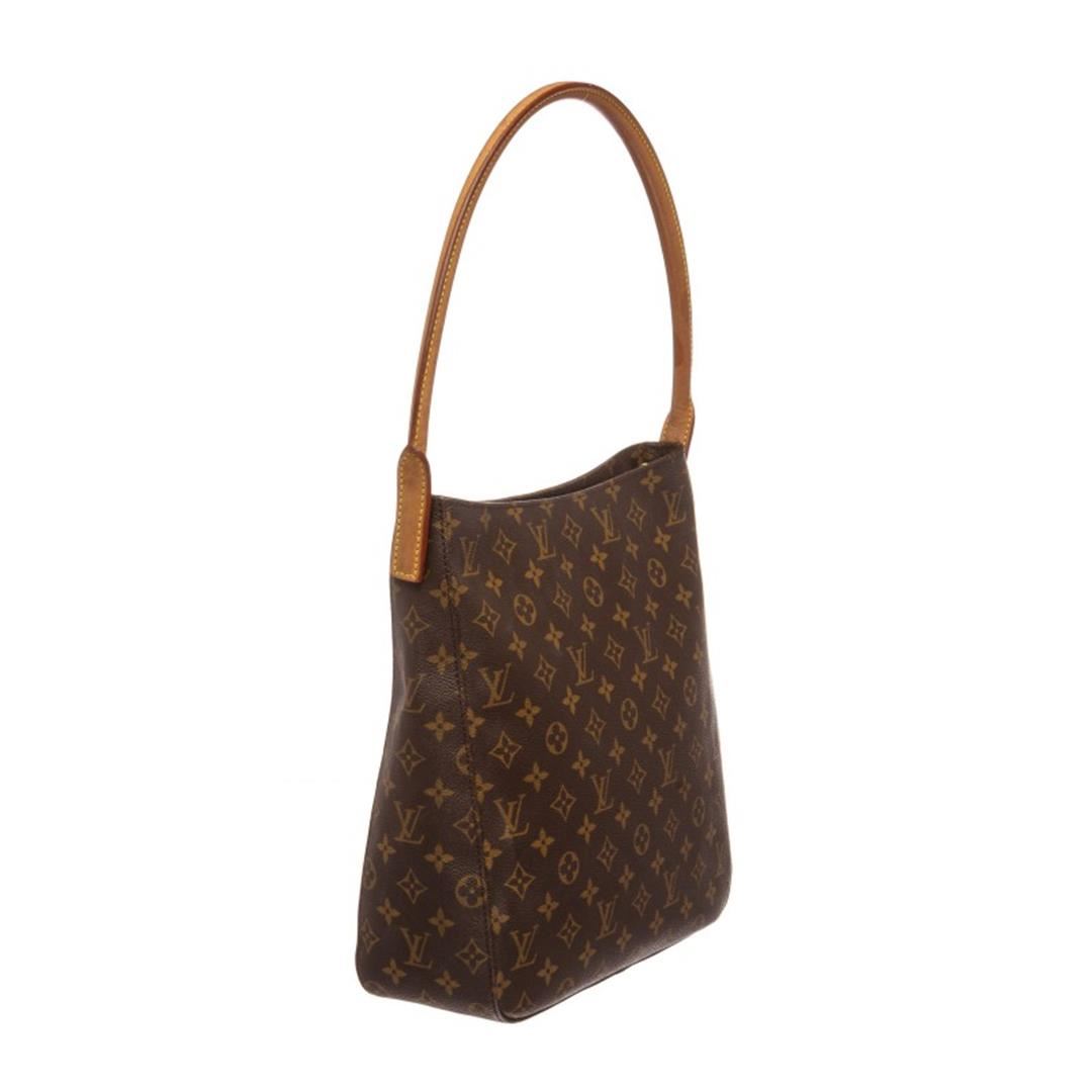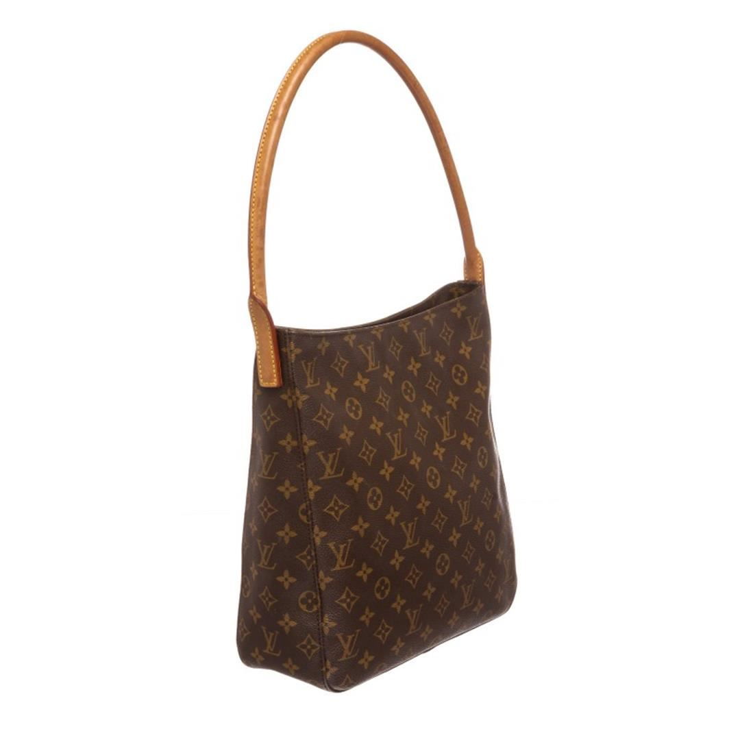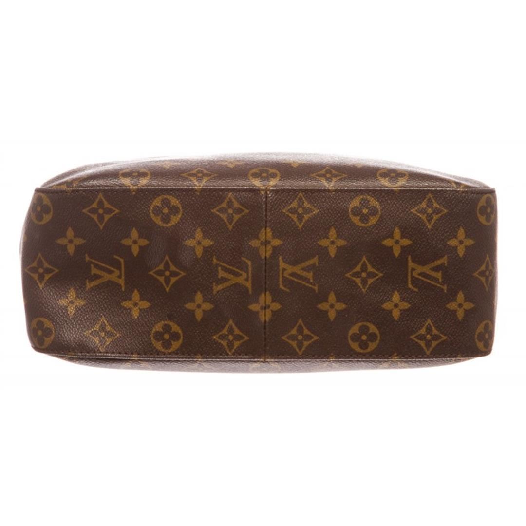 Brown and tan monogram coated canvas Louis Vuitton Looping GM with brass hardware, cinnamon vachetta leather trim, single rolled shoulder strap, beige Alcantara lining, dual pockets at interior walls; one with zip closure and zip closure at top. Item is pre-owned.