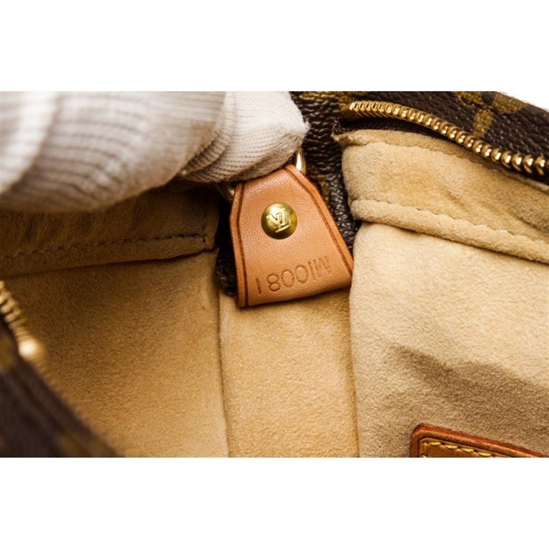 Brown and tan monogram coated canvas Louis Vuitton Looping GM with brass hardware, cinnamon vachetta leather trim, single rolled shoulder strap, beige Alcantara lining, dual pockets at interior walls; one with zip closure and zip closure at top. Item is Pre-Owned.