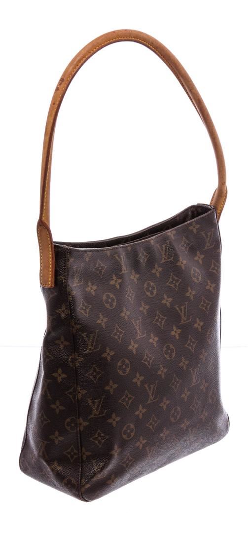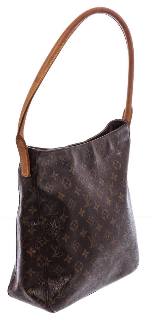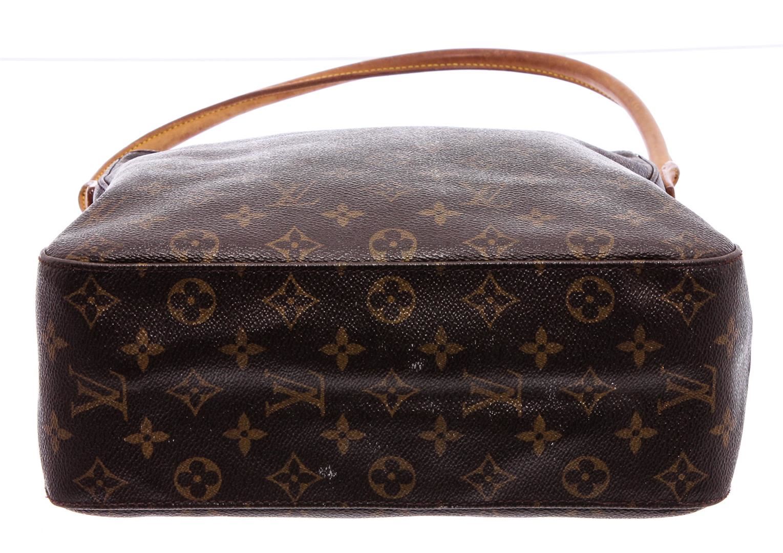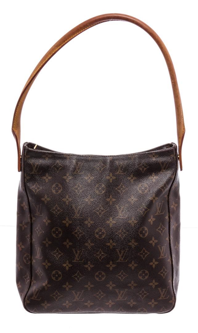 One Louis Vuitton Monogram Canvas Leather Looping GM Shoulder Bag. Brown and tan monogram coated canvas Louis Vuitton Looping GM with brass hardware, cinnamon vachetta leather trim, single rolled shoulder strap, beige Alcantara lining, dual pockets at interior walls; one with zip closure and zip closure at top.