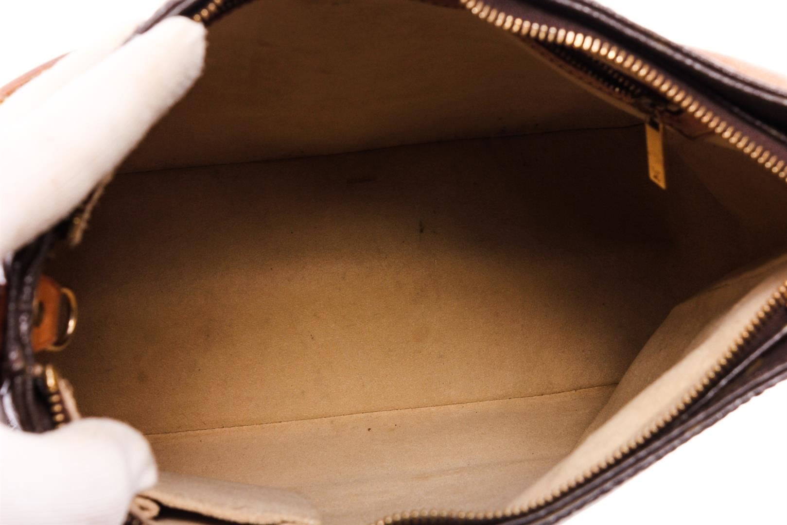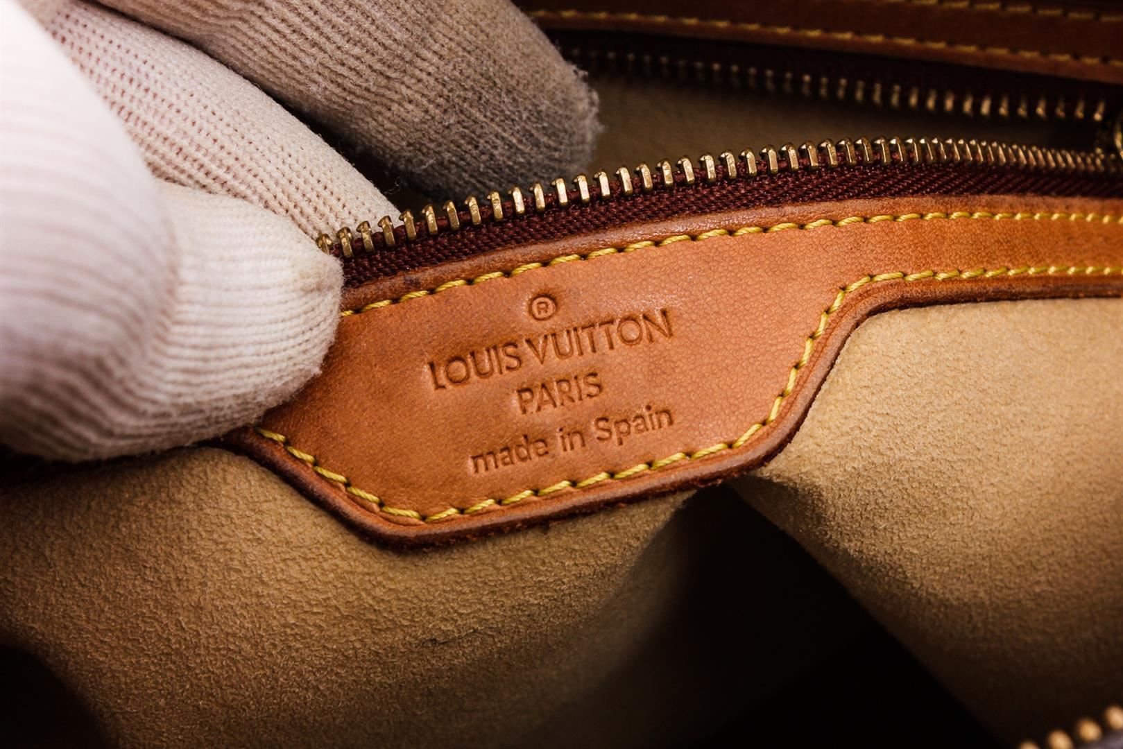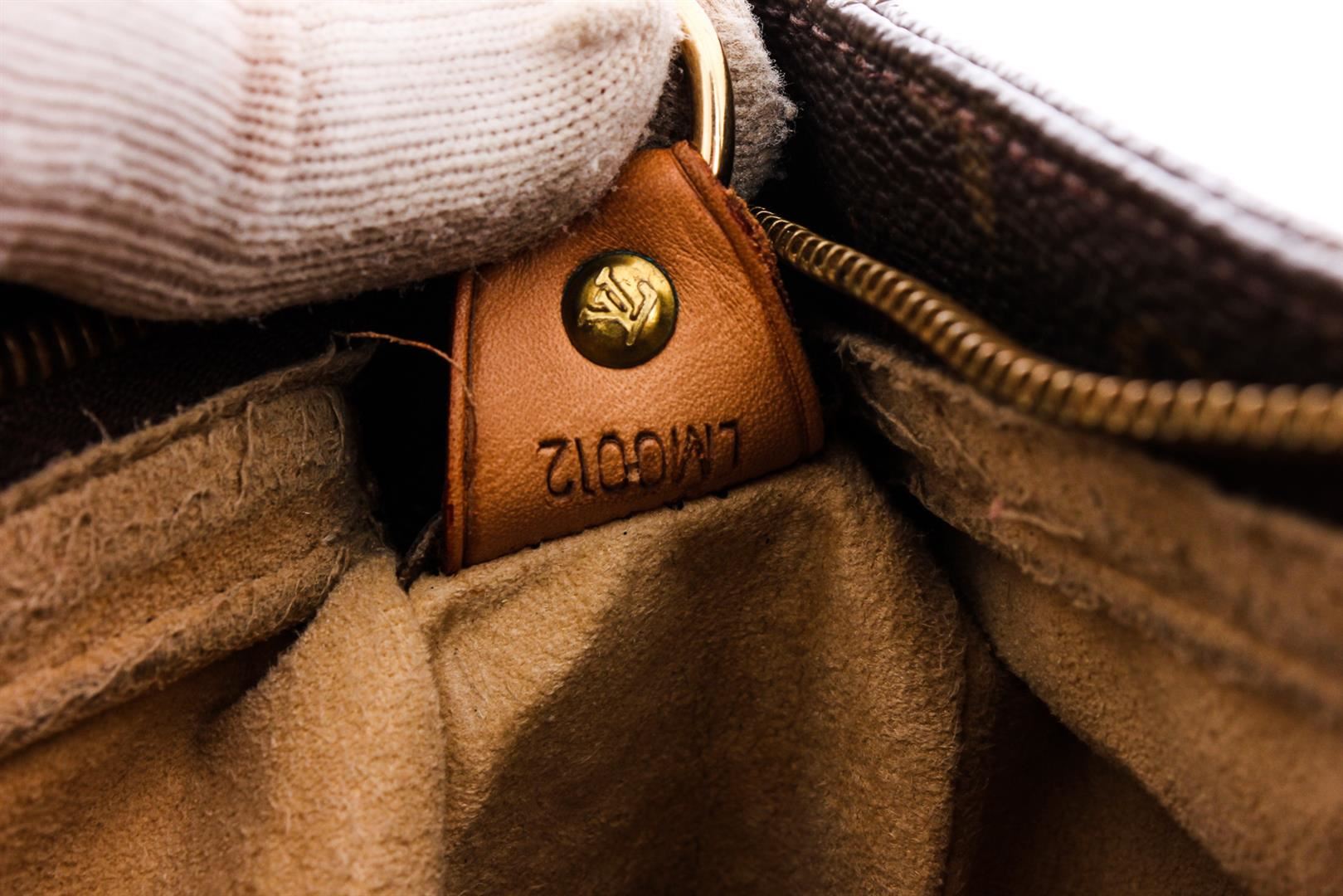 One Louis Vuitton Monogram Canvas Leather Looping GM Shoulder Bag. Brown and tan monogram coated canvas Louis Vuitton Looping GM with brass hardware, cinnamon vachetta leather trim, single rolled shoulder strap, beige Alcantara lining, dual pockets at interior walls; one with zip closure and zip closure at top.