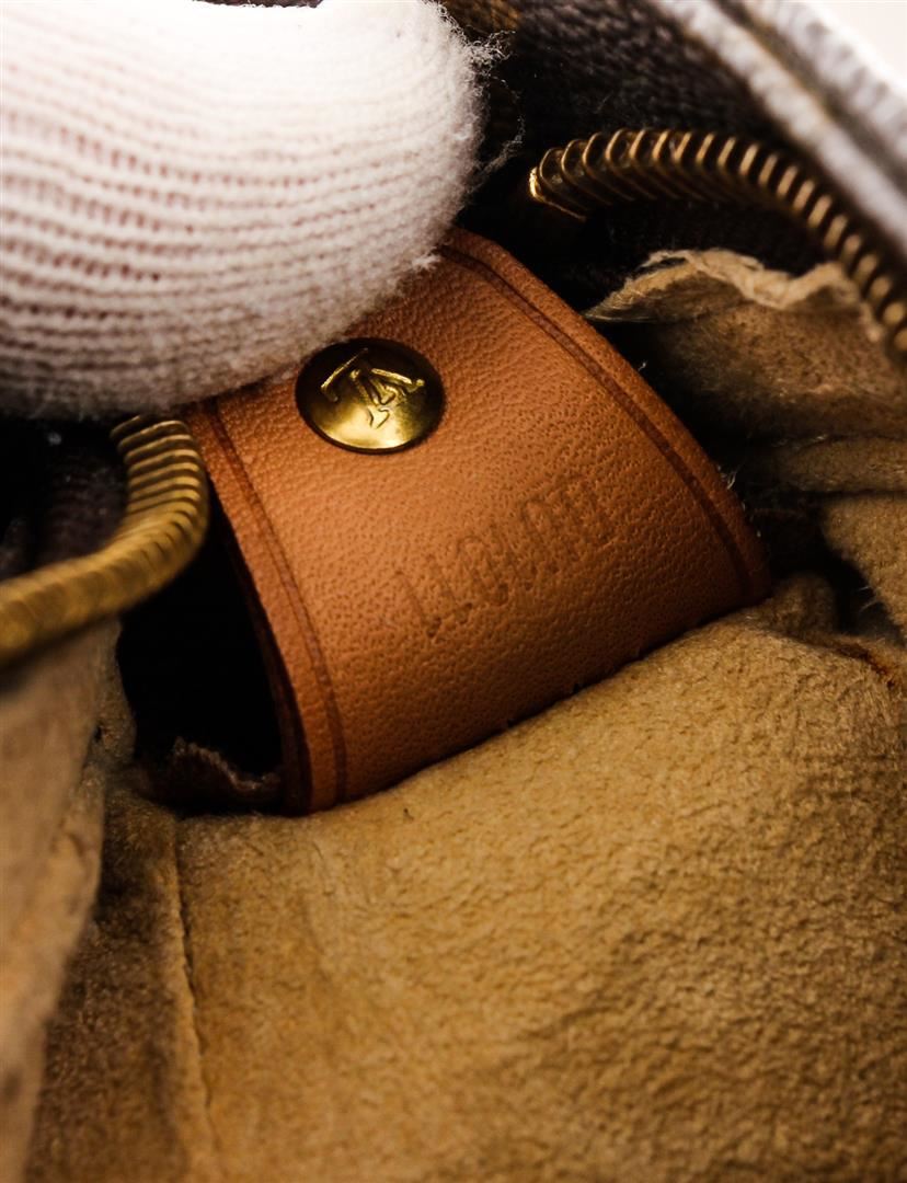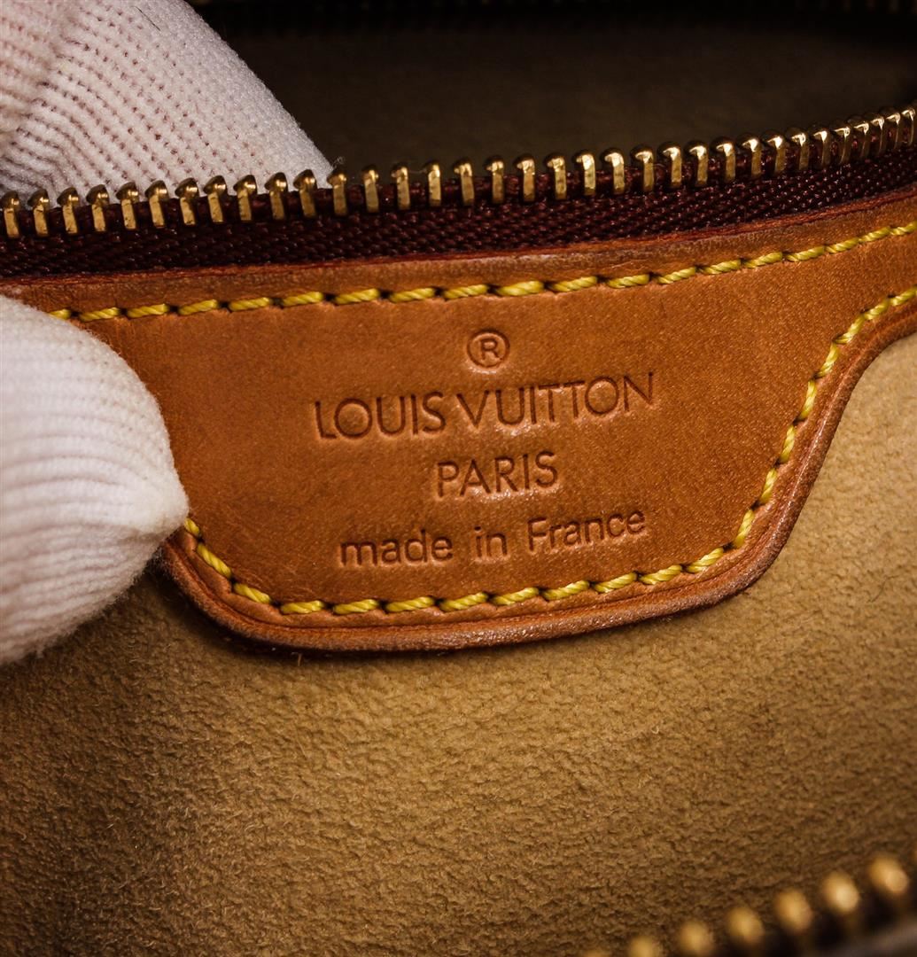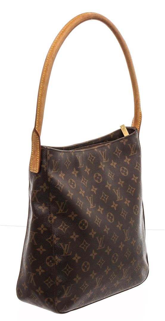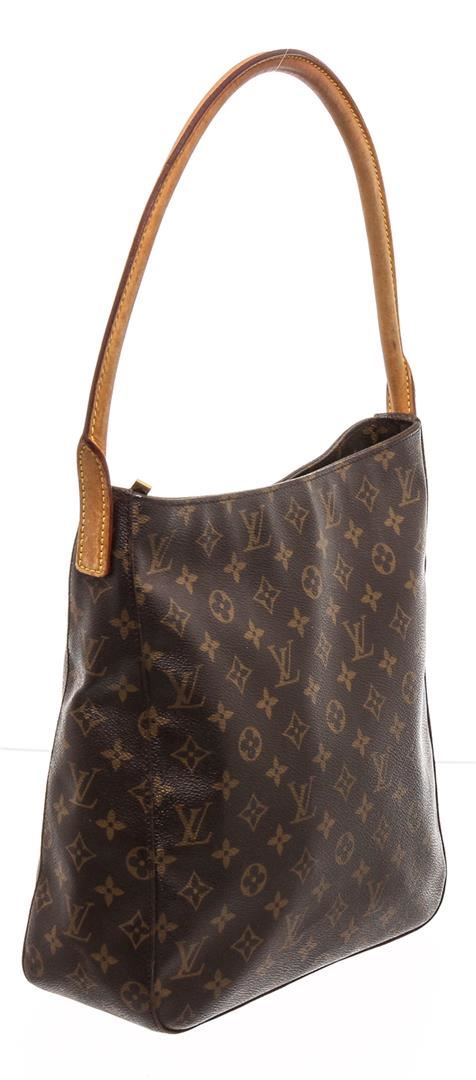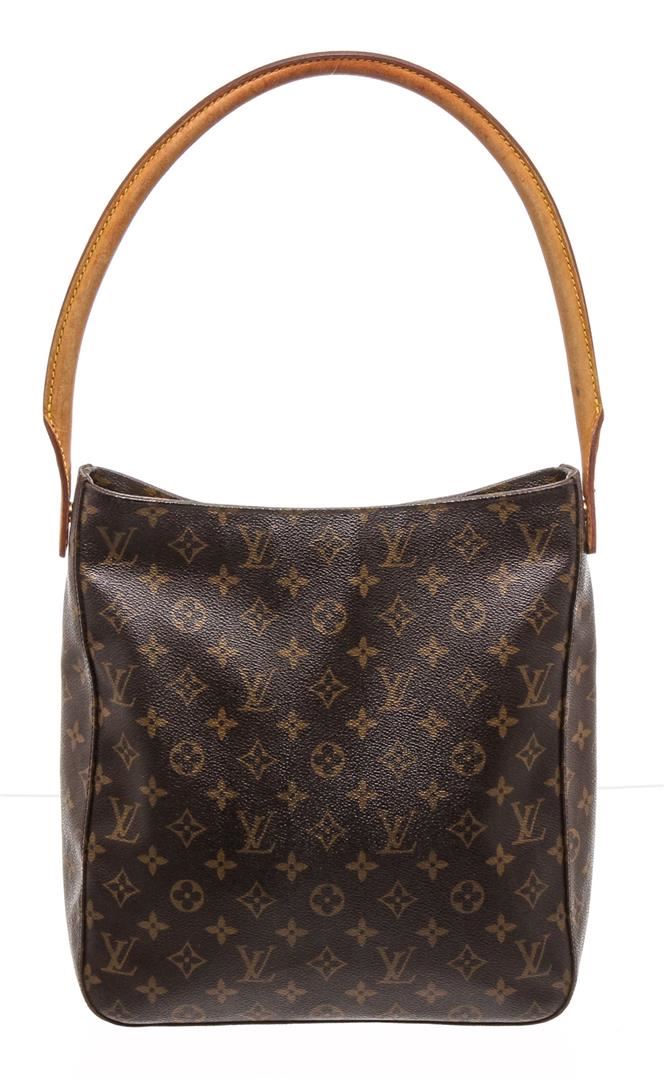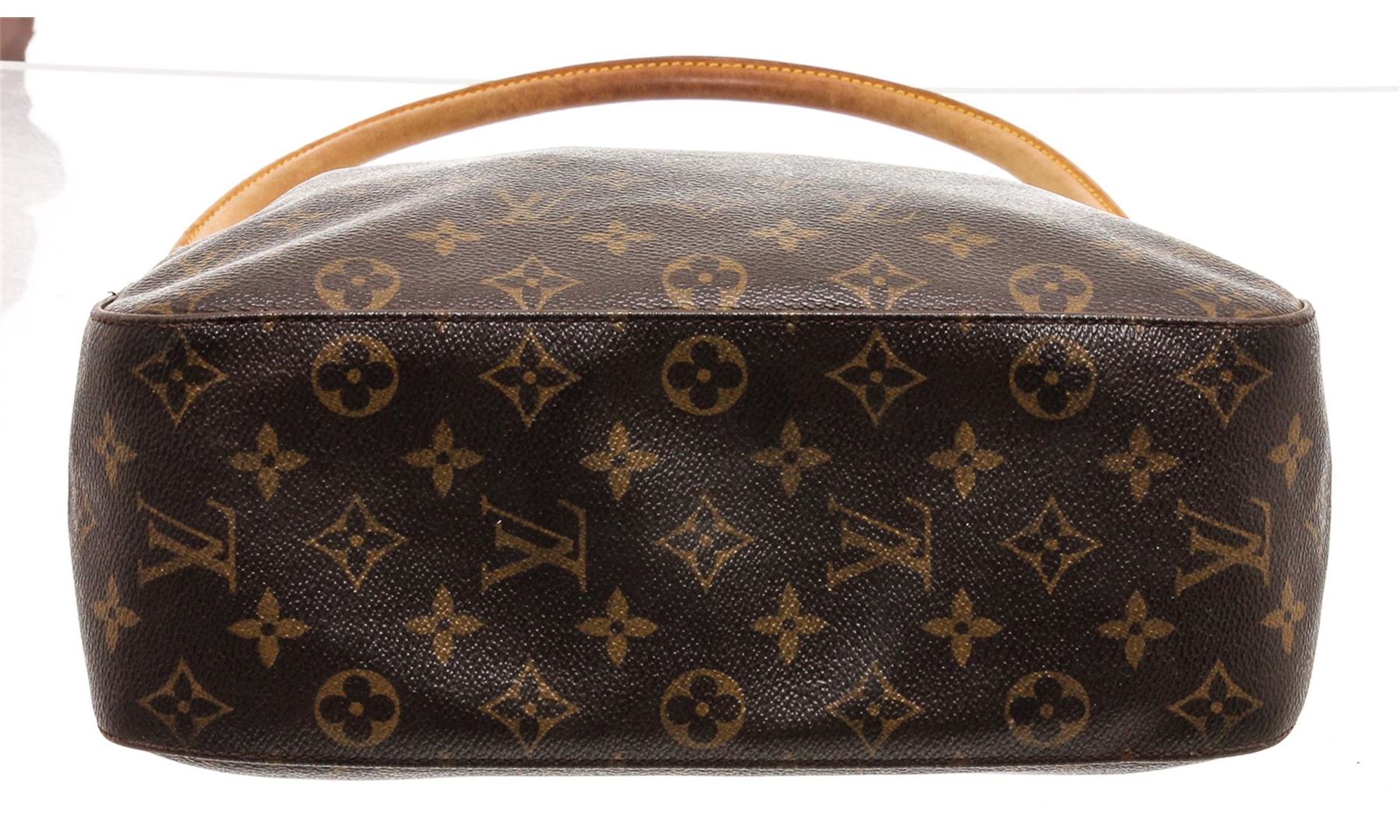 One Louis Vuitton Monogram Canvas Leather Looping GM Shoulder Bag. Brown and tan monogram coated canvas Louis Vuitton Looping GM with brass hardware, cinnamon vachetta leather trim, single rolled shoulder strap, beige Alcantara lining, dual pockets at interior walls; one with zip closure and zip closure at top.
