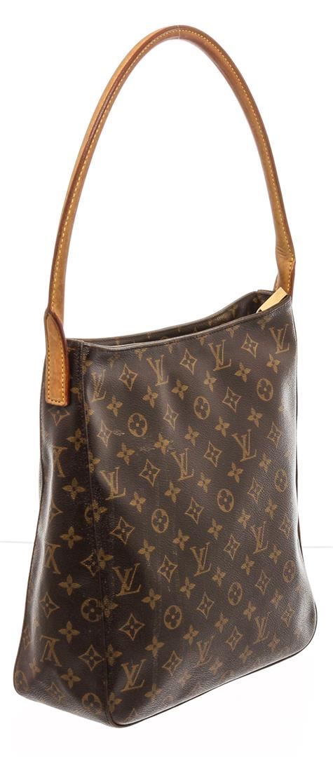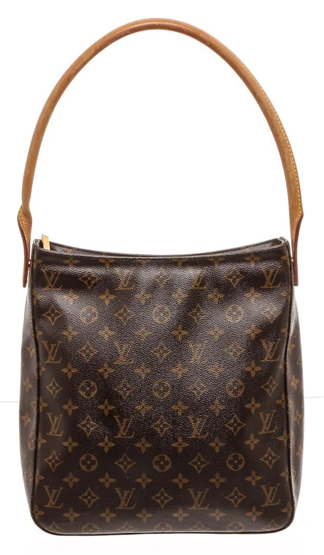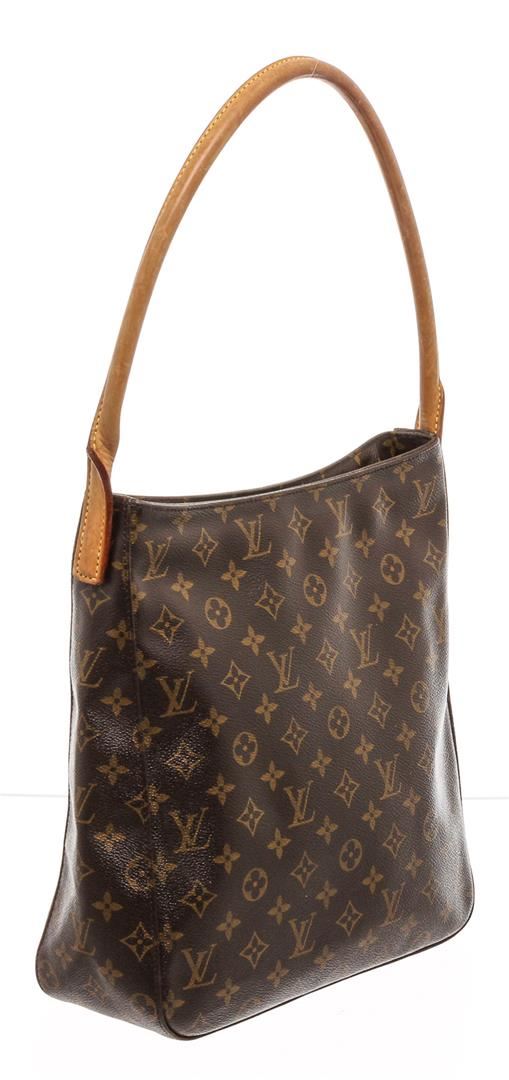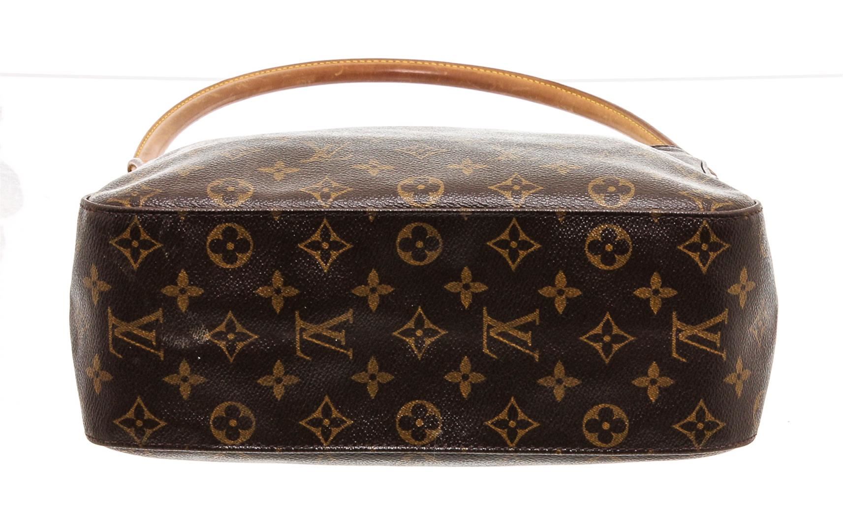 One Louis Vuitton Monogram Canvas Leather Looping GM Shoulder Bag. Brown and tan monogram coated canvas Louis Vuitton Looping GM with brass hardware, cinnamon vachetta leather trim, single rolled shoulder strap, beige Alcantara lining, dual pockets at interior walls; one with zip closure and zip closure at top.