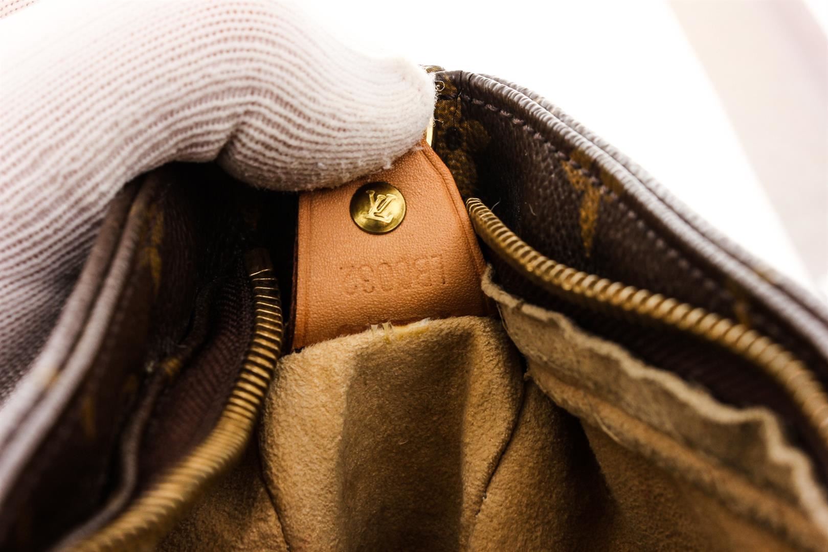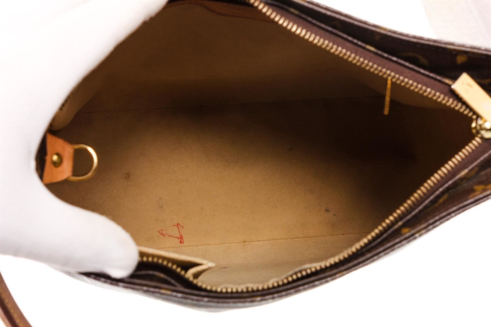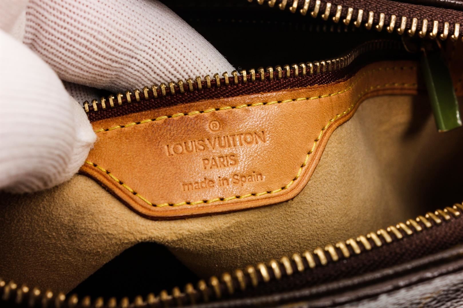 One Louis Vuitton Monogram Canvas Leather Looping GM Shoulder Bag. Brown and tan monogram coated canvas Louis Vuitton Looping GM with brass hardware, cinnamon vachetta leather trim, single rolled shoulder strap, beige Alcantara lining, dual pockets at interior walls; one with zip closure and zip closure at top.