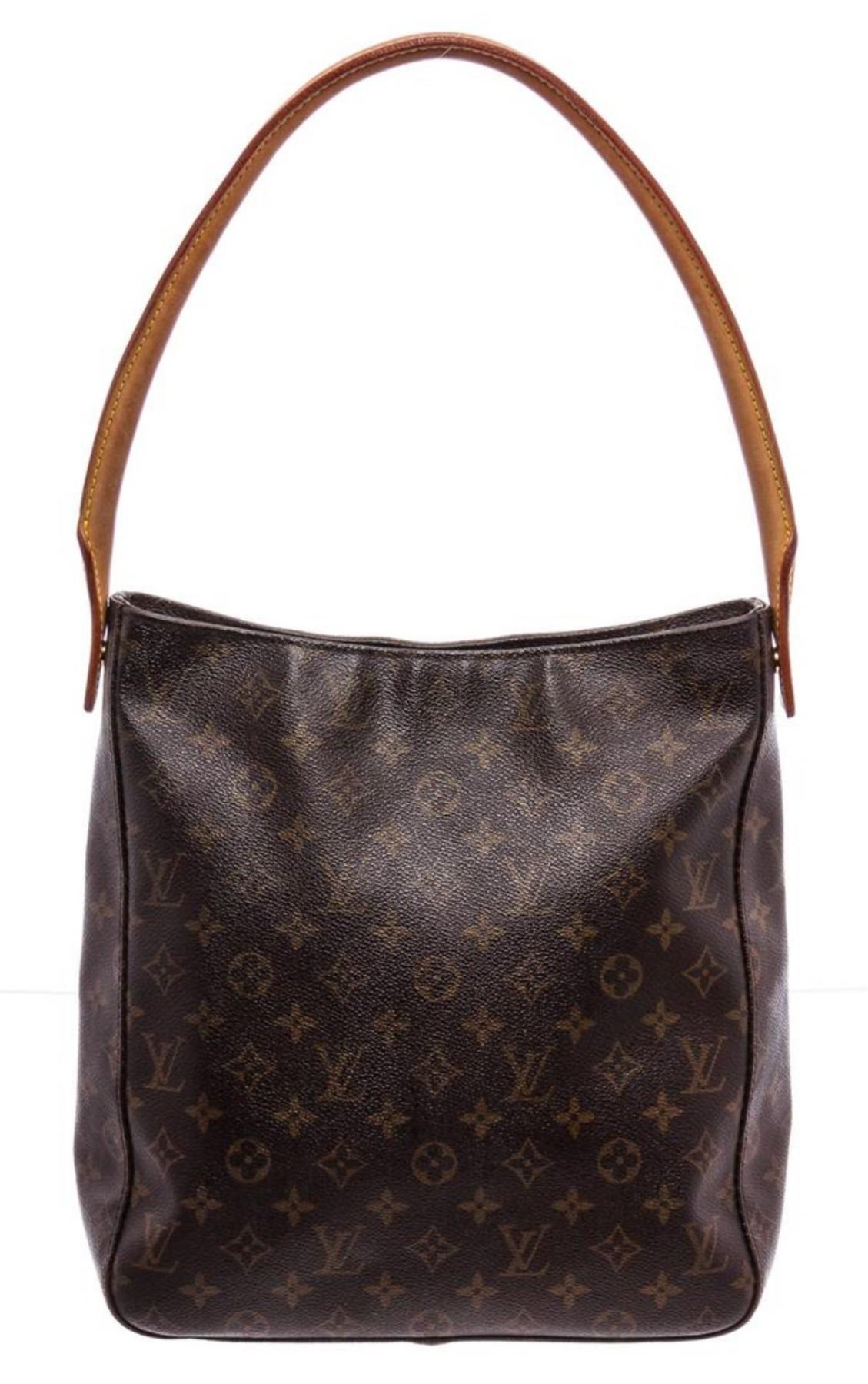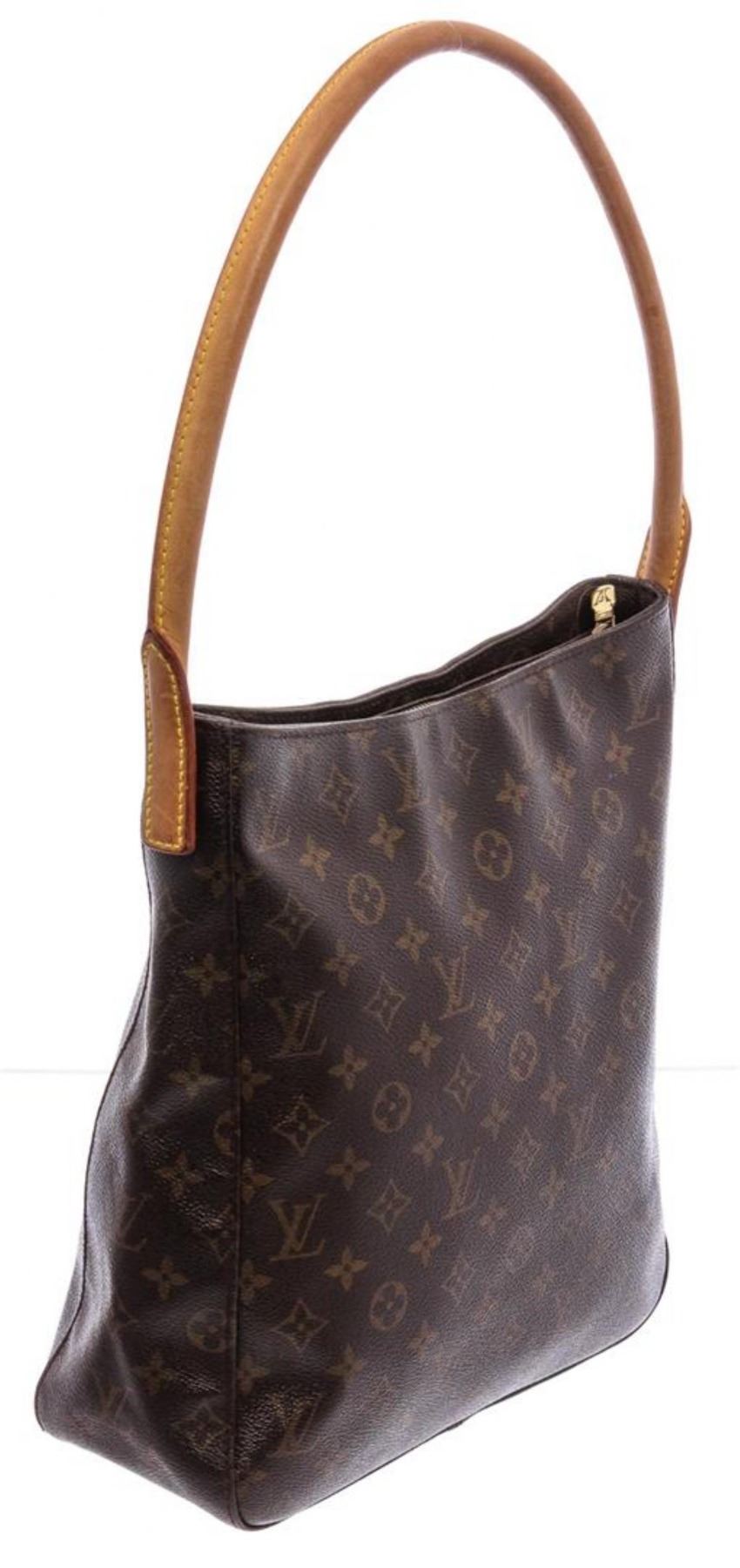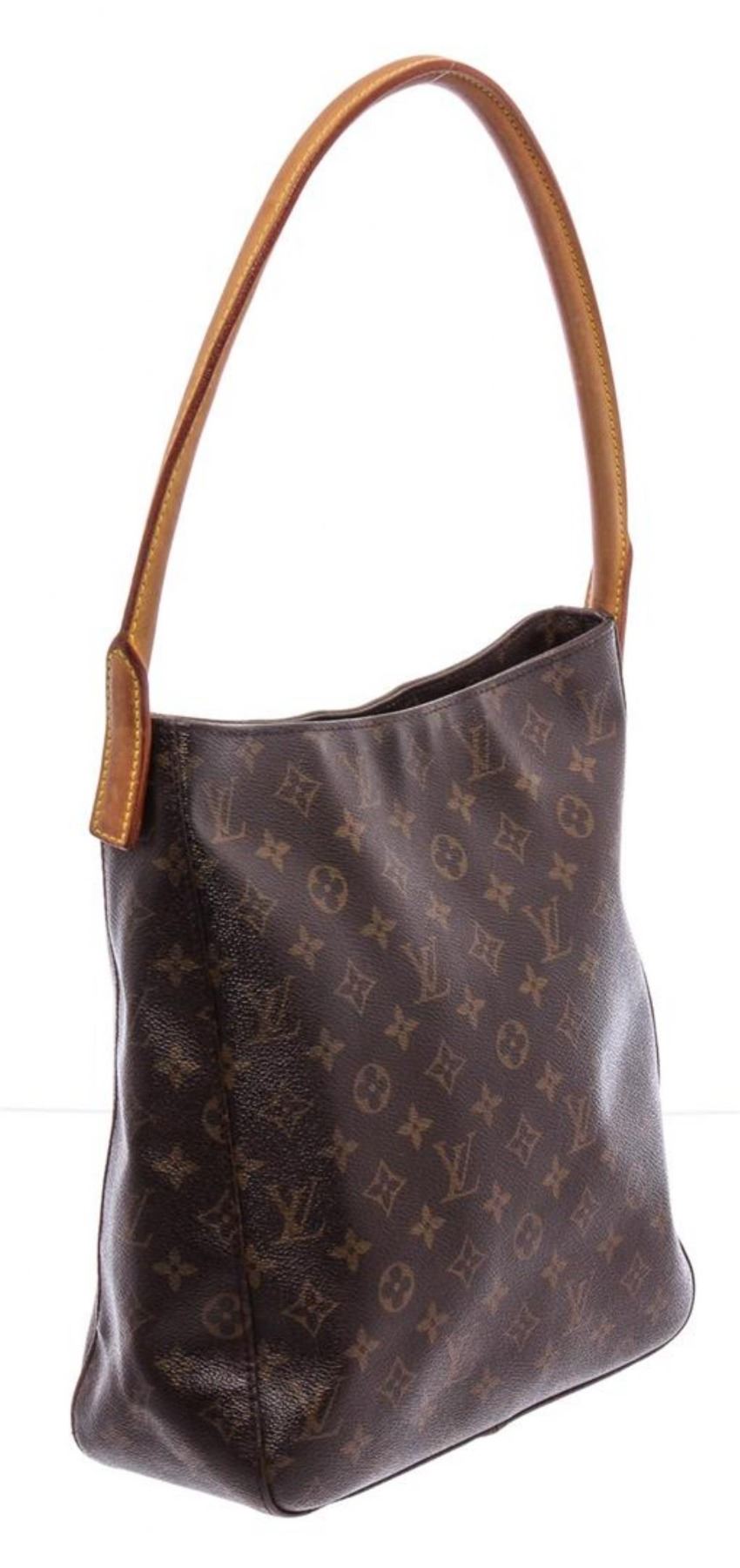One Louis Vuitton Monogram Canvas Leather Looping GM Shoulder Bag. Brown and tan monogram coated canvas Louis Vuitton Looping GM with brass hardware, cinnamon vachetta leather trim, single rolled shoulder strap, beige Alcantara lining, dual pockets at interior walls; one with zip closure and zip closure at top.