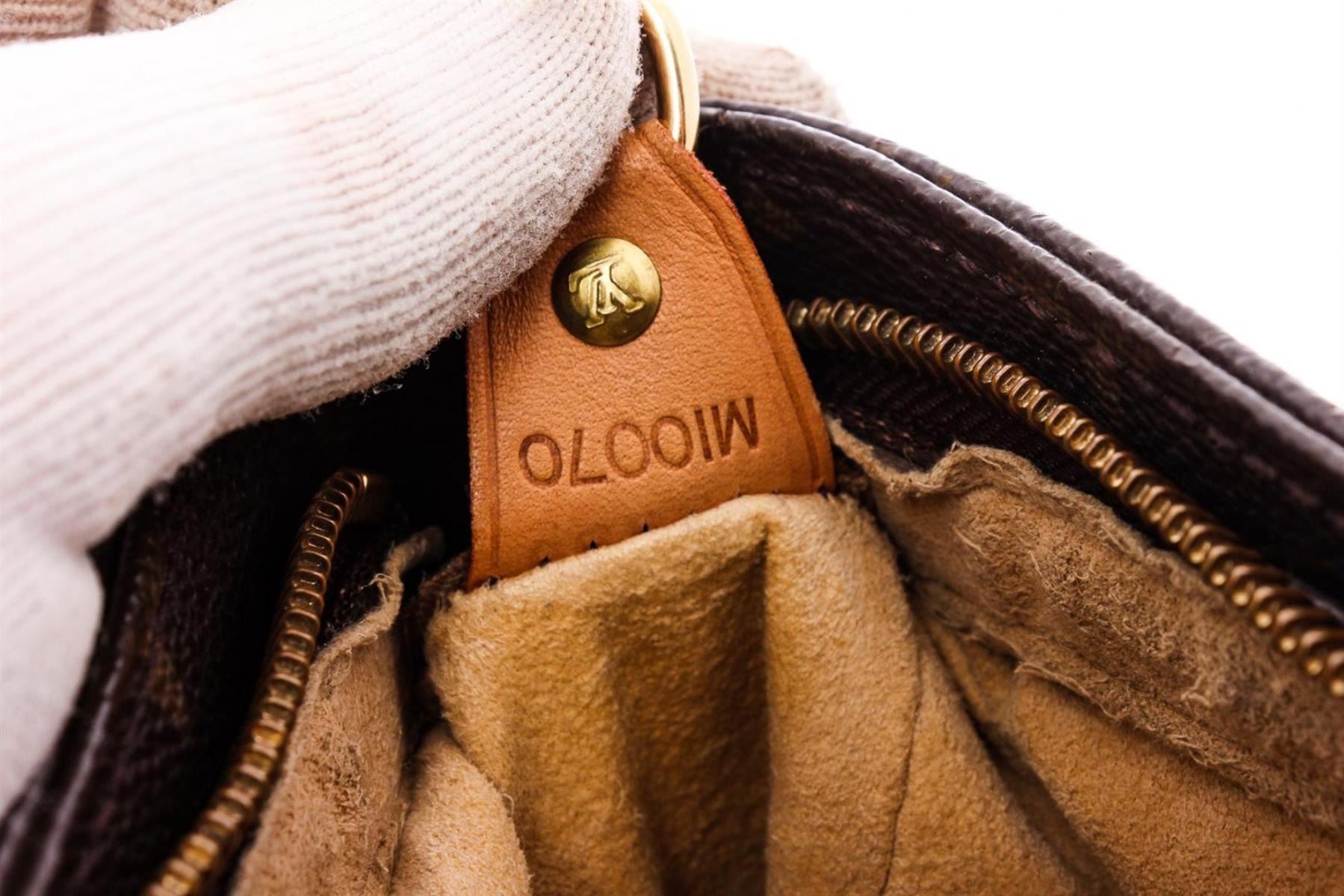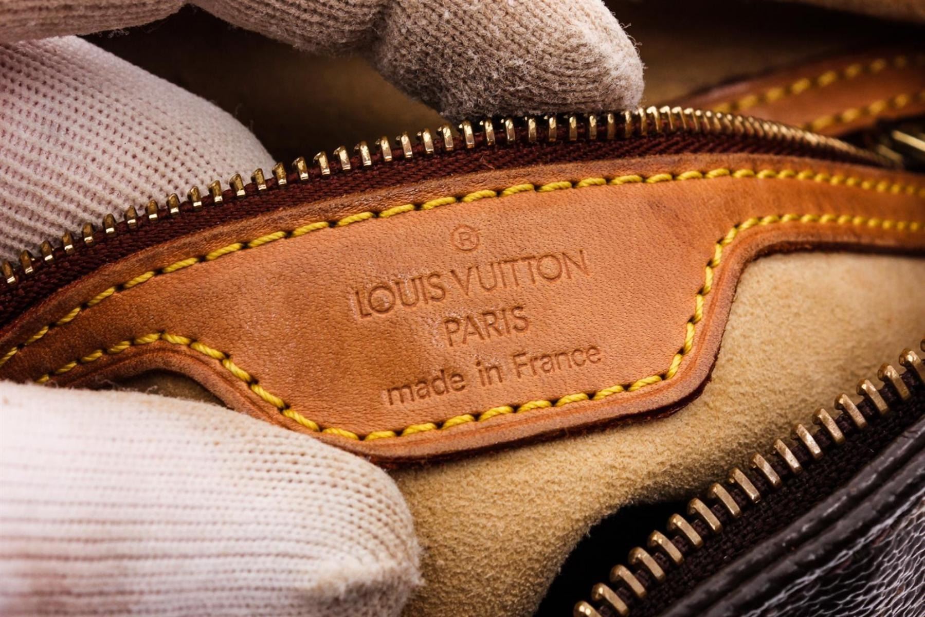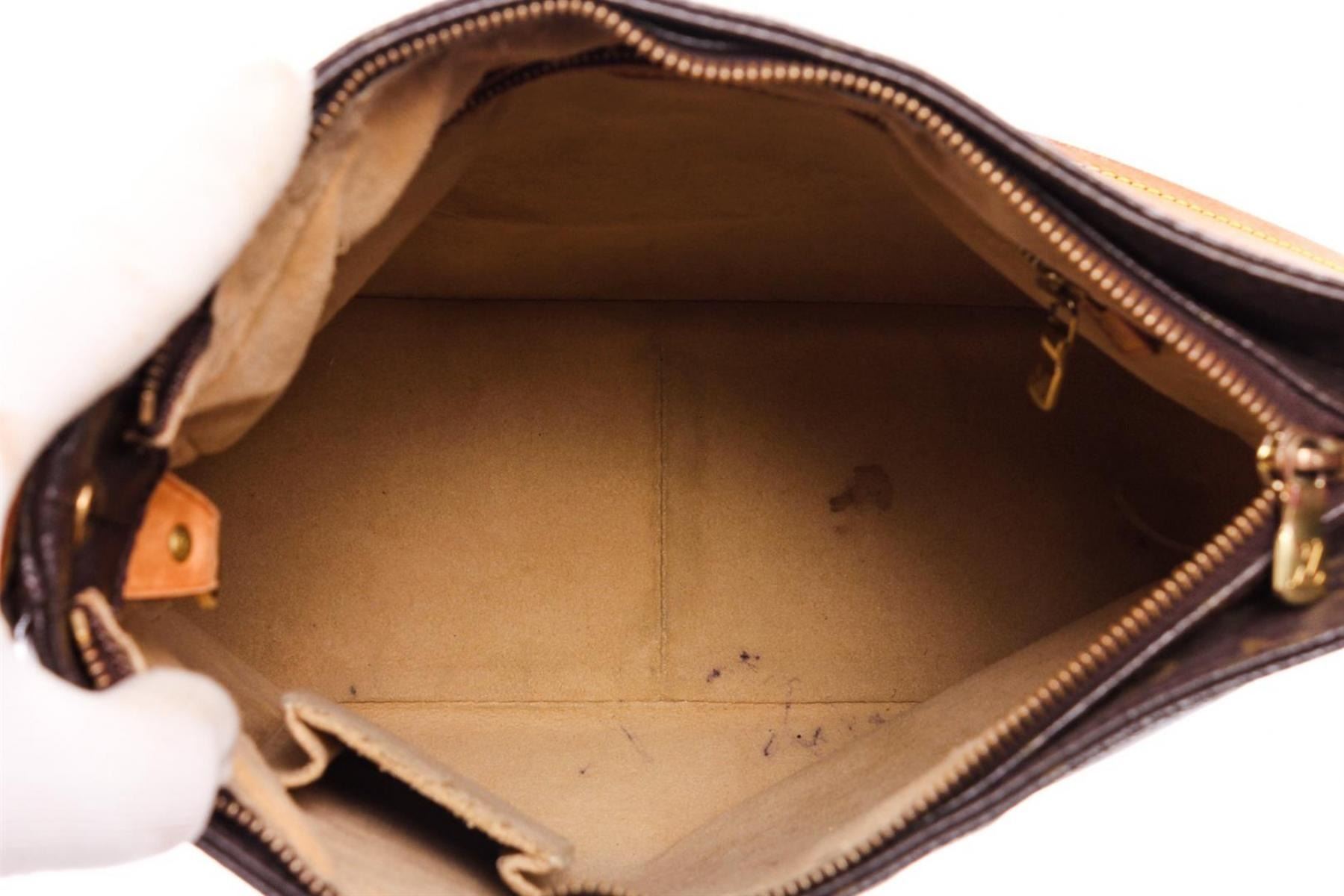One Louis Vuitton Monogram Canvas Leather Looping GM Shoulder Bag. Brown and tan monogram coated canvas Louis Vuitton Looping GM with brass hardware, cinnamon vachetta leather trim, single rolled shoulder strap, beige Alcantara lining, dual pockets at interior walls; one with zip closure and zip closure at top.