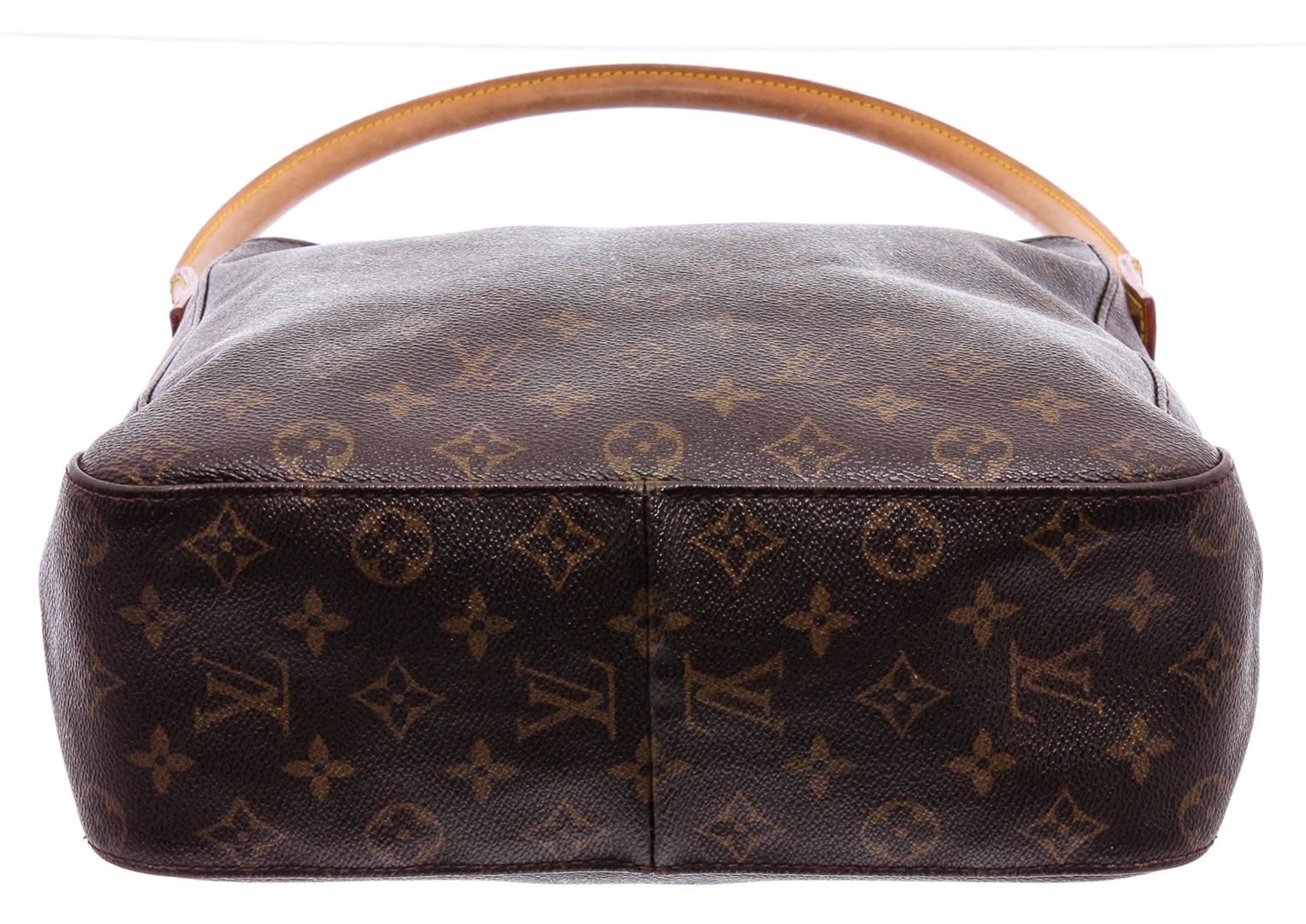 One Louis Vuitton Monogram Canvas Leather Looping GM Shoulder Bag. Brown and tan monogram coated canvas Louis Vuitton Looping GM with brass hardware, cinnamon vachetta leather trim, single rolled shoulder strap, beige Alcantara lining, dual pockets at interior walls; one with zip closure and zip closure at top.
