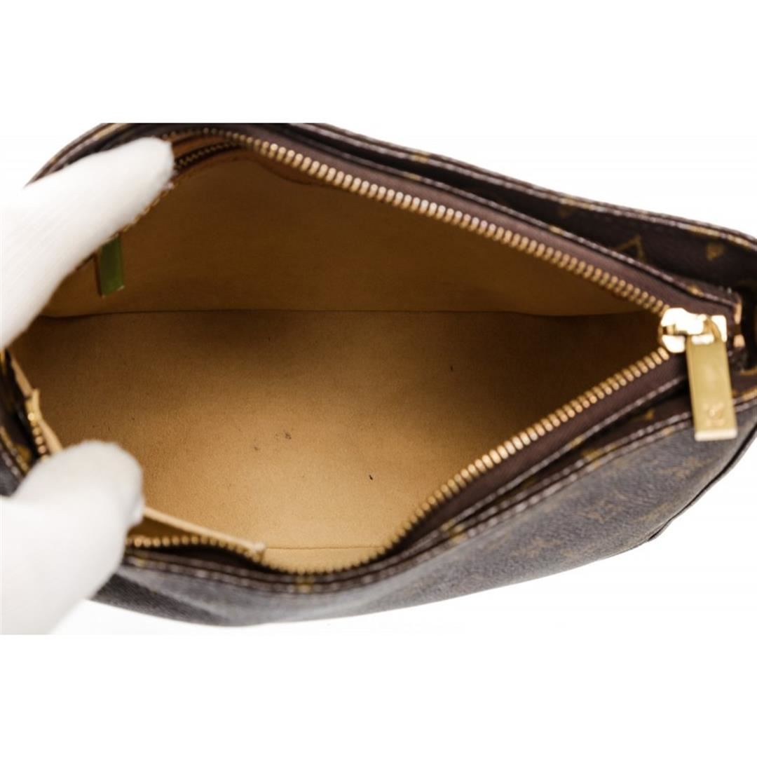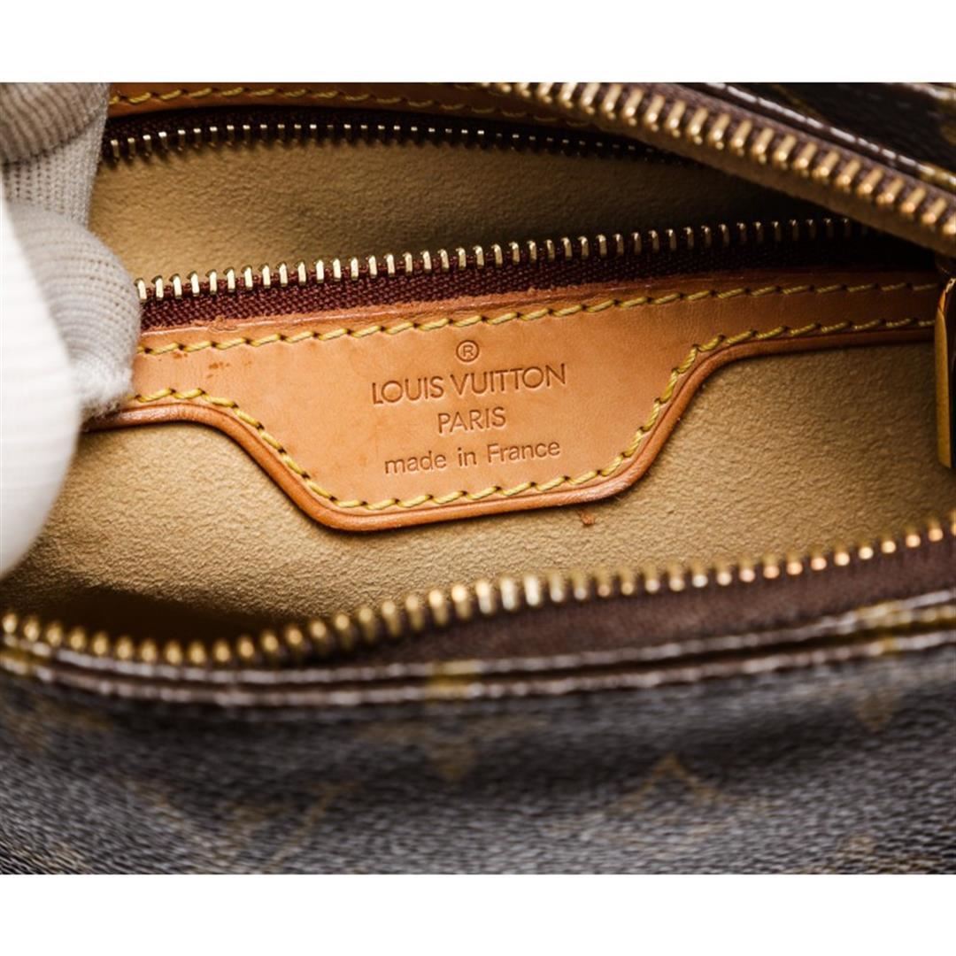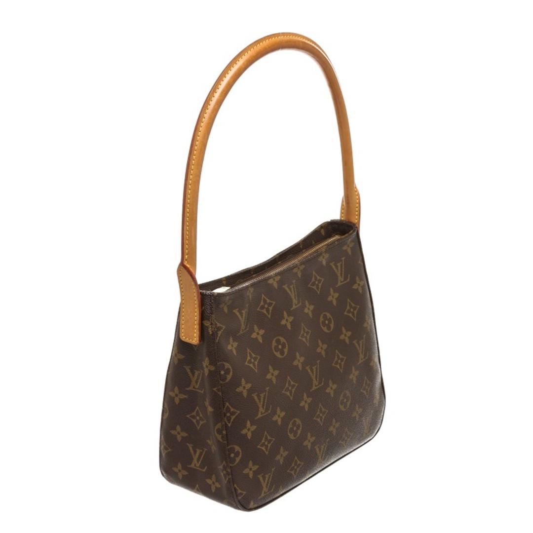 Brown and tan monogram coated canvas Louis Vuitton Looping MM with brass hardware, tan vachetta leather trim, single rolled shoulder strap, creme Alcantara lining, dual pockets at interior wall; one with zip closure and zip closure at top.