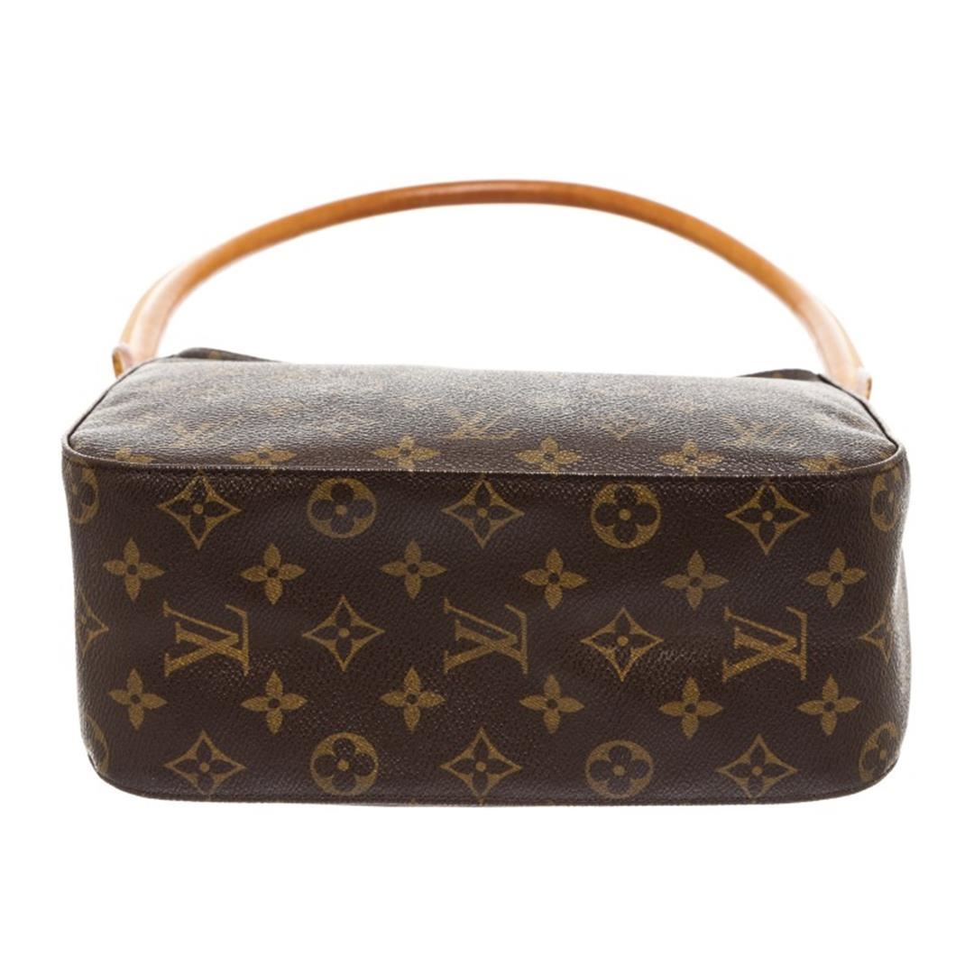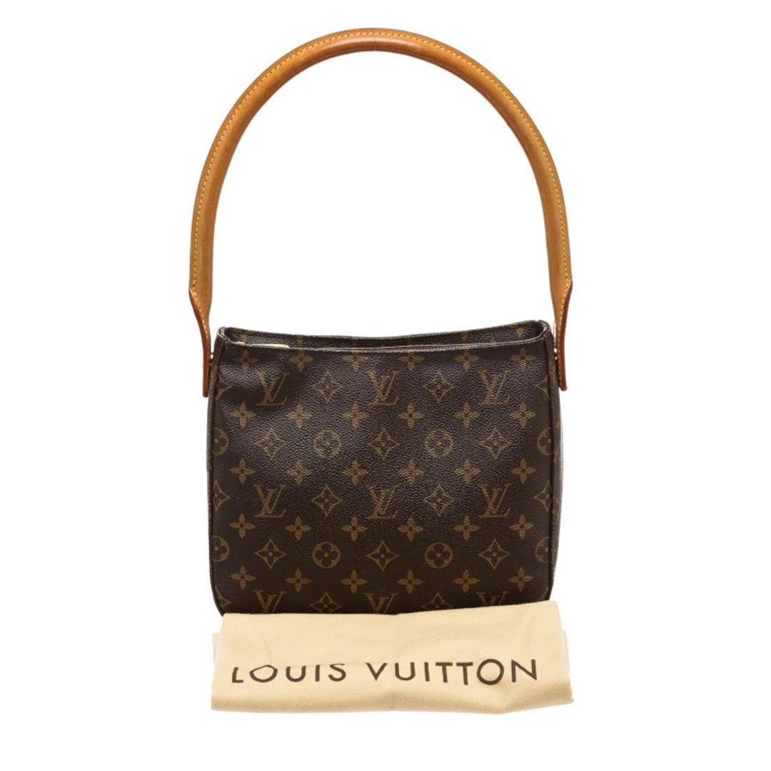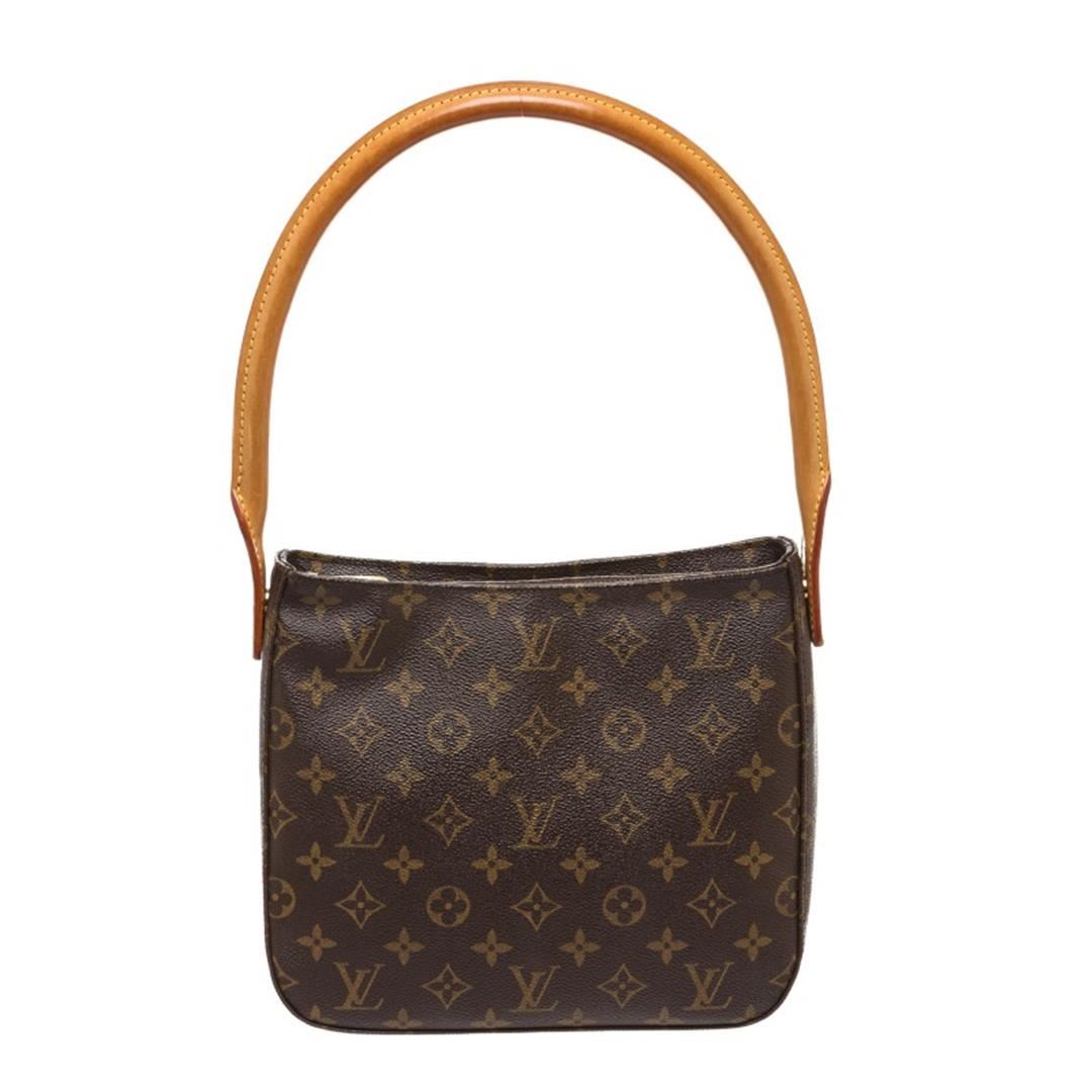 Brown and tan monogram coated canvas Louis Vuitton Looping MM with brass hardware, tan vachetta leather trim, single rolled shoulder strap, creme Alcantara lining, dual pockets at interior wall; one with zip closure and zip closure at top.