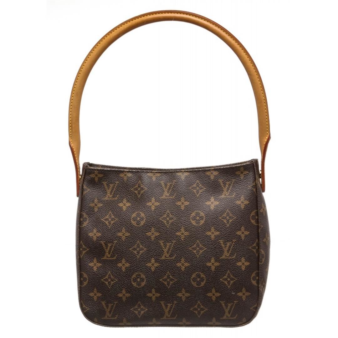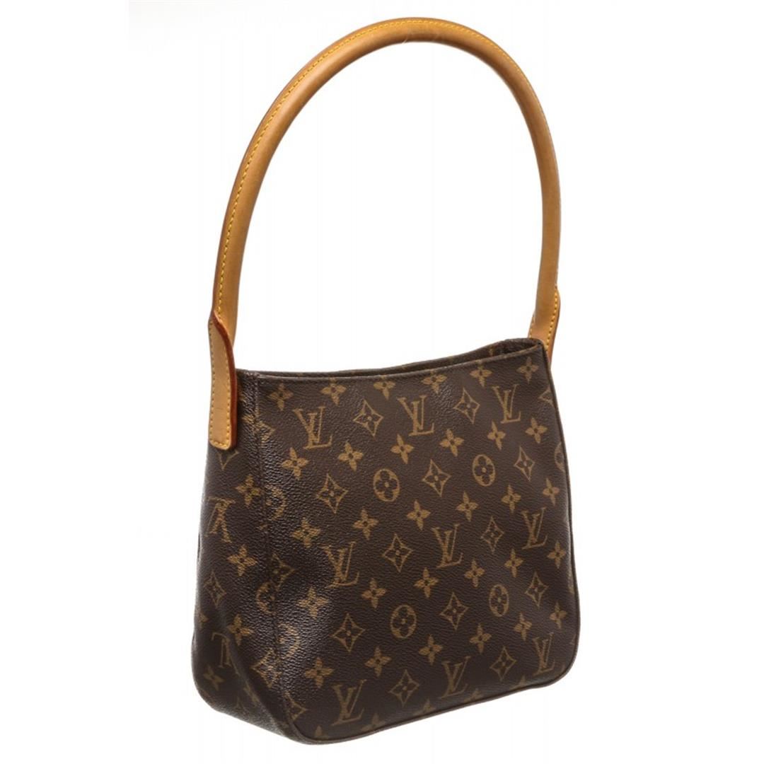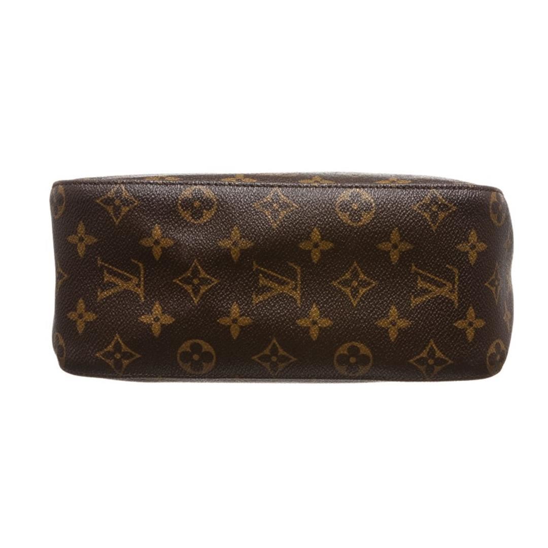 Brown and tan monogram coated canvas Louis Vuitton Looping MM with brass hardware, tan vachetta leather trim, single rolled shoulder strap, creme Alcantara lining, dual pockets at interior wall; one with zip closure and zip closure at top.