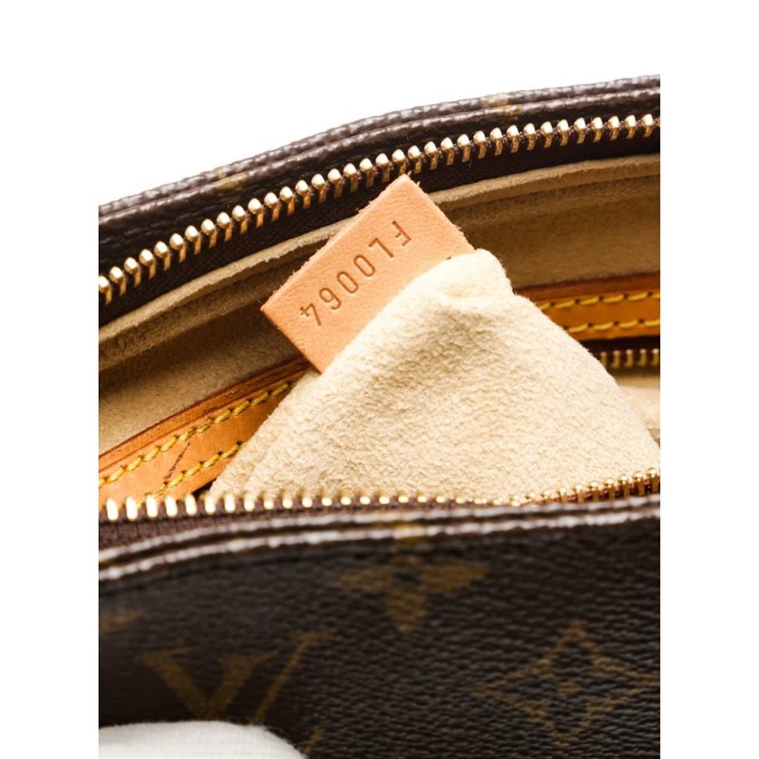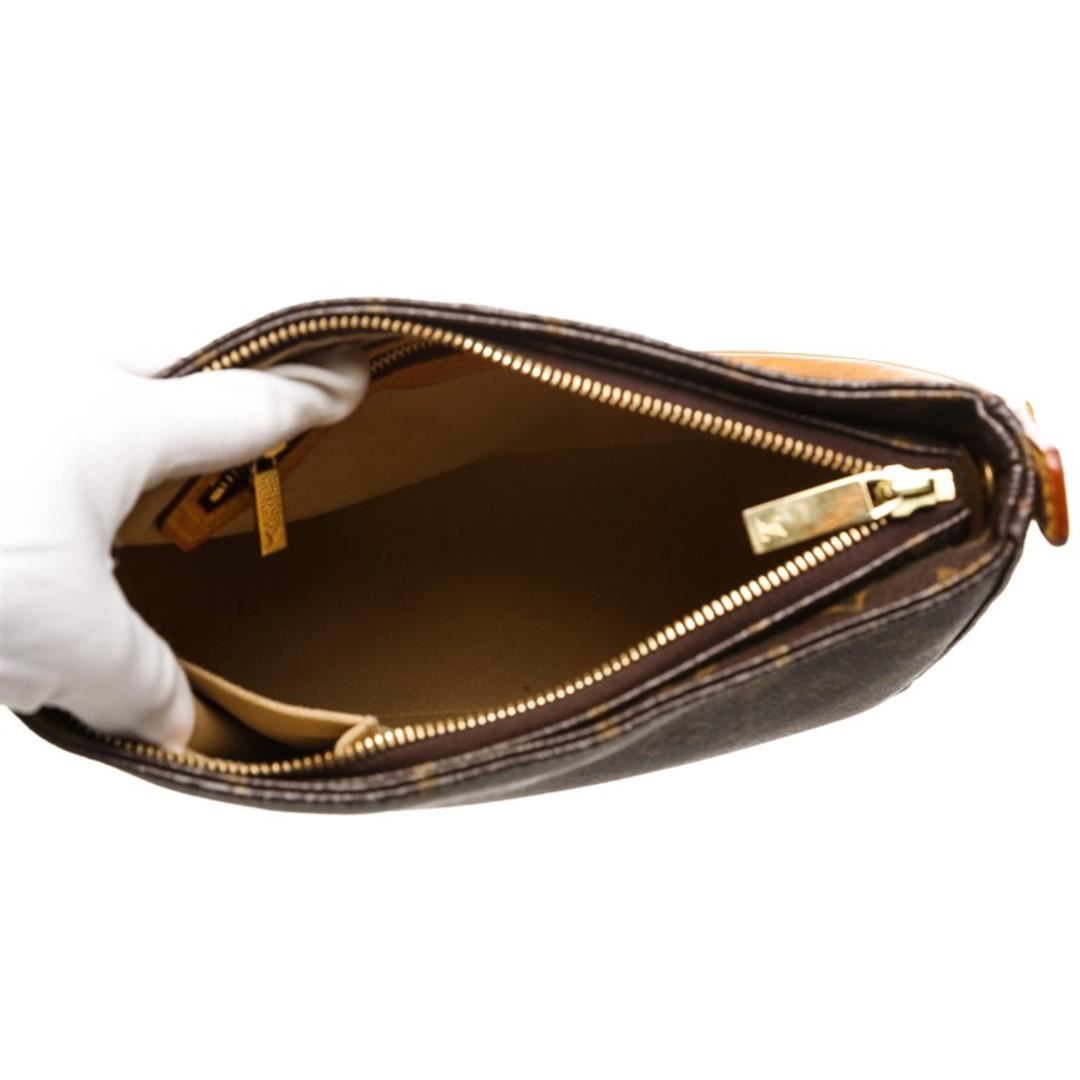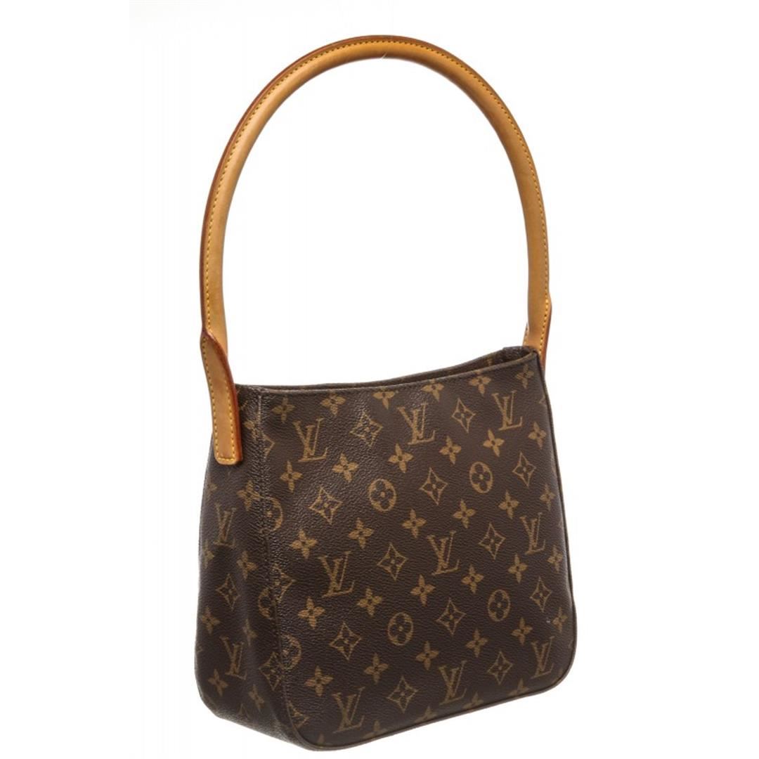 Brown and tan monogram coated canvas Louis Vuitton Looping MM with brass hardware, tan vachetta leather trim, single rolled shoulder strap, creme Alcantara lining, dual pockets at interior wall; one with zip closure and zip closure at top.