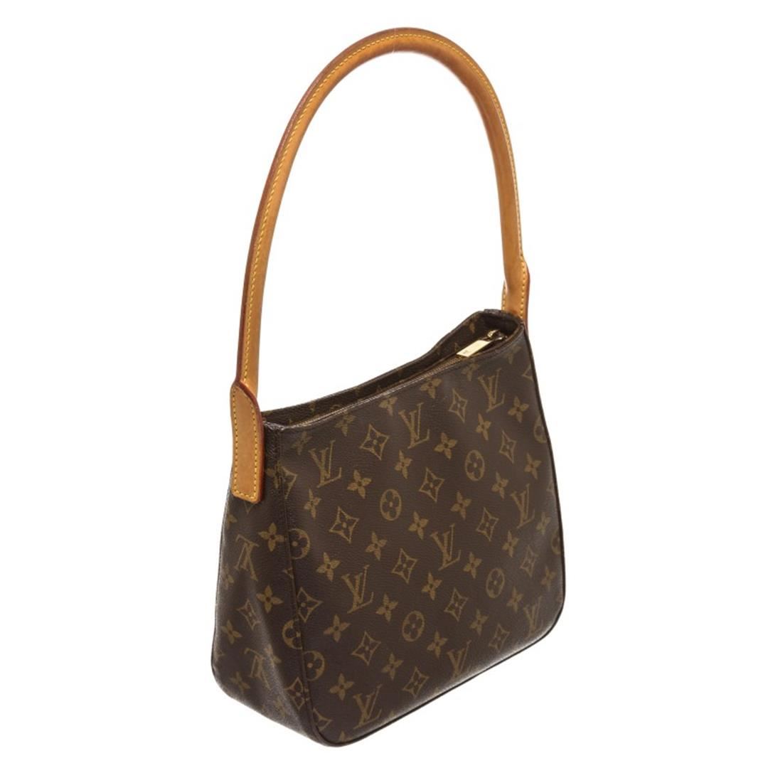 Brown and tan monogram coated canvas Louis Vuitton Looping MM with brass hardware, tan vachetta leather trim, single rolled shoulder strap, creme Alcantara lining, dual pockets at interior wall; one with zip closure and zip closure at top.