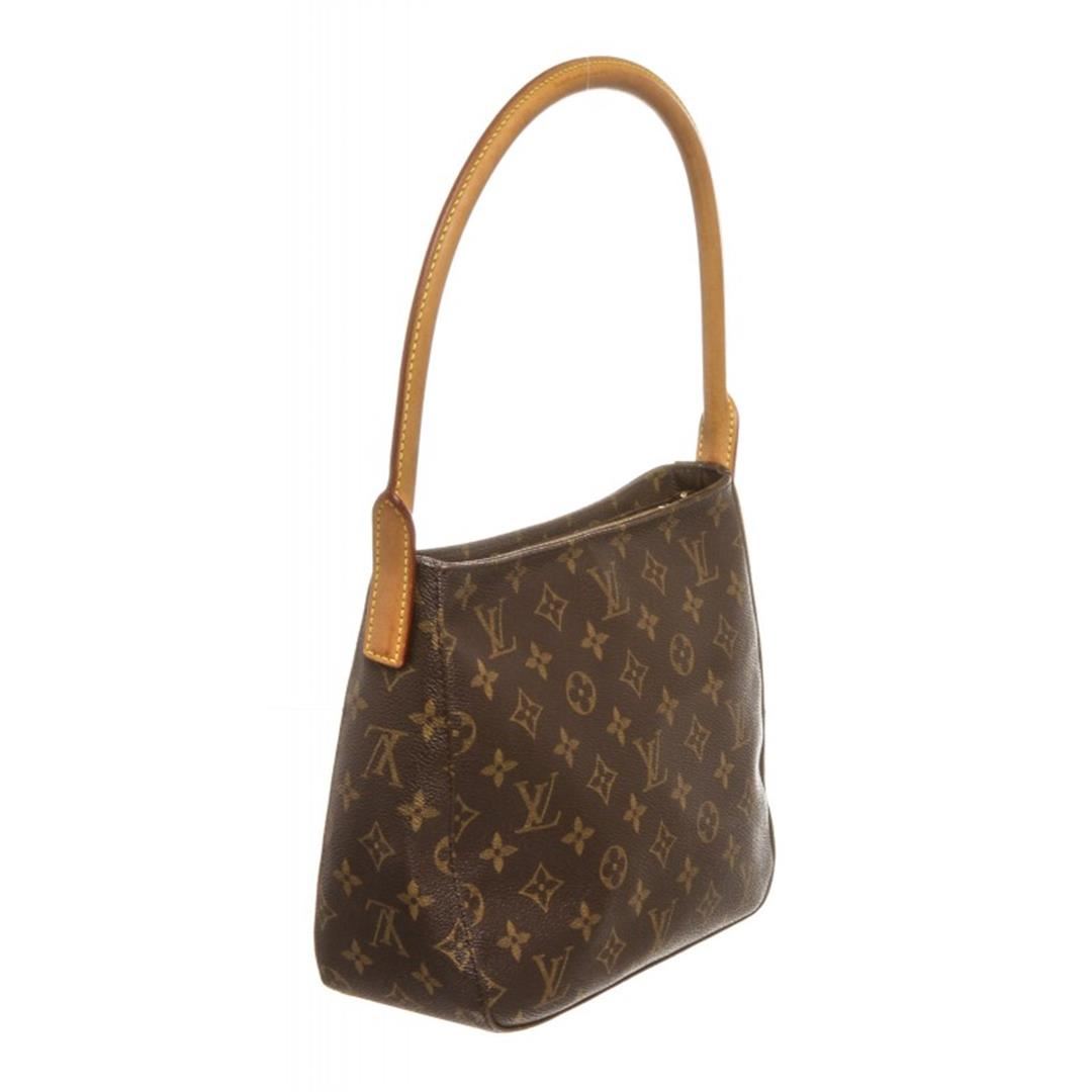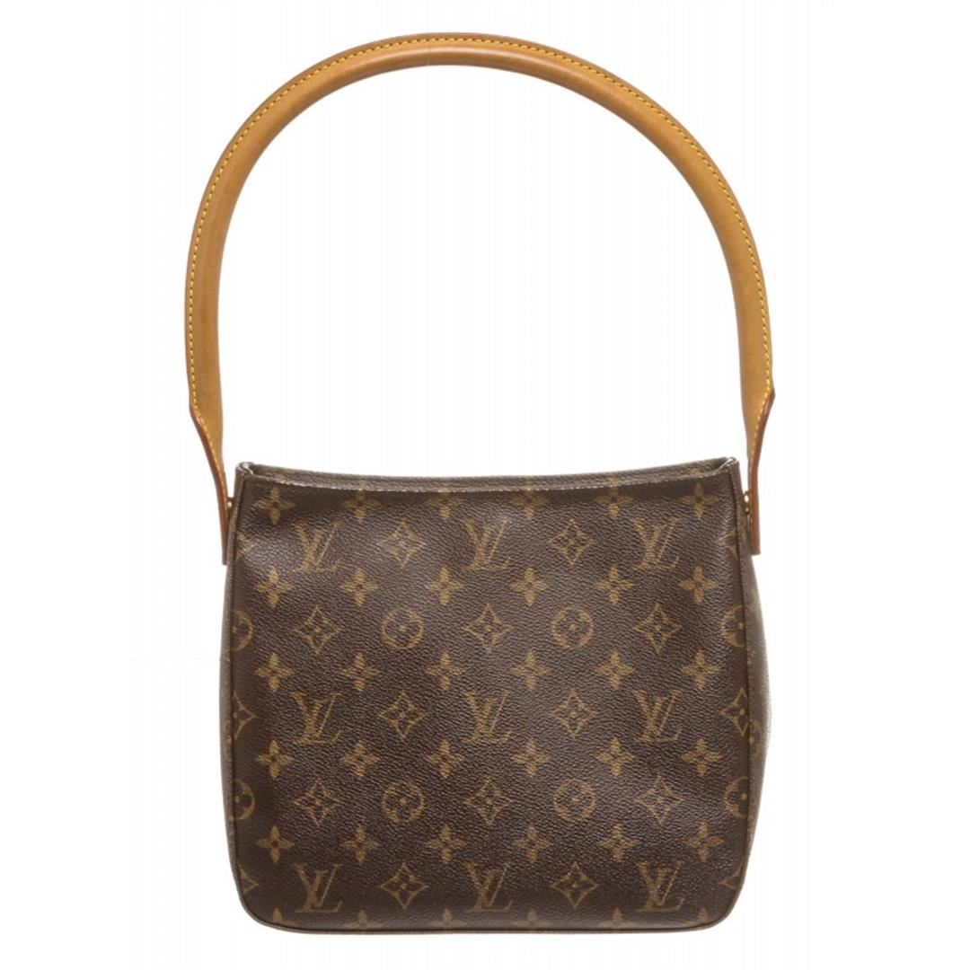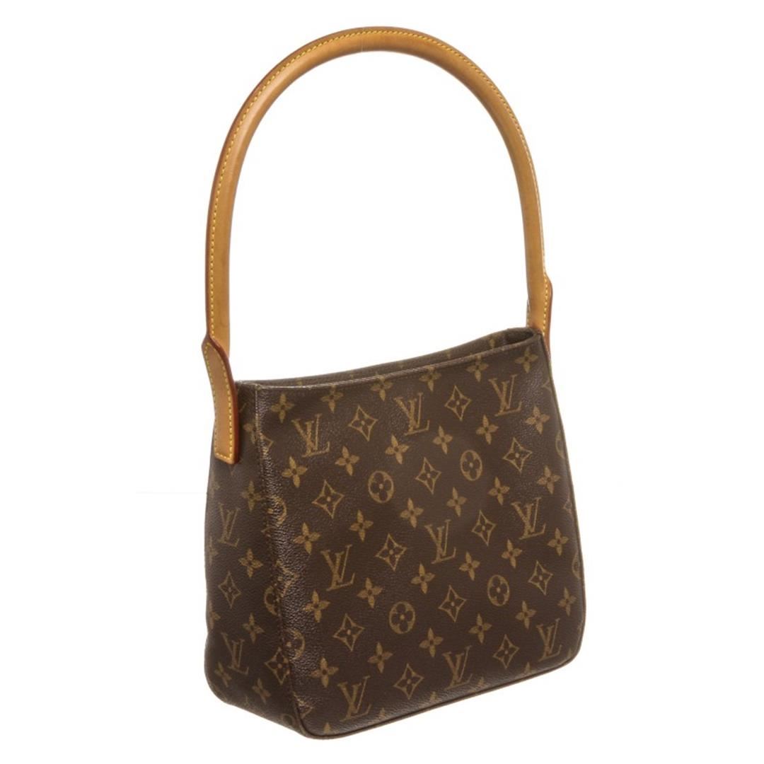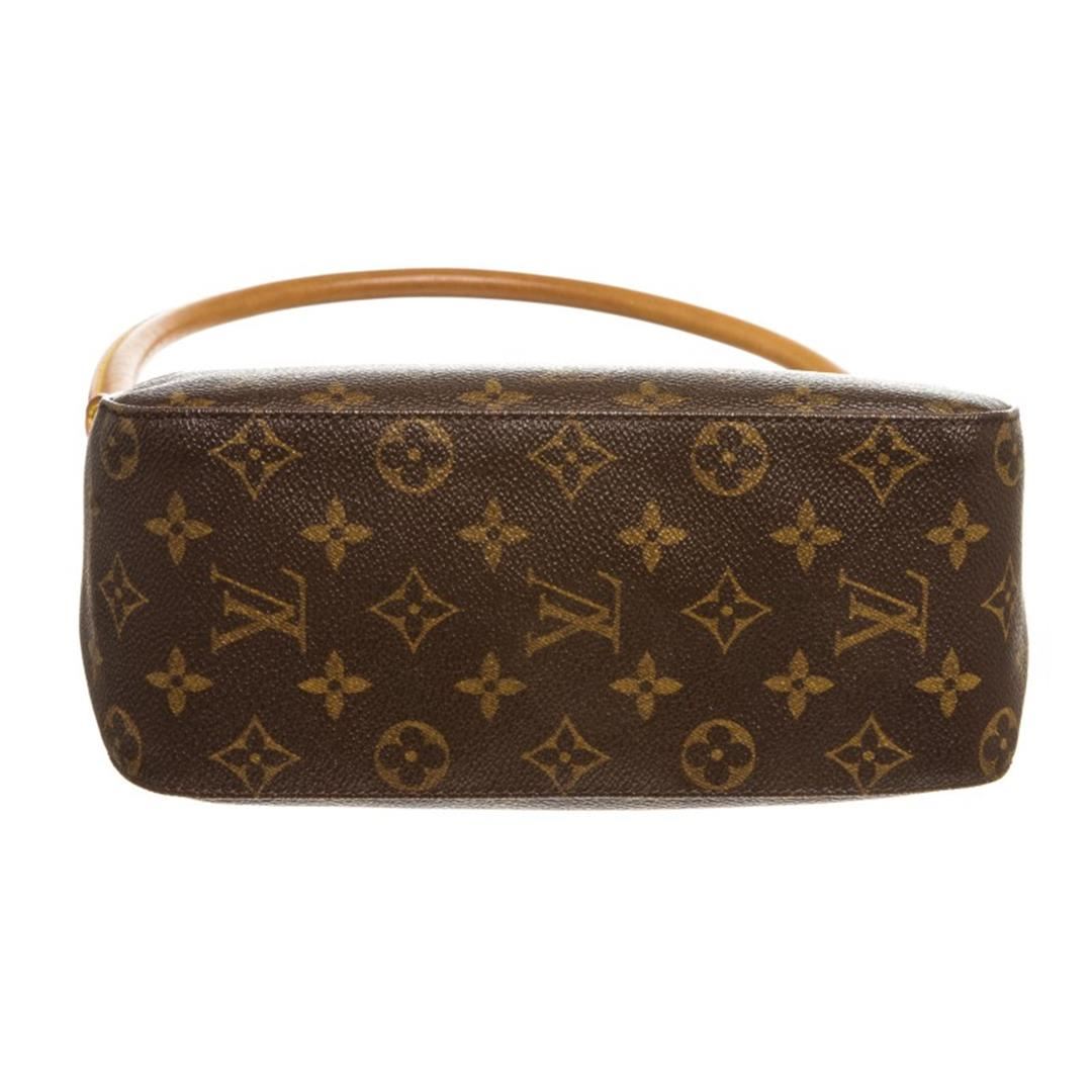Brown and tan monogram coated canvas Louis Vuitton Looping MM with brass hardware, tan vachetta leather trim, single rolled shoulder strap, creme Alcantara lining, dual pockets at interior wall; one with zip closure and zip closure at top.