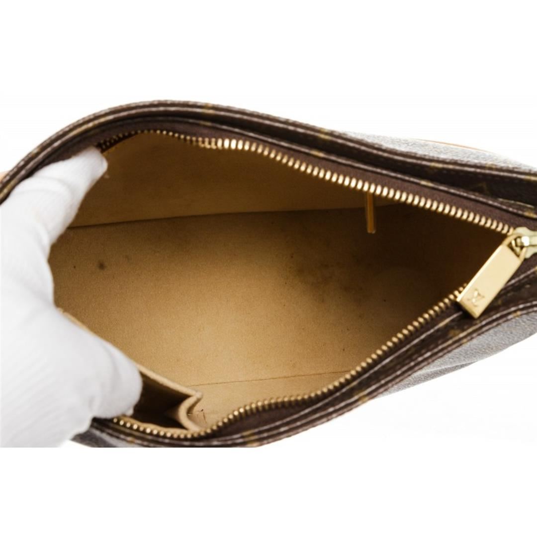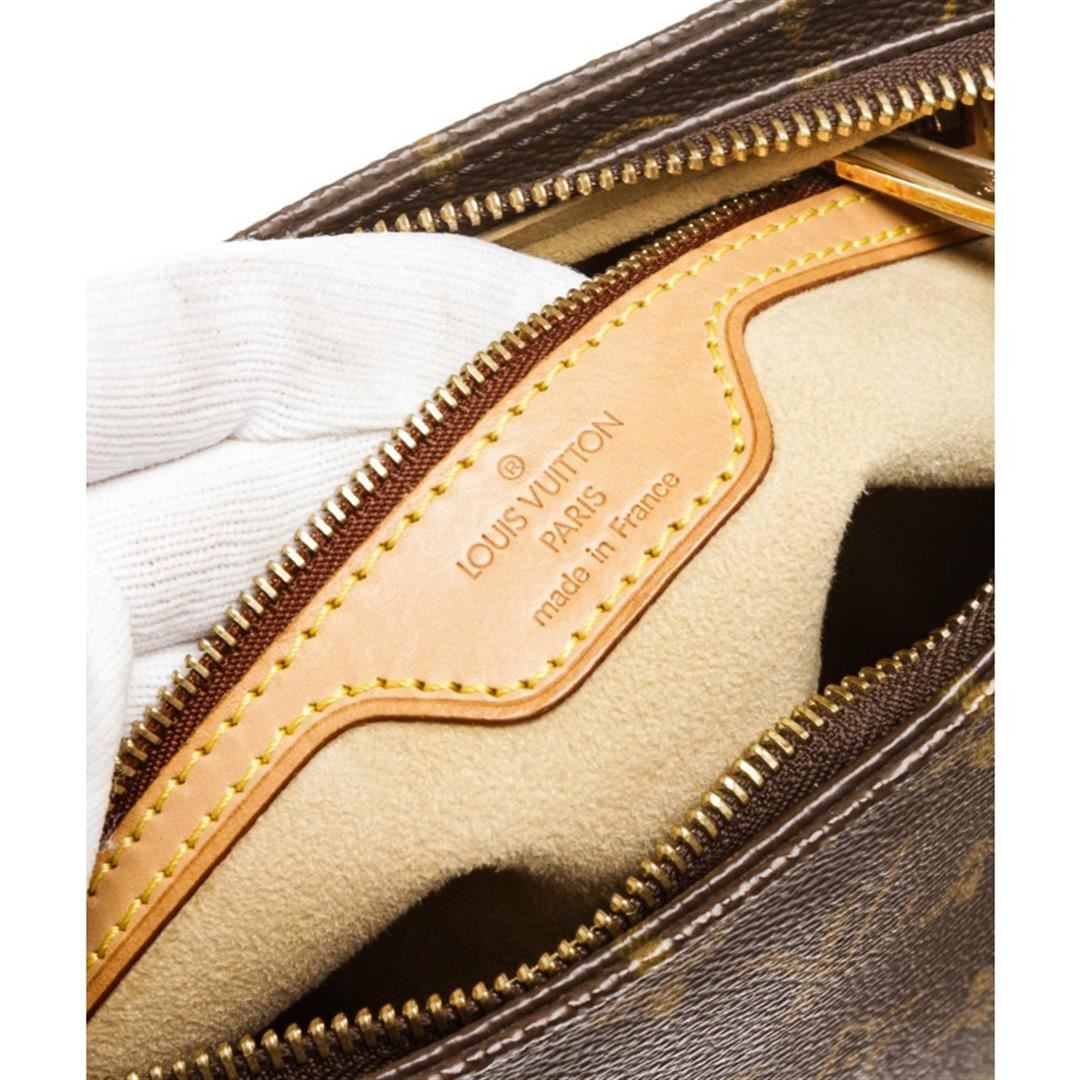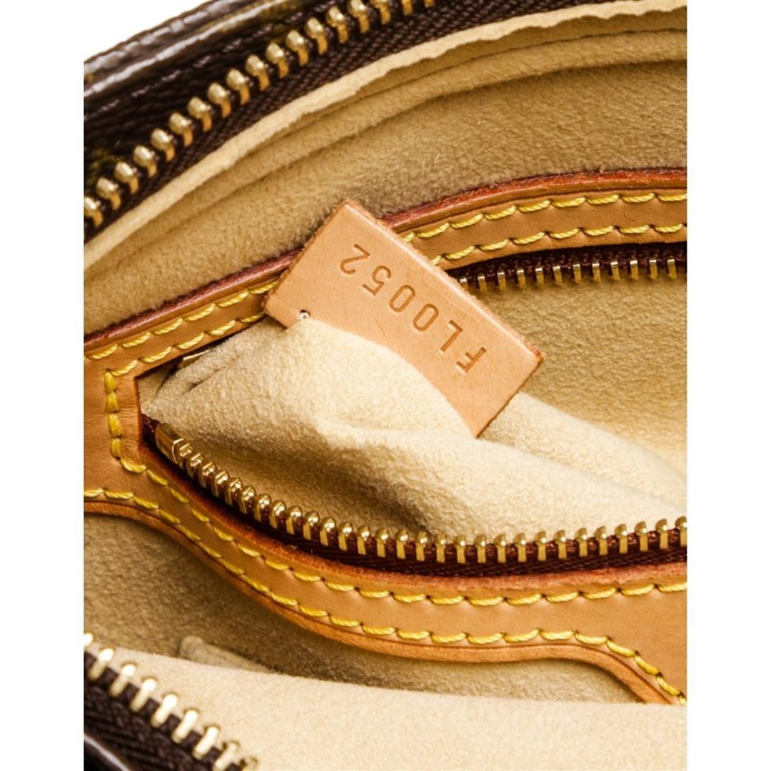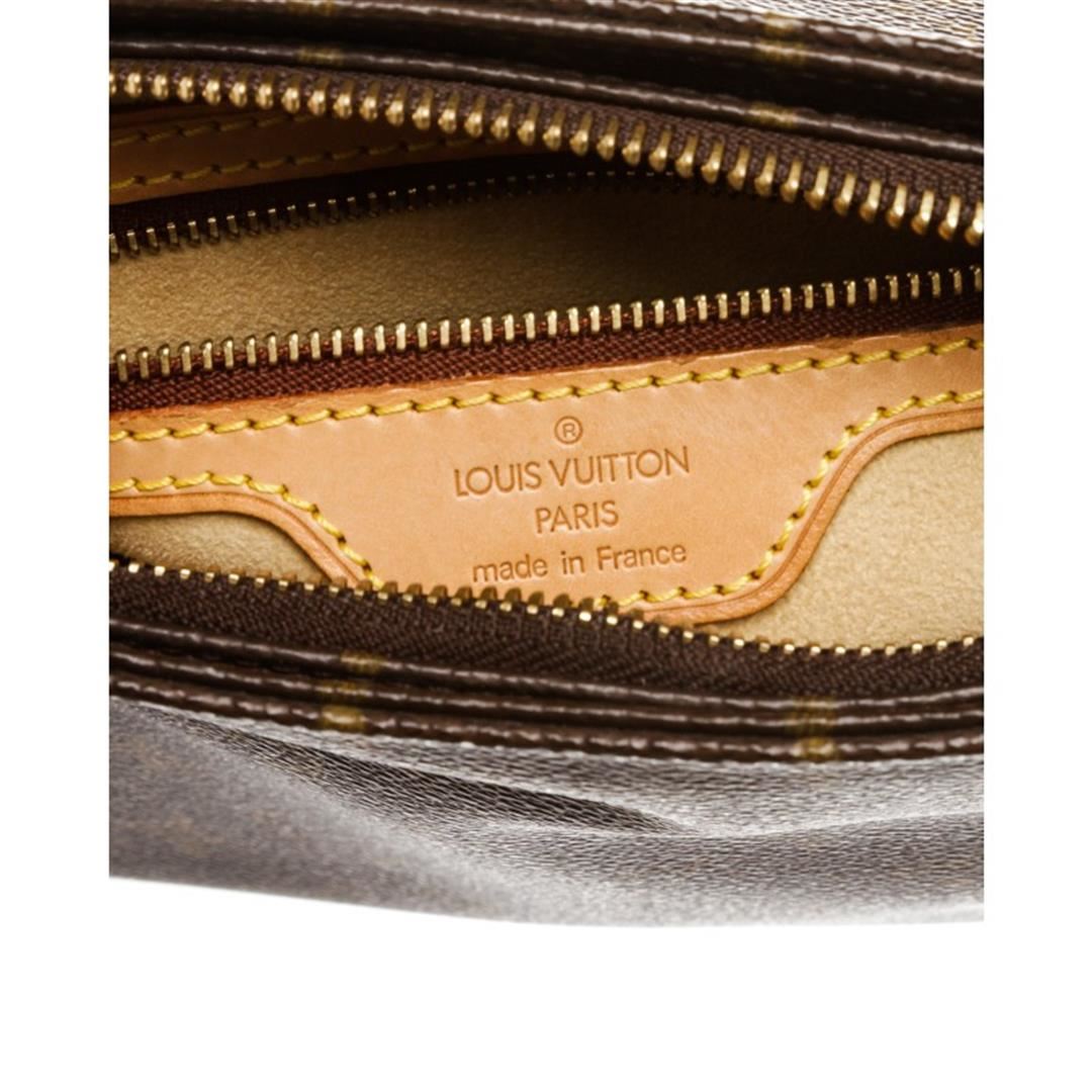 Brown and tan monogram coated canvas Louis Vuitton Looping MM with brass hardware, tan vachetta leather trim, single rolled shoulder strap, creme Alcantara lining, dual pockets at interior wall; one with zip closure and zip closure at top.